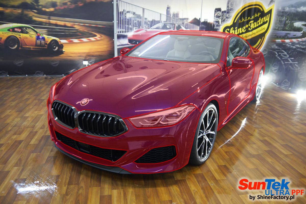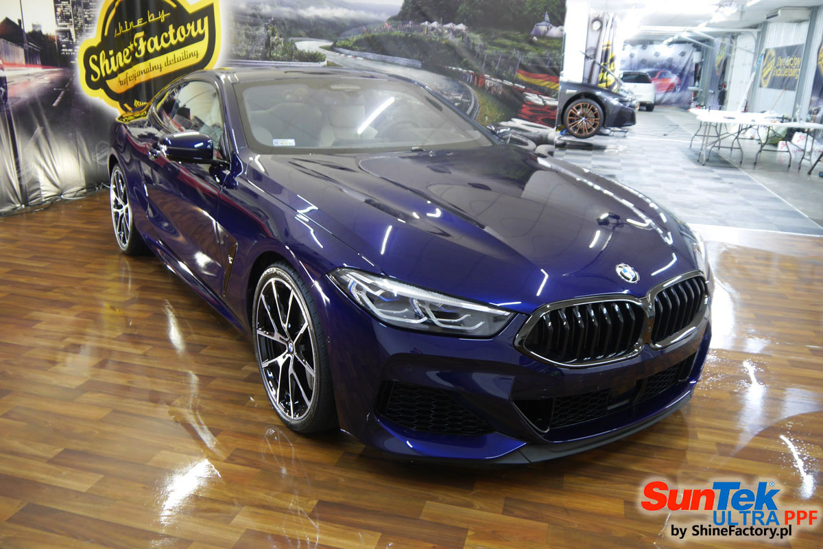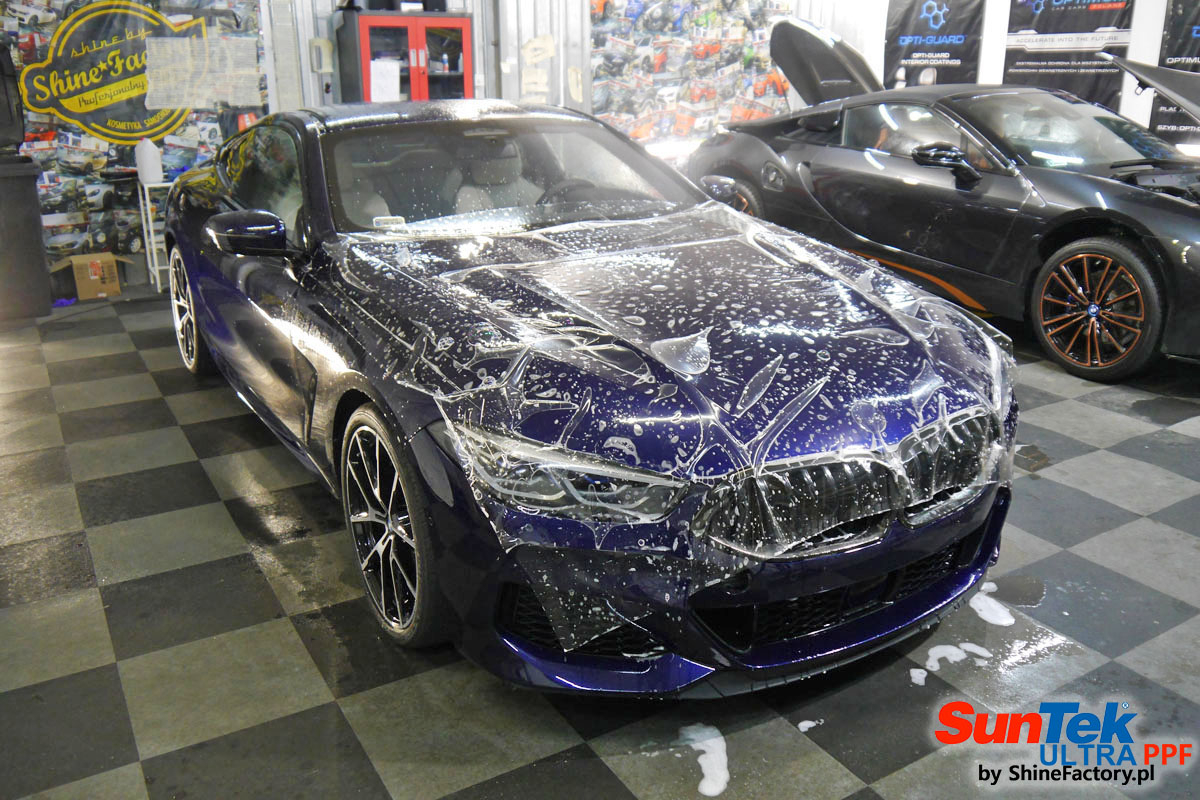 Zabezpieczenie frontów aut bezbarwnymi foliami ochronnymi staje się powoli standardem, coraz częściej także zabezpieczane w ten sposób są auta w całości co daje do tego czasu nieosiągalne perfekcyjne zabezpieczenie i efekt wizualny. Tym razem mieliśmy przyjemność zająć się nowym BMW 8 coupe. Decyzja wz. z zabezpieczeniem padła na bezkompromisowe połączanie znakomitych bezbarwnych folii ochronnych SunTek Ultra PPF z 10 letnią gwarancją oraz pakietu powłok ceramicznych. Standardowo prace zaczęliśmy od bardzo dokładnego oczyszczenia nadwozia z wszelkich naleciałości. Kolejno zajęliśmy się inspekcją lakieru i skorygowaniem oraz doprowadzeniem go do możliwej perfekcji z defektów posalonowych / potransportowych. Po przygotowaniu przeszliśmy do zabezpieczenia każdego cm auta, najpierw aplikując bezbarwne folie ochronne. Folie zazwyczaj aplikuje się na najbardziej narażone el. auta jak przód, tym razem zdecydowaliśmy się praktycznie całe auto pokryć najlepszymi na świecie regeneracyjnymi foliami SunTek Ultra aby uzyskać 100% ochronę lakieru, który będzie całkowicie izolowany od środowiska zewnętrznego i nic nie będzie wstanie go uszkodzić. Po aplikacji folii przeszliśmy do zabezpieczania wszelkich el. auta powłokami, zaaplikowaliśmy pakiet powłok na całe auto, folie, szyby (Gtechniq G1), felgi (DLUX), elementy nielakierowane, a także całe wnętrze wraz z zaimpregnowaniem delikatnych skór. Po kilkudziesięciu godzinach pracy BMW nabrało perfekcyjnego wyglądu, połysku oraz co najważniejsze najmocniejszej praktycznie pancernej ochrony na lata. Zapraszamy do szerokiej fotorelacji! Oklejone zostało praktycznie całe auto w celu ochrony przed wszelkimi uszkodzeniami jak np. odpryski od kamieni, piaskowanie od żwiru drogowego, mocniejszymi rysami, obiciami czy nawet drobnymi obcierkami parkingowymi. Dokładnie oklejone zostały: - Maska (z jednego kawałka folii) - Zderzak przedni - Klosze lamp - Błotniki przednie - Drzwi - Błotniki tylne ze słupkami - el. pianoblack - Progi - Zderzak tylny - Dach - Lusterka Zapraszamy do zdjęć z prac i efekt końcowego, jak widać folia posiada bardzo duży połysk i przejrzystość dzięki czemu jest praktycznie nie zauważalna