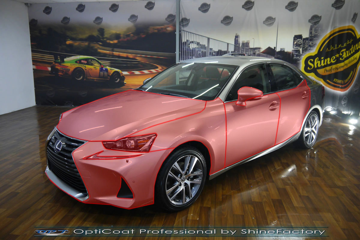 Połączenie bezbarwnych samo-regeneracyjnych folii oraz powłok ceramicznych staje się powoli standardem w idealnym zabezpieczeniu nowego auta. Tym razem mieliśmy przyjemność zająć się nowym Lexus'em IS. Auto zostało przez nas maksymalnie zabezpieczone przed wszystkimi możliwymi uszkodzeniami. Wykorzystane do tego zostały najlepsze na rynku bezbarwne folie ochronne SunTek Ultra PPF oraz natryskowa ceramika OptiCoat PRO. Oczywiście prace rozpoczęliśmy od dokładnego oczyszczenia całego nadwozia z naleciałości oraz delikatnej korekty lakieru w celu usunięcia potransporotwych i posalonowych niedoskonałości. Następnie przystąpiliśmy do aplikacji bezbarwnych folii ochronnych na najbardziej narażone na mocne uszkodzenia el. auta, oczywiście zdecydowaliśmy się jak zawsze wybrać produkt bezkonkurencyjny i nowoczesny na rynku, czyli folie regeneracyjne SunTek Ultra PPF. Po aplikacji folii przeszliśmy do zabezpieczania wszelkich el. auta powłokami, zaaplikowaliśmy w natryskowy sposób grubą warstwę powłoki 9H+ Optimum OptiCoat Professional potwierdzoną testami TUV, pokrywając ją dla maksymalnego efektu wizualnego powłoką GlossCoat, która na końcu została utwardzona w odpowiedniej temp. lampami IR. Oczywiście zajęliśmy się, także zabezpieczeniem pakietem powłok wszelkich innych elementów jak szyby (Gtechniq G1), felgi (DLUX), lampy czy elementy nielakierowane, a także całe wnętrze wraz z zaimpregnowaniem delikatnych skór. Po kilkudziesięciu godzinach pracy Lexus nabrał perfekcyjnego wyglądu, połysku oraz co najważniejsze najmocniejszej praktycznie pancernej ochrony na lata. Zapraszamy do szerokiej fotorelacji! Oklejone zostały elementy auta głównie w celu ochrony przed mocnymi mechanicznymi uszkodzeniami jak np. odpryski od kamieni, piaskowanie od żwiru drogowego, mocniejszymi rysami, obiciami czy nawet drobnymi obcierkami parkingowymi. Dokładnie oklejone zostały: