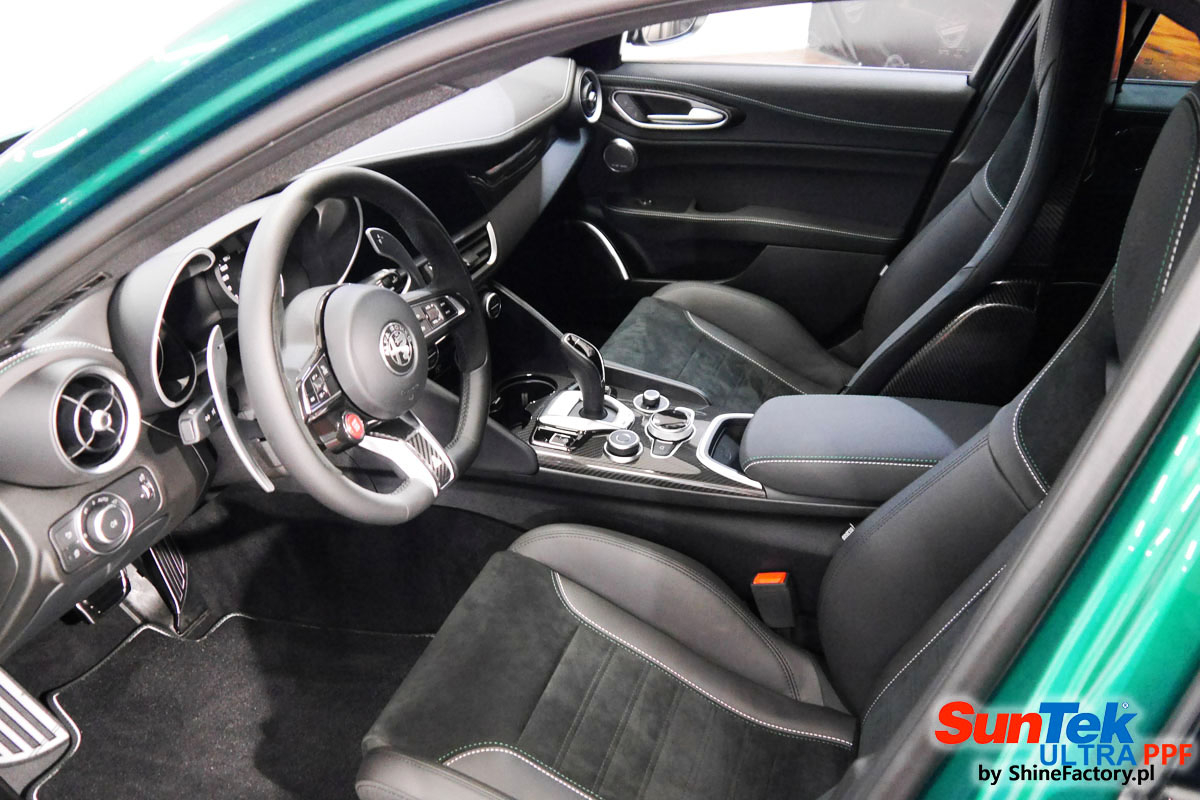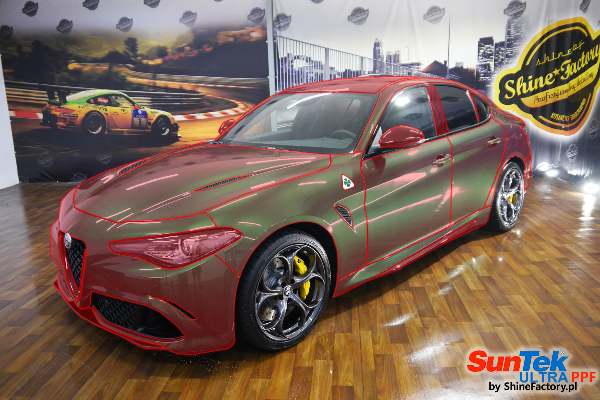 c bezbarwne folie ochronne. Folie zazwyczaj aplikuje siÄ na najbardziej narażone el. auta jak przód, tym razem zdecydowaliÅmy siÄ praktycznie caÅe auto pokryÄ najlepszymi na Åwiecie regeneracyjnymi foliami SunTek Ultra aby uzyskaÄ 100% ochronÄ lakieru, który bÄdzie caÅkowicie izolowany od Årodowiska zewnÄtrznego i nic nie bÄdzie wstanie go uszkodziÄ. Po aplikacji folii przeszliÅmy do zabezpieczania wszelkich el. auta powÅokami, zaaplikowaliÅmy pakiet powÅok na caÅe auto, folie, szyby (Gtechniq G1), felgi (DLUX), elementy nielakierowane, a także caÅe wnÄtrze wraz z zaimpregnowaniem delikatnych skór. Po kilkudziesiÄciu godzinach pracy Alfa nabraÅa perfekcyjnego wyglÄ