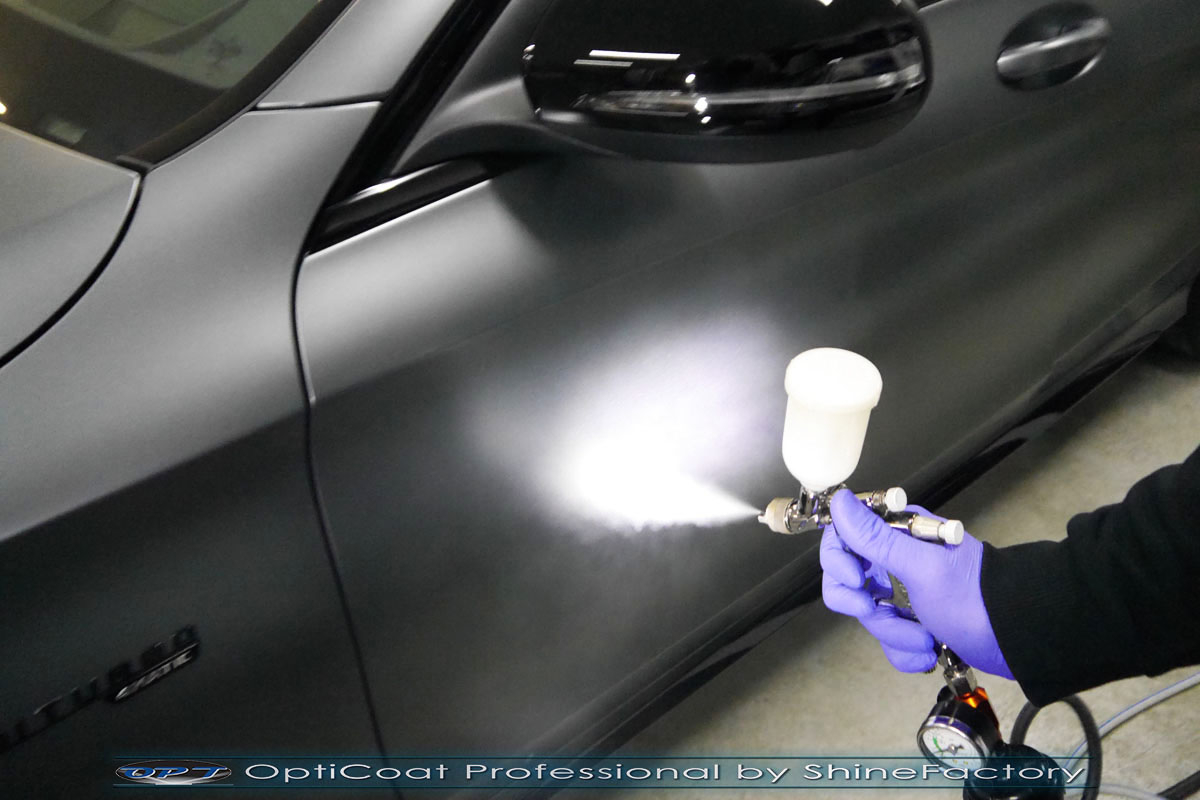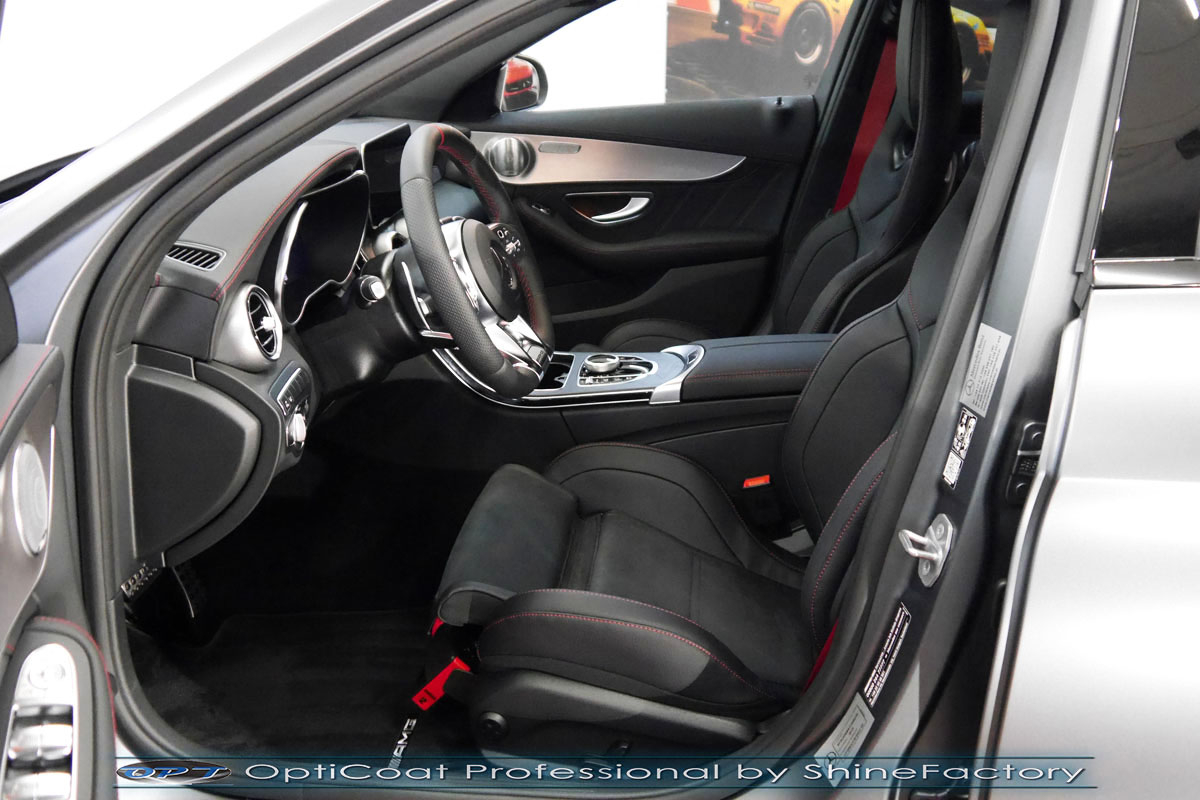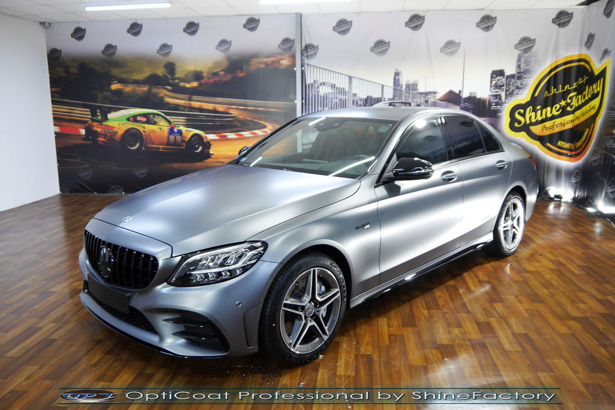 Tym razem ponownie mieliśmy za zadanie zająć się zabezpieczeniem matowego lakieru z palety Mercedesa. Model C43 został nam powierzony w celu zabezpieczenia pakietem specjalnych powłok aby ochronić delikatny lakier na przyszłe lata użytkowania oraz ułatwić jego oczyszczanie. Matowa powłoka jest szczególna, wymaga bardzo delikatnego i specjalistycznego podejścia, wszystkie kosmetyki muszą być odpowiednie oraz dostosowane do tego typu lakieru. Bardzo ważna jest odpowiednia pielęgnacja od pierwszych kilometrów, ponieważ nie pozwala on na żadną renowację czy usunięcie wżerów . Zdecydowaliśmy się zabezpieczyć każdy element auta (szyby, chromy, felgi, klosze lamp, detale itp) najlepszymi powłokami ceramicznymi/kwarcowymi z rynku, sam lakier najgrubszą natryskową testowaną w laboratoryjny sposób przez TUV powłoką ceramiczną OptiCoat Professional. Oczywiście najpierw auto musiało zostać w specjalistyczny sposób dokładnie oczyszczone i poprawnie przygotowane pod aplikację powłoki. Następnie po precyzyjnym natryskowym zaaplikowaniu powłoki OC PRO lakier pokryliśmy dodatkową warstwą GlossCoat która zapewniła maksymalny efekt działania, śliskość lakieru na wiele lat. Finalnie pakiet powłok został wygrzany w odpowiedniej temperaturze lampami IR. Także całe wnętrze zostało zabezpieczone różnymi kosmetykami w najdrobniejszym detalu wraz z zaimpregnowaniem skór oraz alkantary. Mercedes po kilku dniach prac nabrał maksymalnej możliwej ochrony co zapewni zminimalizowane brudzenie oraz banalne utrzymanie auta w perfekcyjnym stanie na bardzo długi czas. Zapraszamy do szerokiej fotorelacji i zdjęć efektu końcowego. Dodatkowo zmieniliśmy na czarny kolor kilka chromowanych dodatków jak gwiazda na grillu czy listwy oraz zmieniliśmy emblematy na czarne.