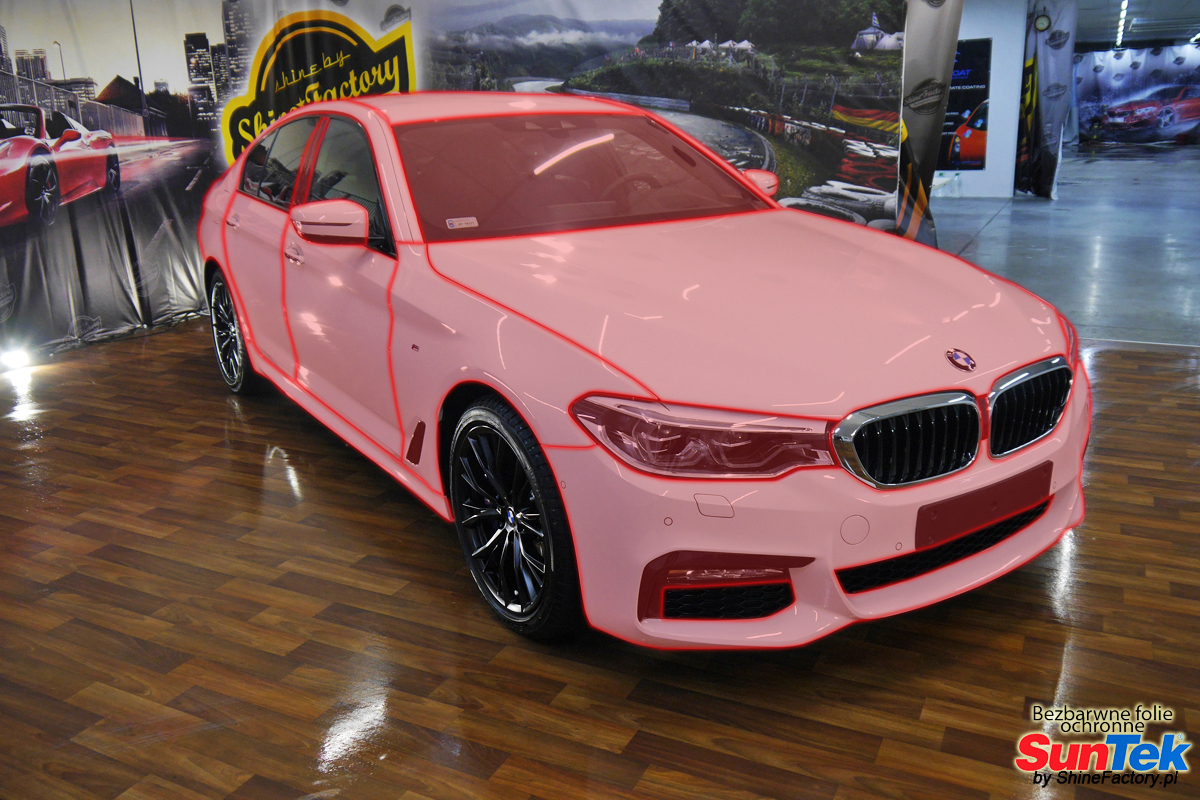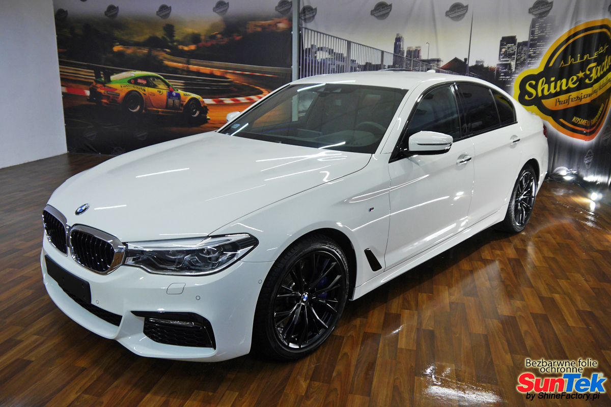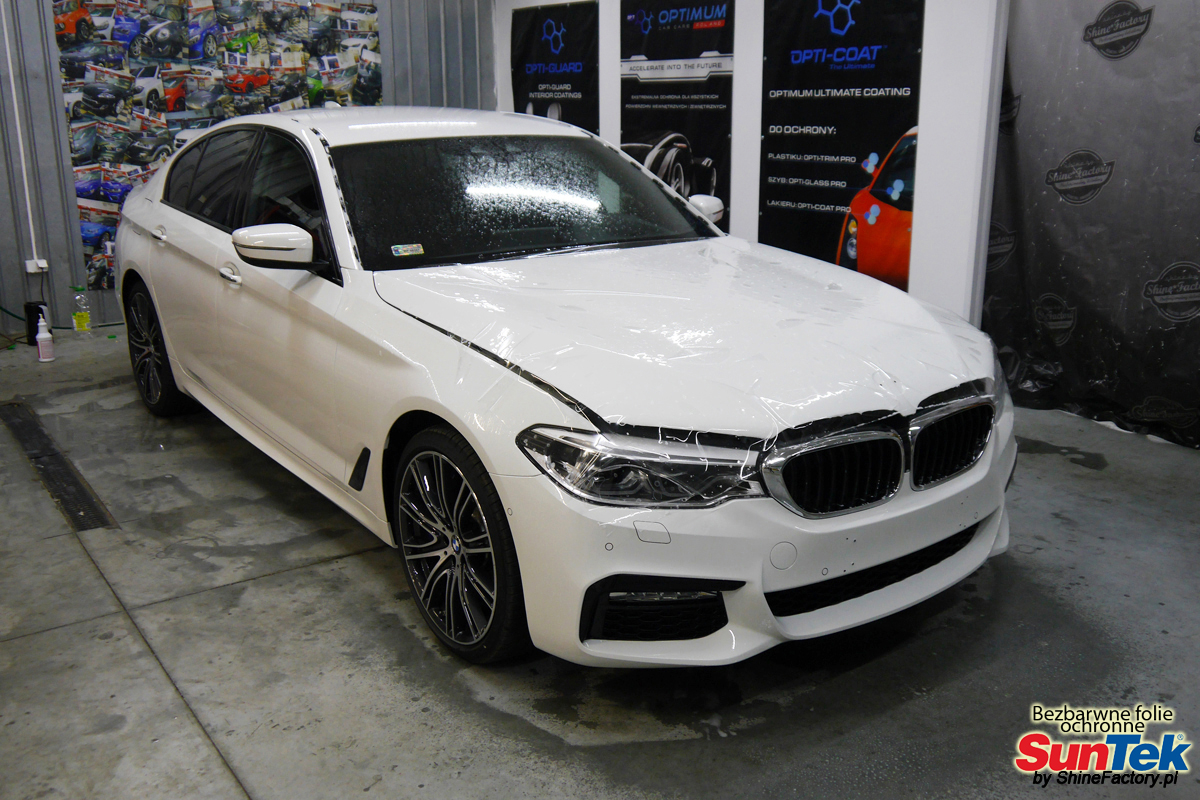 Zabezpieczenie frontów aut bezbarwnymi foliami ochronnymi staje się powoli standardem, coraz częściej także zabezpieczane w ten sposób są auta w całości co daje do tego czasu nieosiągalne perfekcyjne zabezpieczenie i efekt wizualny. Tym razem mieliśmy przyjemność zająć się BMW serii 5, auto trafiło do nas po krótkim czasie użytkowania w celu najlepszego na świecie zabezpieczenia całego auta. Decyzja padła oczywiście na połączanie znakomitych bezbarwnych folii ochronnych SunTek Ultra PPF z 10 letnią gwarancją oraz pakietu powłok ceramicznych. Standardowo prace zaczęliśmy od bardzo dokładnego oczyszczenia nadwozia z wszelkich naleciałości. Po przygotowaniu przeszliśmy do zabezpieczenia auta, najpierw aplikując bezbarwne folie ochronne. Folie zazwyczaj aplikuje się na najbardziej narażone el. auta jak przód, tym razem zdecydowaliśmy się praktycznie całe auto pokryć najlepszymi na świecie regeneracyjnymi foliami SunTek Ultra aby uzyskać 100% ochronę lakieru, który będzie całkowicie izolowany od środowiska zewnętrznego i nic nie będzie wstanie go uszkodzić. Po aplikacji folii przeszliśmy do zabezpieczania wszelkich el. auta powłokami, zaaplikowaliśmy pakiet powłok na całe auto, folie, szyby (Gtechniq G1), felgi (DLUX), elementy nielakierowane, a także całe wnętrze wraz z zaimpregnowaniem delikatnych skór. Po kilkudziesięciu godzinach pracy BMW nabrało perfekcyjnego wyglądu, połysku oraz co najważniejsze najmocniejszej praktycznie pancernej ochrony na lata. Zapraszamy do szerokiej fotorelacji! Oklejony został praktycznie każdy centymetr auta w celu ochrony przed wszelkimi uszkodzeniami jak np. odpryski od kamieni, piaskowanie od żwiru drogowego, mocniejszymi rysami czy nawet drobnymi obcierkami parkingowymi. Dokładnie oklejone zostały: - Maska - Zderzak przedni - Klosze lamp - Błotniki przednie - Progi - Drzwi przednie - Drzwi tylne - Błotniki tylne ze słupkami - Dach - Zderzak tylny - Klapa tylna - Lusterka - Szyba czołowa Zapraszamy do zdjęć z prac i efekt końcowego, jak widać folia posiada bardzo duży połysk i przejrzystość dzięki czemu jest praktycznie nie zauważalna.