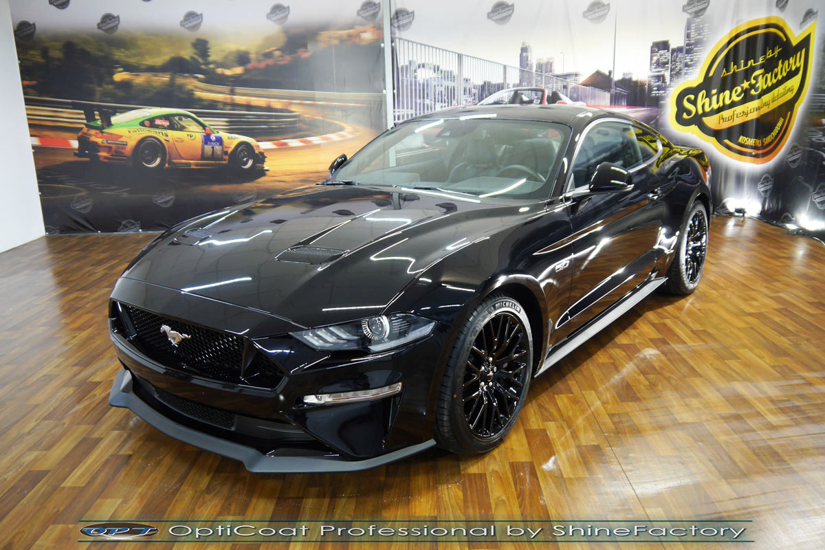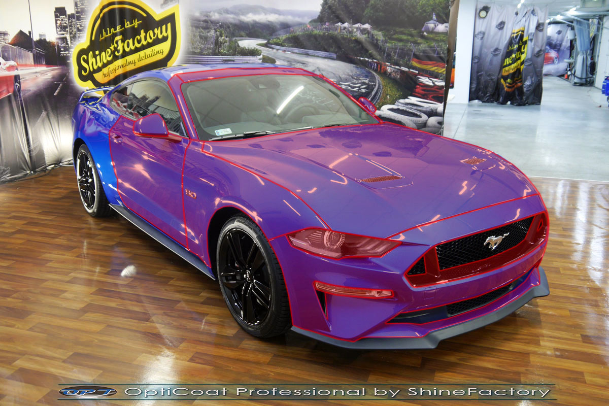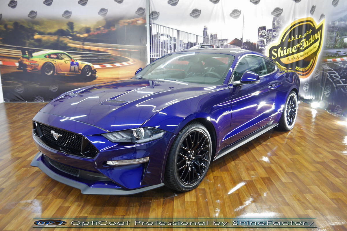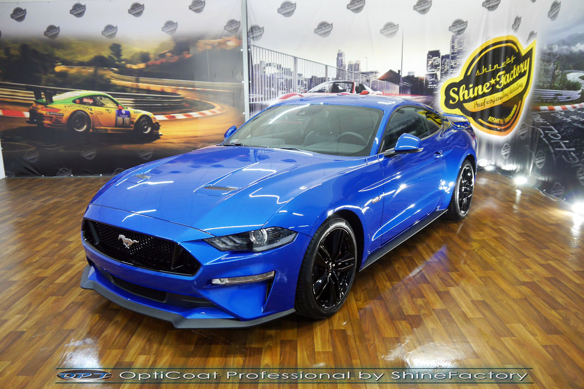 Połączenie bezbarwnych samo-regeneracyjnych folii oraz powłok ceramicznych staje się powoli standardem w idealnym zabezpieczeniu nowego auta. Tym razem mieliśmy przyjemność zająć się nowym Fordem Mustangiem GT, który trafił do nas prosto z salonu. Auto zostało maksymalnie zabezpieczone przed wszystkimi możliwymi uszkodzeniami. Wykorzystane do tego zostały najlepsze na rynku bezbarwne folie ochronne SunTek Ultra PPF oraz natryskowa ceramika OptiCoat PRO. Oczywiście prace rozpoczęliśmy od dokładnego oczyszczenia całego nadwozia z naleciałości a następnie przeprowadziliśmy korektę aby usunąć lekkie niedoskonałości pofabryczne. Następnie przystąpiliśmy do aplikacji bezbarwnych folii ochronnych na najbardziej narażone na mocne uszkodzenia el. auta, oczywiście zdecydowaliśmy się jak zawsze wybrać produkt bezkonkurencyjny i nowoczesny na rynku, czyli folie regeneracyjne SunTek Ultra PPF. Po aplikacji folii przeszliśmy do zabezpieczania wszelkich el. auta powłokami, zaaplikowaliśmy w natryskowy sposób grubą warstwę powłoki 9H+ Optimum OptiCoat Professional potwierdzoną testami TUV, pokrywając ją dla maksymalnego efektu wizualnego powłoką GlossCoat, która na końcu została utwardzona w odpowiedniej temp. lampami IR. Oczywiście zajęliśmy się, także zabezpieczeniem pakietem powłok wszelkich innych elementów jak szyby (Gtechniq G1), felgi (DLUX), lampy czy elementy nielakierowane. Nie pominęliśmy zajęcia się wnętrzem aby zabezpieczyć je w każdym detalu różnymi kosmetykami skupiając się na impregnacji delikatnych skór. Po kilkudziesięciu godzinach pracy Mustang nabrał perfekcyjnego wyglądu, połysku oraz co najważniejsze najmocniejszej praktycznie pancernej ochrony na lata. Zapraszamy do szerokiej fotorelacji!