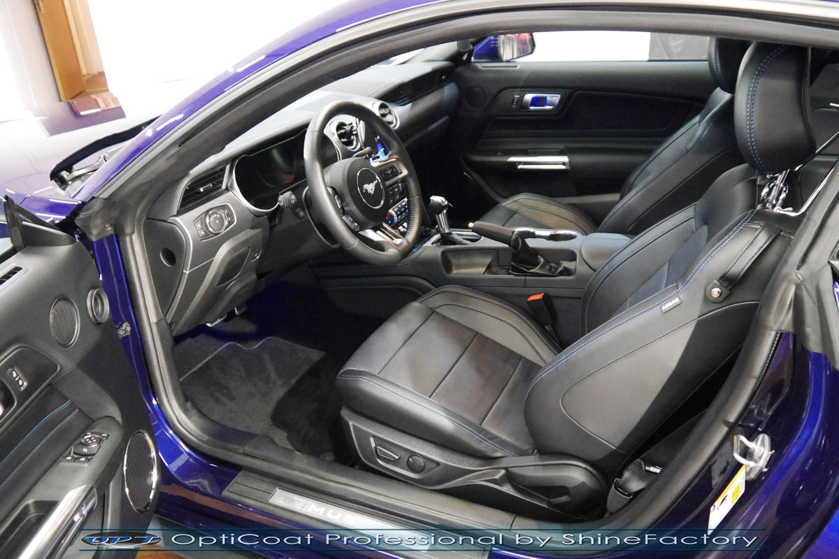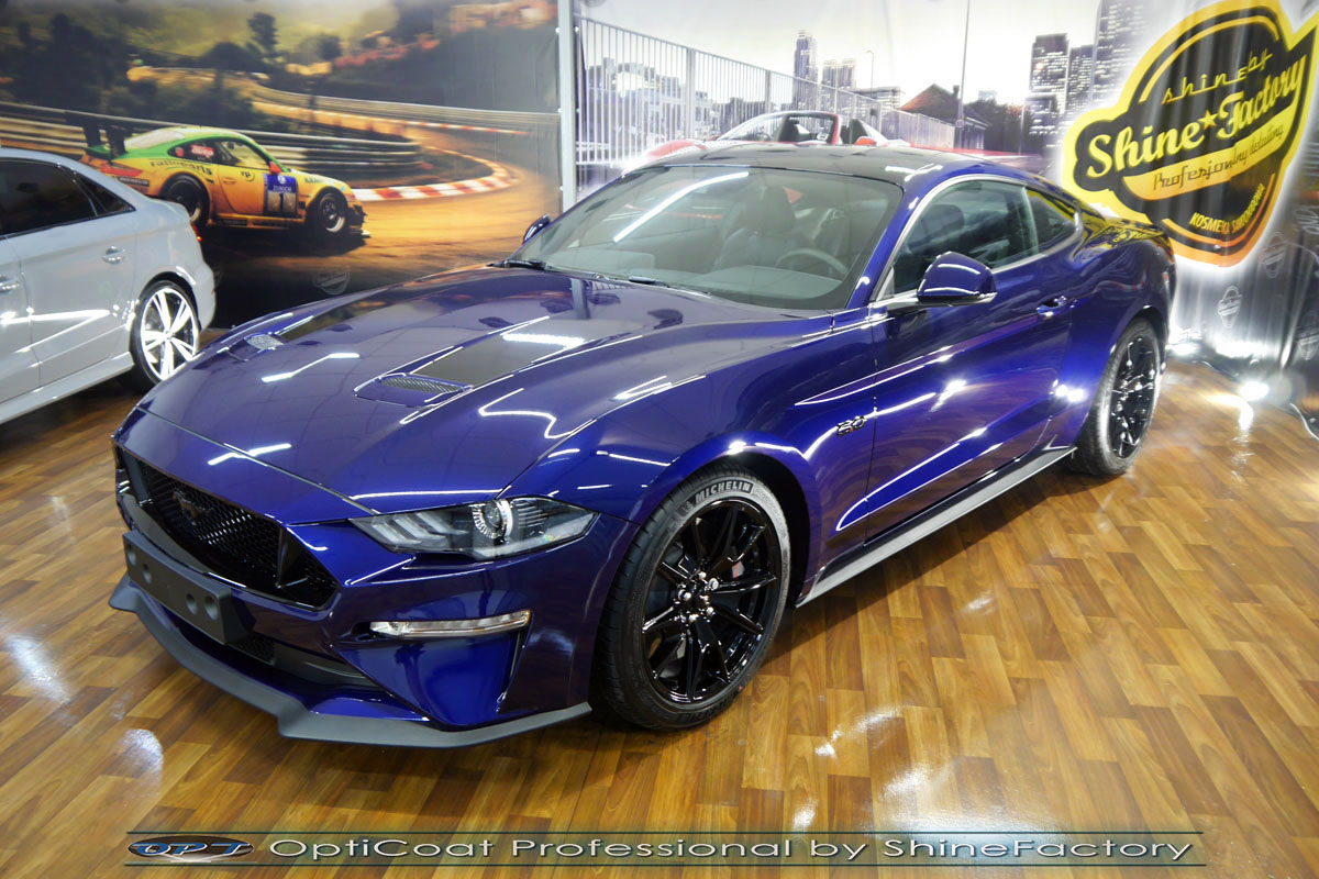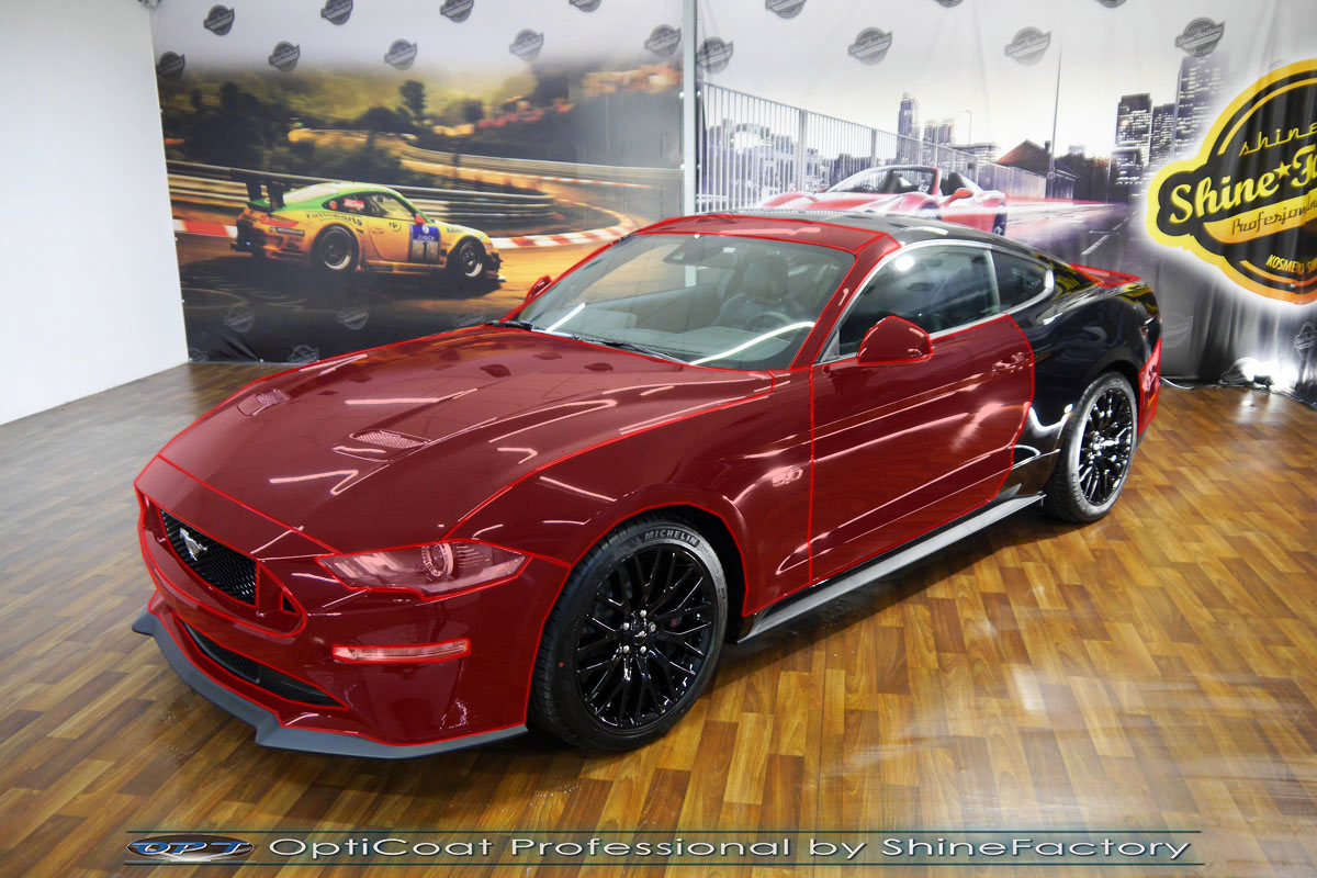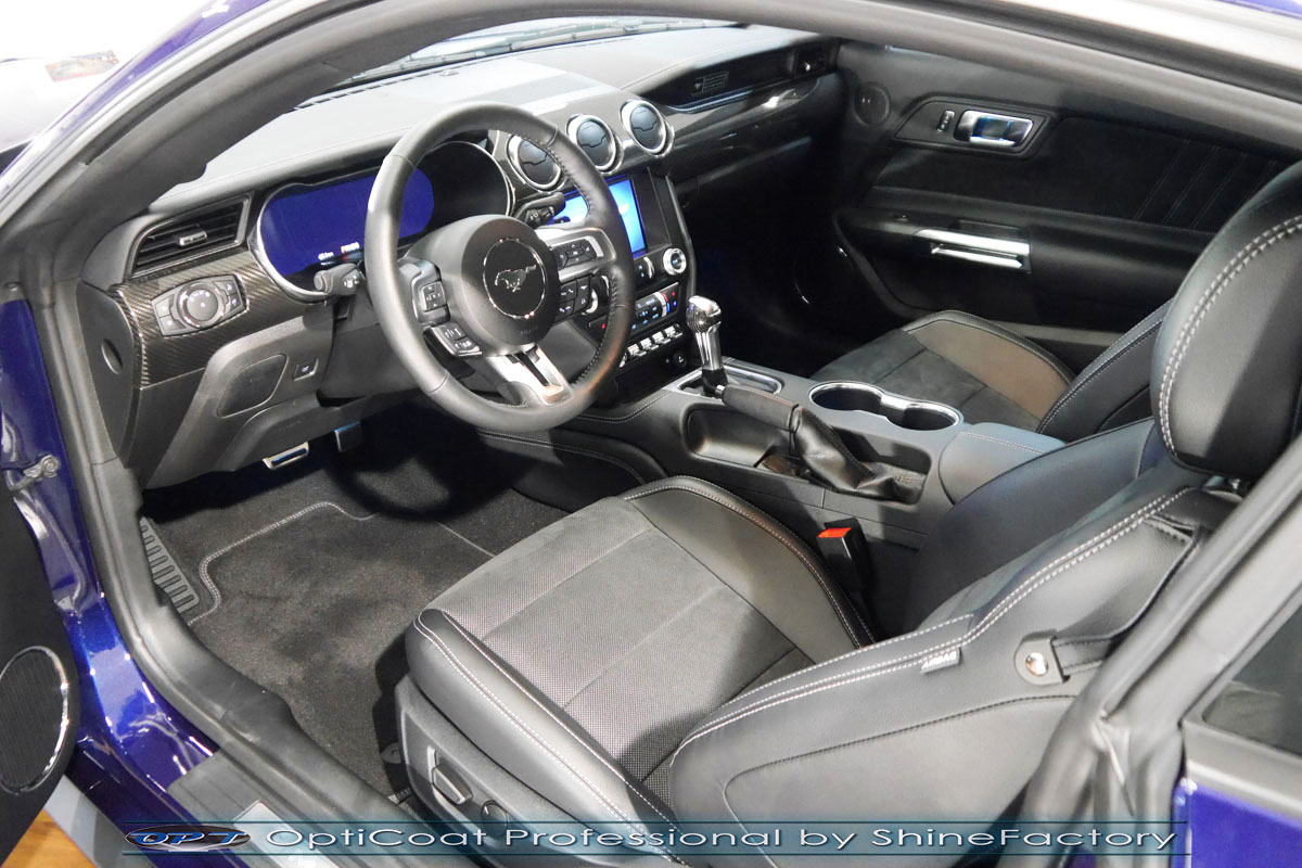 Połączenie bezbarwnych samo-regeneracyjnych folii oraz powłok ceramicznych staje się powoli standardem w idealnym zabezpieczeniu nowego auta. Tym razem mieliśmy przyjemność zająć się nowym Fordem Mustangiem GT, który trafił do nas prosto z salonu. Auto zostało maksymalnie zabezpieczone przed wszystkimi możliwymi uszkodzeniami. Wykorzystane do tego zostały najlepsze na rynku bezbarwne folie ochronne SunTek Ultra PPF oraz natryskowa ceramika OptiCoat PRO. Oczywiście prace rozpoczęliśmy od dokładnego oczyszczenia całego nadwozia z naleciałości a następnie przeprowadziliśmy korektę aby usunąć lekkie niedoskonałości pofabryczne. Następnie przystąpiliśmy do aplikacji bezbarwnych folii ochronnych na najbardziej narażone na mocne uszkodzenia el. auta, oczywiście zdecydowaliśmy się jak zawsze wybrać produkt bezkonkurencyjny i nowoczesny na rynku, czyli folie regeneracyjne SunTek Ultra PPF. Po aplikacji folii przeszliśmy do zabezpieczania wszelkich el. auta powłokami, zaaplikowaliśmy w natryskowy sposób grubą warstwę powłoki 9H+ Optimum OptiCoat Professional potwierdzoną testami TUV, pokrywając ją dla maksymalnego efektu wizualnego powłoką GlossCoat, która na końcu została utwardzona w odpowiedniej temp. lampami IR. Oczywiście zajęliśmy się, także zabezpieczeniem pakietem powłok wszelkich innych elementów jak szyby (Gtechniq G1), felgi (DLUX), lampy czy elementy nielakierowane. Nie pominęliśmy zajęcia się wnętrzem aby zabezpieczyć je w każdym detalu różnymi kosmetykami skupiając się na impregnacji delikatnych skór. Po kilkudziesięciu godzinach pracy Mustang nabrał perfekcyjnego wyglądu, połysku oraz co najważniejsze najmocniejszej praktycznie pancernej ochrony na lata. Zapraszamy do szerokiej fotorelacji!