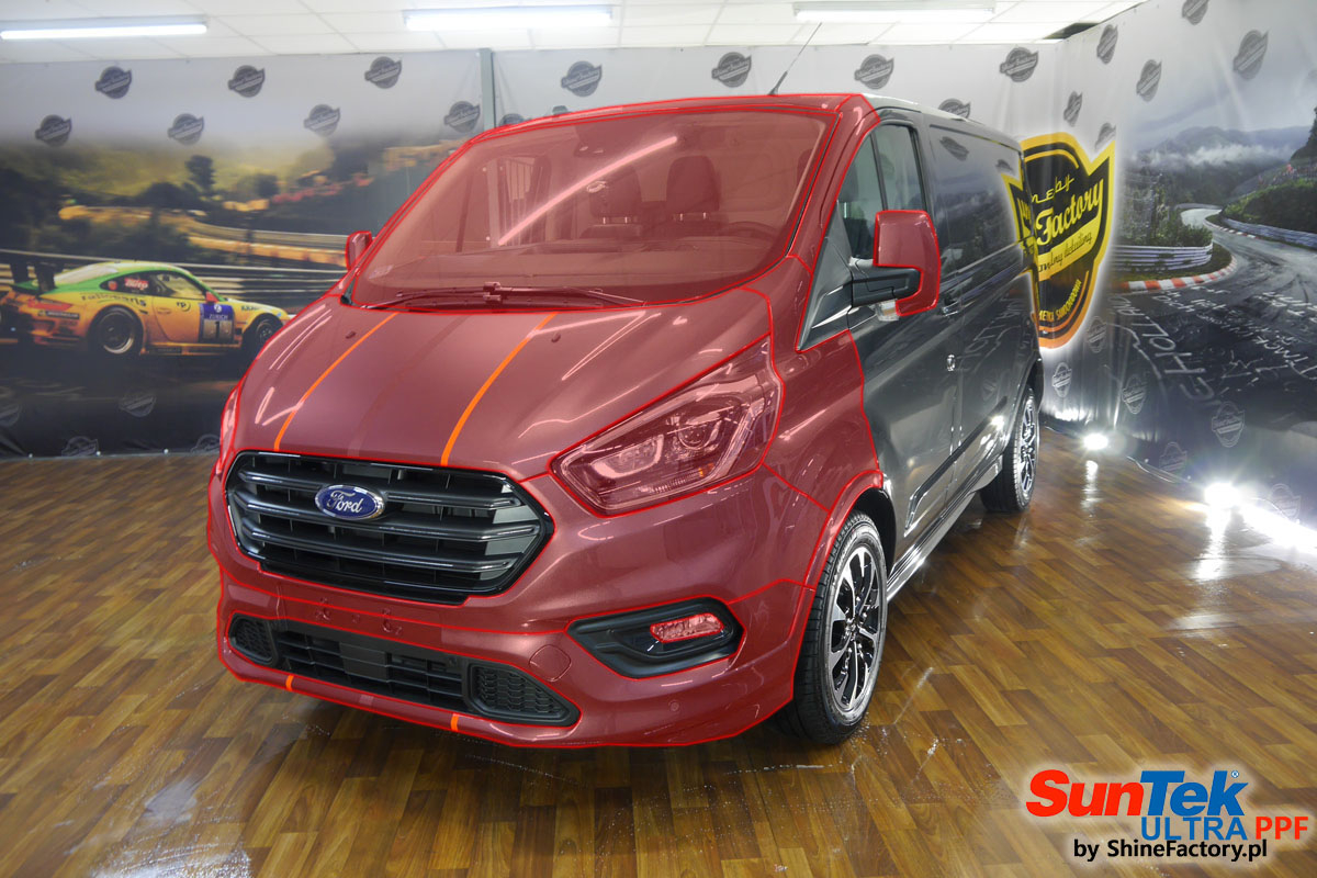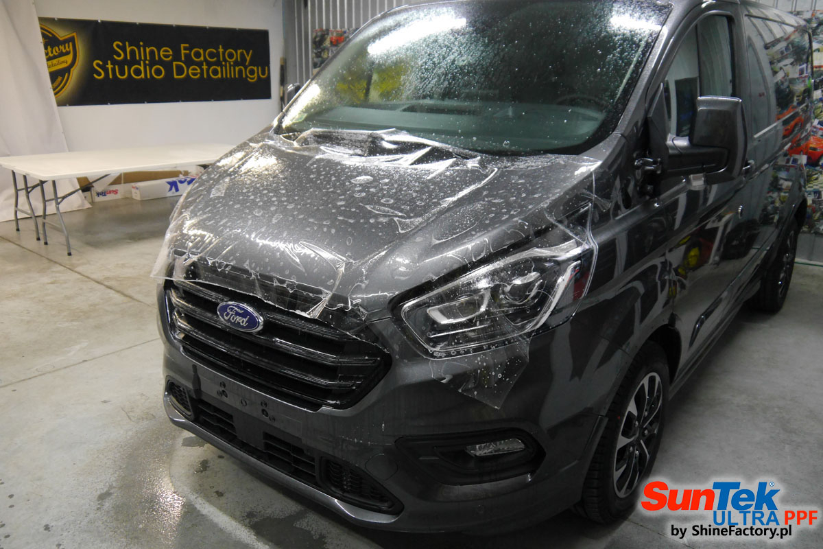 Pokrycie bezbarwną folią ochronną przodu nowego auta staje się powoli standardem w zabezpieczeniu lakieru. Tym razem klient prosto z salonu przyjechał do nas swoim nowym autem a mianowicie towarowym Fordem Transitem w wyjątkowej wersji Custom Sport właśnie w celu zabezpieczenia folią ochronną całego przodu narażonego na wypiaskowanie i odpryski od kamieni. Wykorzystane do tego zostały najlepsze na rynku bezbarwne folie ochronne SunTek Ultra PPF. Prace rozpoczęliśmy od dokładnego oczyszczenia całego nadwozia z naleciałości oraz delikatnej korekty lakieru. Następnie przystąpiliśmy do aplikacji. Oklejone zostały przednie elementy w celu ochrony przed mocnymi mechanicznymi uszkodzeniami jak np. odpryski od kamieni, piaskowanie od żwiru drogowego, mocniejszymi rysami, obiciami czy nawet drobnymi obcierkami parkingowymi.