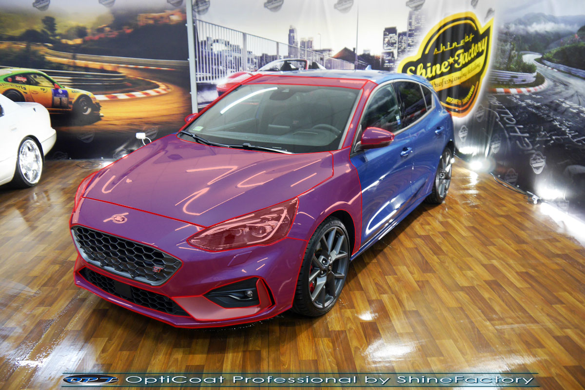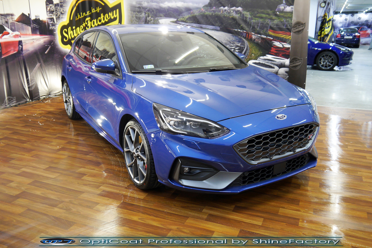 Połączenie bezbarwnych samo-regeneracyjnych folii oraz powłok ceramicznych staje się powoli standardem w idealnym zabezpieczeniu nowego auta. Tym razem mieliśmy przyjemność zająć się nowym Fordem Fokusem ST. Auto zostało maksymalnie zabezpieczone przed wszystkimi możliwymi uszkodzeniami. Wykorzystane do tego zostały najlepsze na rynku bezbarwne folie ochronne SunTek Ultra PPF oraz natryskowa ceramika OptiCoat PRO. Oczywiście prace rozpoczęliśmy od dokładnego oczyszczenia całego nadwozia z naleciałości a następnie przeprowadziliśmy korektę aby usunąć lekkie niedoskonałości pofabryczne. Następnie przystąpiliśmy do aplikacji bezbarwnych folii ochronnych na najbardziej narażone na mocne uszkodzenia el. auta, oczywiście zdecydowaliśmy się jak zawsze wybrać produkt bezkonkurencyjny i nowoczesny na rynku, czyli folie regeneracyjne SunTek Ultra PPF. Po aplikacji folii przeszliśmy do zabezpieczania wszelkich el. auta powłokami, zaaplikowaliśmy w natryskowy sposób grubą warstwę powłoki 9H+ Optimum OptiCoat Professional potwierdzoną testami TUV, pokrywając ją dla maksymalnego efektu wizualnego powłoką GlossCoat, która na końcu została utwardzona w odpowiedniej temp. lampami IR. Oczywiście zajęliśmy się, także zabezpieczeniem pakietem powłok wszelkich innych elementów jak szyby (Gtechniq G1), felgi (DLUX), lampy czy elementy nielakierowane. Nie pominęliśmy zajęcia się wnętrzem aby zabezpieczyć je w każdym detalu różnymi kosmetykami skupiając się na impregnacji delikatnych skór i alkantary. Po kilkudziesięciu godzinach pracy Fokus nabrał perfekcyjnego wyglądu, połysku oraz co najważniejsze najmocniejszej praktycznie pancernej ochrony na lata. Zapraszamy do szerokiej fotorelacji!