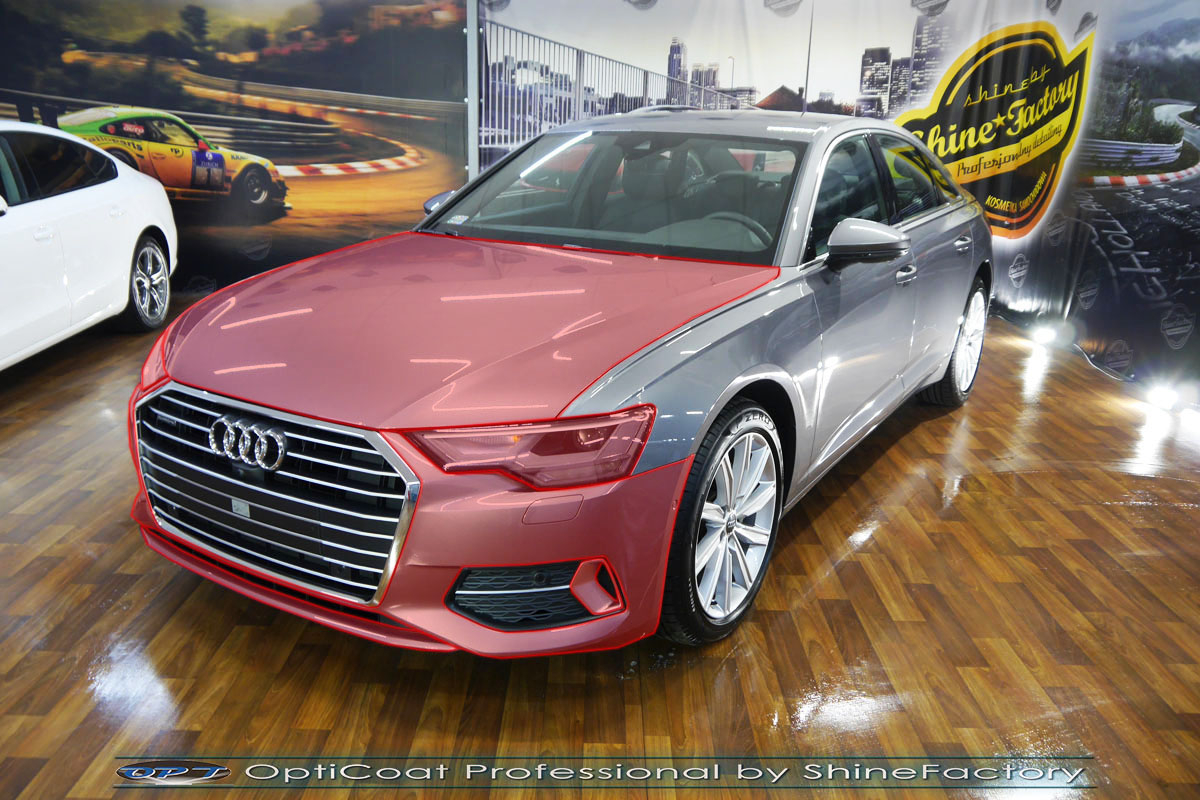 Połączenie bezbarwnych samo-regeneracyjnych folii oraz powłok ceramicznych staje się powoli standardem w idealnym zabezpieczeniu nowego auta. Tym razem mieliśmy przyjemność zająć się nowym Audi A6, które trafiło do nas po niewielkim przebiegu, kiedy właściciel zauważył już powstające odpryski na przodzie i słabą jakość lakieru auta. Auto zostało maksymalnie zabezpieczone przed wszystkimi możliwymi uszkodzeniami. Wykorzystane do tego zostały najlepsze na rynku bezbarwne folie ochronne SunTek Ultra PPF oraz natryskowa ceramika OptiCoat PRO. Oczywiście prace rozpoczęliśmy od dokładnego oczyszczenia całego nadwozia z naleciałości a następnie przeprowadziliśmy korektę aby usunąć niedoskonałości. Następnie przystąpiliśmy do aplikacji bezbarwnych folii ochronnych na najbardziej narażone na mocne uszkodzenia el. auta, oczywiście zdecydowaliśmy się jak zawsze wybrać produkt bezkonkurencyjny i nowoczesny na rynku, czyli folie regeneracyjne SunTek Ultra PPF. Po aplikacji folii przeszliśmy do zabezpieczania wszelkich el. auta powłokami, zaaplikowaliśmy w natryskowy sposób grubą warstwę powłoki 9H+ Optimum OptiCoat Professional potwierdzoną testami TUV, pokrywając ją dla maksymalnego efektu wizualnego powłoką GlossCoat, która na końcu została utwardzona w odpowiedniej temp. lampami IR. Oczywiście zajęliśmy się, także zabezpieczeniem pakietem powłok wszelkich innych elementów jak szyby (Gtechniq G1), felgi (DLUX), lampy czy elementy nielakierowane. Nie pominęliśmy zajęcia się wnętrzem aby zabezpieczyć je w każdym detalu różnymi kosmetykami skupiając się na impregnacji delikatnych skór. Po kilkudziesięciu godzinach pracy Audi nabrało perfekcyjnego wyglądu, połysku oraz co najważniejsze najmocniejszej praktycznie pancernej ochrony na lata. Zapraszamy do szerokiej fotorelacji! Oklejone zostały głównie przednie elementy w celu ochrony przed mocnymi mechanicznymi uszkodzeniami jak np. odpryski od kamieni, piaskowanie od żwiru drogowego, mocniejszymi rysami czy nawet drobnymi obcierkami parkingowymi. Dokładnie oklejone zostały: - Zderzak przedni - Lampy - Pełna maska Zapraszamy do zdjęć z prac i efektu końcowego, jak widać folia posiada bardzo duży połysk i przejrzystość dzięki czemu jest praktycznie nie zauważalna.