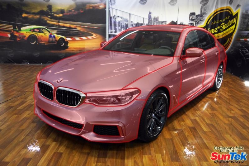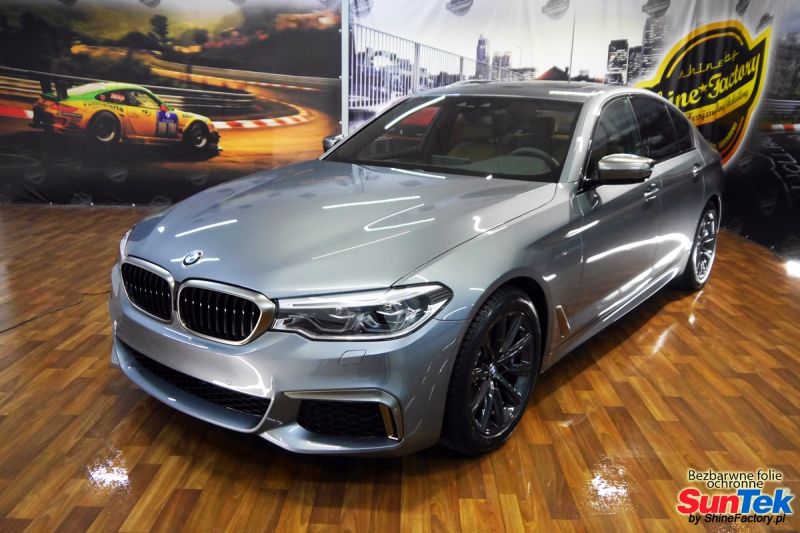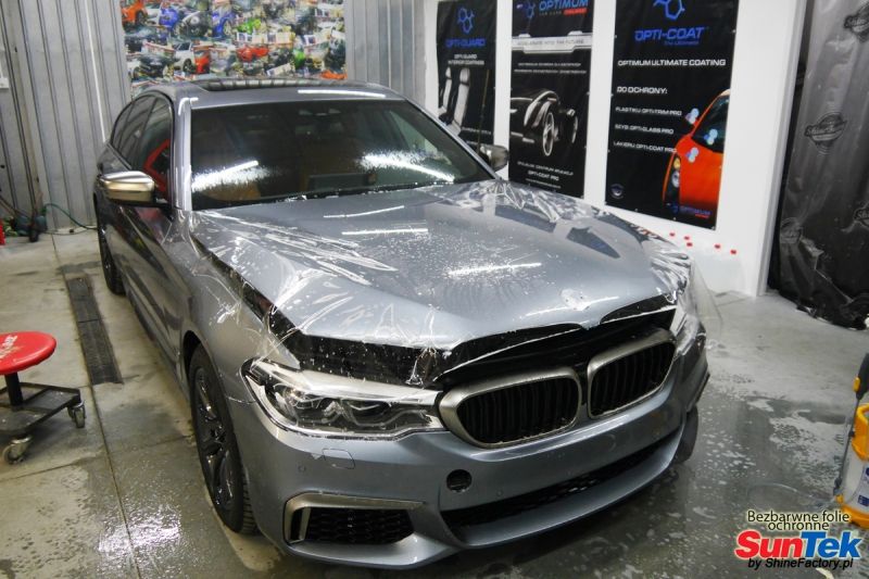 Zabezpieczenie frontów nowych aut bezbarwnymi foliami ochronnymi staje się powoli standardem, coraz częściej także zabezpieczane w ten sposób są auta w całości co daje do tego czasu nieosiągalne perfekcyjne zabezpieczenie i efekt wizualny. Tym razem mieliśmy przyjemność zająć się BMW 5 M550d. BMW zostało nam powierzone wprost po opuszczeniu salonu w celu najlepszego na świecie zabezpieczenia całego auta. Decyzja padła oczywiście na połączanie znakomitych bezbarwnych folii ochronnych SunTek Ultra PPF z 10 letnią gwarancją oraz pakietu powłok ceramicznych. Standardowo prace zaczęliśmy od bardzo dokładnego oczyszczenia nadwozia z wszelkich naleciałości. Następnie po inspekcji usunęliśmy wszelkie niedoskonałości lakieru. Po przygotowaniu przeszliśmy do zabezpieczenia auta, najpierw aplikując bezbarwne folie ochronne. Folie zazwyczaj aplikuje się na najbardziej narażone el. auta jak przód, tym razem zdecydowaliśmy się całe auto pokryć najlepszymi na świecie regeneracyjnymi foliami SunTek Ultra aby uzyskać 100% ochronę lakieru, który będzie całkowicie izolowany od środowiska zewnętrznego i nic nie będzie wstanie go uszkodzić. Po aplikacji folii przeszliśmy do zabezpieczania wszelkich el. auta powłokami, zaaplikowaliśmy pakiet powłok na całe auto, folie, szyby (Gtechniq G1), felgi (DLUX), elementy nielakierowane. Nie pominęliśmy detailingu wnętrza aby zabezpieczyć je w każdym detalu różnymi kosmetykami najwyższej klasy. Po kilkudziesięciu godzinach pracy BMW nabrało perfekcyjnego wyglądu, połysku oraz co najważniejsze najmocniejszej praktycznie pancernej ochrony na lata. Zapraszamy do szerokiej fotorelacji! Oklejone zostały wszystkie elementy auta w celu ochrony przed wszelkimi uszkodzeniami jak np. odpryski od kamieni, piaskowanie od żwiru drogowego, mocniejszymi rysami czy nawet drobnymi obcierkami parkingowymi. Dokładnie oklejone zostały: Zderzak przedni Maska Klosze lamp Błotniki przednie Drzwi przednie Drzwi tylne Błotniki tylne Zderzak tylny Dach i słupki Progi Klapa bagażnika Lusterka Różne detale Zapraszamy do zdjęć z prac i efekt końcowego, jak widać folia posiada bardzo duży połysk i przejrzystość dzięki czemu jest praktycznie nie zauważalna.