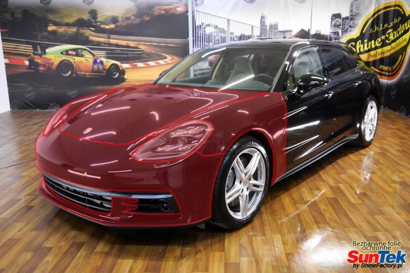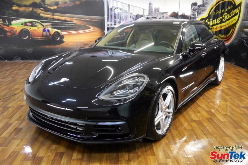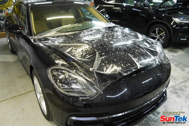 Tym razem mieliśmy przyjemność zająć się Porsche Panamera, która została nam powierzona w celu aplikacji bezbarwnych folii ochronnych na najbardziej newralgiczne elementy auta, czyli pełen front. Auto zostało nam oddane z niewielkim przebiegiem, kiedy już na froncie zaczęły pojawiać się odpryski od kamieni. Właściciel zadecydował aby uzupełnić zabezpieczone auto powłoką ceramiczną o bezbarwne folie ochronne na przednie elementy. Prace zaczęliśmy od bardzo dokładnego oczyszczenia auta co jest bardzo ważne przed następnymi etapami prac, następnie wypolerowaliśmy na ideał el. które miały zostać pokryte foliami. Oczywiście zastosowaliśmy najlepsze folie ochronne z rynku czyli SunTek Ultra PPF z 10 letnią gwarancją oraz regeneracją rys, a pokryliśmy nimi dokładnie- Pełna maska Pełne błotniki Zderzak przedni Lampy Dodatkowo zmieniliśmy przez oklejenie kolor srebrnych listewek na czarny Zapraszamy do zdjęć z prac i efekt końcowego, jak widać folia posiada bardzo duży połysk i przejrzystość dzięki czemu jest praktycznie nie zauważalna.