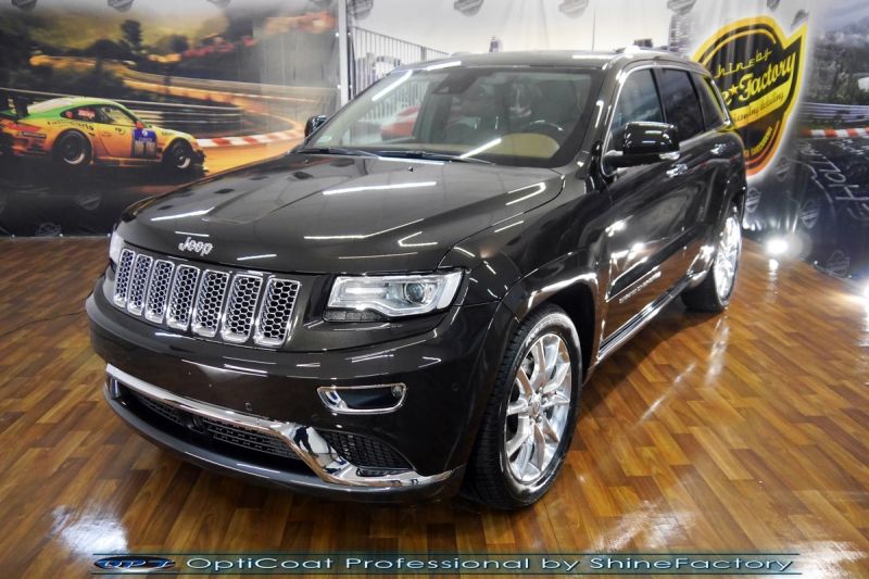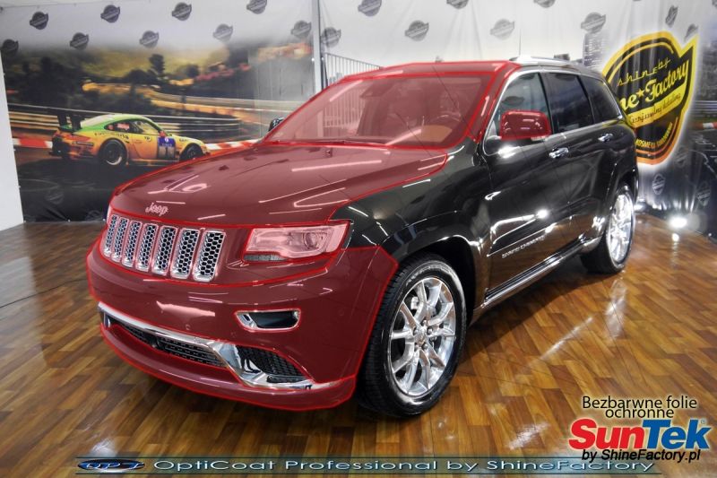 Połączenie bezbarwnych samo-regeneracyjnych folii oraz powłok ceramicznych staje się powoli standardem w idealnym zabezpieczeniu nowego auta. Tym razem mieliśmy przyjemność zająć się Jeepem Grand Cherokee. Auto zostało maksymalnie zabezpieczone przed wszystkimi możliwymi uszkodzeniami. Wykorzystane do tego zostały najlepsze na rynku bezbarwne folie ochronne SunTek Ultra PPF oraz natryskowa ceramika OptiCoat PRO. Oczywiście prace rozpoczęliśmy od dokładnego oczyszczenia całego nadwozia z naleciałości, zdjęliśmy z auta koła. Przeprowadziliśmy korektę aby usunąć powstałe po niewielkim przebiegu uszkodzenia jak zmatowienia czy wżery od owadów na froncie. Następnie przystąpiliśmy do aplikacji bezbarwnych folii ochronnych na najbardziej narażone na mocne uszkodzenia el. auta, oczywiście zdecydowaliśmy się jak zawsze wybrać produkt bezkonkurencyjny i nowoczesny na rynku, czyli folie regeneracyjne SunTek Ultra PPF. Po aplikacji folii przeszliśmy do zabezpieczania wszelkich el. auta powłokami, zaaplikowaliśmy w natryskowy sposób grubą warstwę powłoki 9H+ Optimum OptiCoat Professional potwierdzoną testami TUV, pokrywając ją dla maksymalnego efektu wizualnego powłoką GlossCoat, która na końcu została utwardzona w odpowiedniej temp. lampami IR. Oczywiście zajęliśmy się, także zabezpieczeniem pakietem powłok wszelkich innych elementów jak szyby (Gtechniq G1), felgi (DLUX), lampy czy elementy nielakierowane . Nie pominęliśmy zajęcia się wnętrzem aby zabezpieczyć je w każdym detalu różnymi kosmetykami skupiając się na impregnacji delikatnych skór. Po kilkudziesięciu godzinach pracy Jeep nabrał perfekcyjnego wyglądu, połysku oraz co najważniejsze najmocniejszej praktycznie pancernej ochrony na lata. Zapraszamy do szerokiej fotorelacji! Oklejone zostały przednie elementy głównie w celu ochrony przed mocnymi mechanicznymi uszkodzeniami jak np. odpryski od kamieni, piaskowanie od żwiru drogowego, mocniejszymi rysami czy nawet drobnymi obcierkami parkingowymi. Dokładnie oklejone zostały: Zderzak przedni Pełna maska Lampy Szyba przednia Lusterka Słupki A Nadszybie Zapraszamy do zdjęć z prac i efekt końcowego, jak widać folia posiada bardzo duży połysk i przejrzystość dzięki czemu jest praktycznie nie zauważalna.