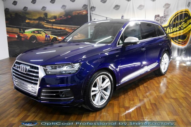 Zapraszamy Państwa do fotorelacji z prac nad Audi SQ7. Auto zostało nam oddane z symbolicznym przebiegiem w celu odświeżenia oraz jak najgrubszego i jak najmocniejszego możliwego zabezpieczenia pakietem powłok ceramicznych. Audi przeszło nasz szeroki pakiet prac dla nowego auta więc prócz zabezpieczenia kompletem ceramiki nadwozia, zdjęliśmy z auta koła w celu dokładnego detailingu nadkoli, wnętrza felg oraz zacisków hamulcowych. Całe wnętrze zostało zaimpregnowane kosmetykami najwyższej ligi z naciskiem na zabezpieczenie skór, el. plastikowych oraz materiałowych. Prace nad nadwoziem rozpoczęliśmy od dokładnego oczyszczenia i odtłuszczenia, następnie lakier przeszedł delikatną korektę w celu uzyskania perfekcyjnego efektu finalnego oraz usunięcia już powstałych niedoskonałości jak wżery po owadach oraz lekkie zmatowienie. Po tych czynnościach przeszliśmy do aplikacji powłok na wszelkie elementy jak lakier, szyby (bezapelacyjnie najlepszą powłoką Gtechniq G1), lampy, felgi (pancerny CQ DLUX), detale itp itd. Najważniejsze, na sam lakier zaaplikowaliśmy maksymalnie grubą natryskową warstwę kompozytu ceramicznego (100% powłoki na aucie) opartego na SiC- OptiCoat Professional połączoną z powłoką GlossCoat, która zapewni ochronę, zminimalizowane brudzenie oraz ułatwione do maksimum mycie. Nie pominęliśmy zajęcia się komorą silnika aby na długi czas prezentowała się świeżo i schludnie. Finalnie całe auto zostało wygrzane lampami IR w odpowiedniej temperaturze w celu utwardzenia. Zapraszamy do szerokiej fotorelacji!