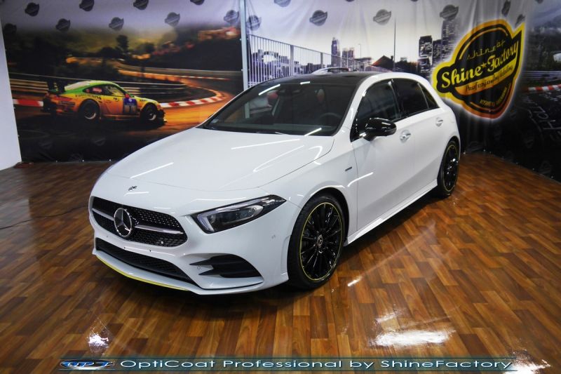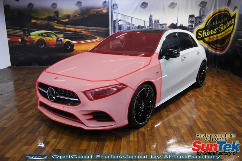 Połączenie bezbarwnych samo-regeneracyjnych folii oraz powłok ceramicznych staje się powoli standardem w idealnym zabezpieczeniu nowego auta. Tym razem mieliśmy przyjemność zająć się najnowszą odsłoną Mercedesa klasy A. Auto zostało maksymalnie zabezpieczone przed wszystkimi możliwymi uszkodzeniami. Wykorzystane do tego zostały najlepsze na rynku bezbarwne folie ochronne SunTek Ultra PPF oraz natryskowa ceramika OptiCoat PRO. Oczywiście prace rozpoczęliśmy od dokładnego oczyszczenia całego nadwozia z naleciałości, zdjęliśmy z auta koła. Przeprowadziliśmy delikatną korektę aby usunąć po fabryczne/transportowe niedoskonałości. Następnie przystąpiliśmy do aplikacji bezbarwnych folii ochronnych na najbardziej narażone na mocne uszkodzenia el. auta, oczywiście zdecydowaliśmy się jak zawsze wybrać produkt bezkonkurencyjny i nowoczesny na rynku, czyli folie regeneracyjne SunTek Ultra PPF. Po aplikacji folii przeszliśmy do zabezpieczania wszelkich el. auta powłokami, zaaplikowaliśmy w natryskowy sposób grubą warstwę powłoki 9H+ Optimum OptiCoat Professional potwierdzoną testami TUV, pokrywając ją dla maksymalnego efektu wizualnego powłoką GlossCoat, która na końcu została utwardzona w odpowiedniej temp. lampami IR. Oczywiście zajęliśmy się, także zabezpieczeniem pakietem powłok wszelkich innych elementów jak szyby (Gtechniq G1), felgi (DLUX), lampy czy elementy nielakierowane . Nie pominęliśmy zajęcia się wnętrzem aby zabezpieczyć je w każdym detalu różnymi kosmetykami skupiając się na impregnacji delikatnych skór. Po kilkudziesięciu godzinach pracy Mercedes nabrał perfekcyjnego wyglądu, połysku oraz co najważniejsze najmocniejszej praktycznie pancernej ochrony na lata. Zapraszamy do szerokiej fotorelacji! Oklejone zostały przednie elementy głównie w celu ochrony przed mocnymi mechanicznymi uszkodzeniami jak np. odpryski od kamieni, piaskowanie od żwiru drogowego, mocniejszymi rysami czy nawet drobnymi obcierkami parkingowymi. Dokładnie oklejone zostały: Zderzak przedni Pełna maska Pełne błotniki Lampy Szyba przednia Zapraszamy do zdjęć z prac i efekt końcowego, jak widać folia posiada bardzo duży połysk i przejrzystość dzięki czemu jest praktycznie nie zauważalna.