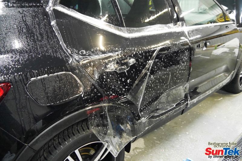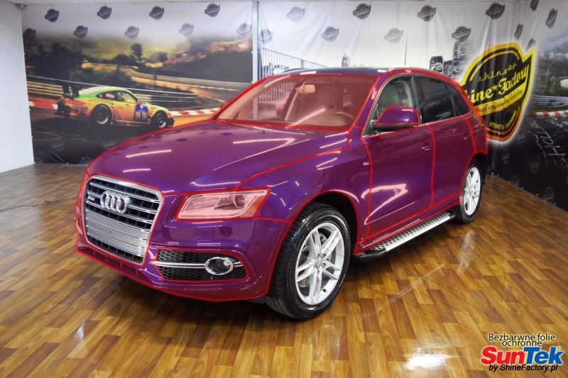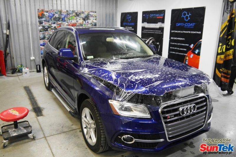 Zabezpieczenie frontów aut bezbarwnymi foliami ochronnymi staje się powoli standardem, coraz częściej także zabezpieczane w ten sposób są auta w całości co daje do tego czasu nieosiągalne perfekcyjne zabezpieczenie i efekt wizualny. Tym razem mieliśmy przyjemność zająć się dość mocno używanym Audi Q5. Audi zostało nam powierzone w celu pełnej renowacji, detailingu i doprowadzenia do ideału a finalnie najlepszego na świecie zabezpieczenia całego auta aby efekt nie zmienił się pod żadnym warunkiem przez wiele lat. Decyzja padła oczywiście na połączanie znakomitych bezbarwnych folii ochronnych SunTek Ultra PPF z 10 letnią gwarancją oraz pakietu powłok ceramicznych. Standardowo prace zaczęliśmy od bardzo dokładnego oczyszczenia nadwozia z wszelkich naleciałości. Następnie po inspekcji usunęliśmy wszelkie niedoskonałości lakieru jak mocne zmatowienie i liczne zarysowania. Po przygotowaniu przeszliśmy do zabezpieczenia auta, najpierw aplikując bezbarwne folie ochronne. Folie zazwyczaj aplikuje się na najbardziej narażone el. auta jak przód, tym razem zdecydowaliśmy się praktycznie całe auto pokryć najlepszymi na świecie regeneracyjnymi foliami SunTek Ultra aby uzyskać 100% ochronę lakieru, który będzie całkowicie izolowany od środowiska zewnętrznego i nic nie będzie wstanie go uszkodzić. Po aplikacji folii przeszliśmy do zabezpieczania wszelkich el. auta powłokami, zaaplikowaliśmy pakiet powłok na całe auto, folie, szyby (Gtechniq G1), felgi (DLUX), elementy nielakierowane. Po kilkudziesięciu godzinach pracy Audi nabrało perfekcyjnego wyglądu, połysku oraz co najważniejsze najmocniejszej praktycznie pancernej ochrony na lata. Zapraszamy do szerokiej fotorelacji! Oklejone zostały wszystkie elementy auta w celu ochrony przed wszelkimi uszkodzeniami jak np. odpryski od kamieni, piaskowanie od żwiru drogowego, mocniejszymi rysami czy nawet drobnymi obcierkami parkingowymi. Dokładnie oklejone zostały: Szyba czołowa Zderzak przedni Zderzak tylny Maska Klosze lamp Błotniki przednie Błotniki tylne Drzwi przednie Drzwi tylne Lusterka Klapa tylna Zapraszamy do zdjęć z prac i efekt końcowego, jak widać folia posiada bardzo duży połysk i przejrzystość dzięki czemu jest praktycznie nie zauważalna.