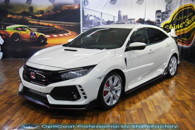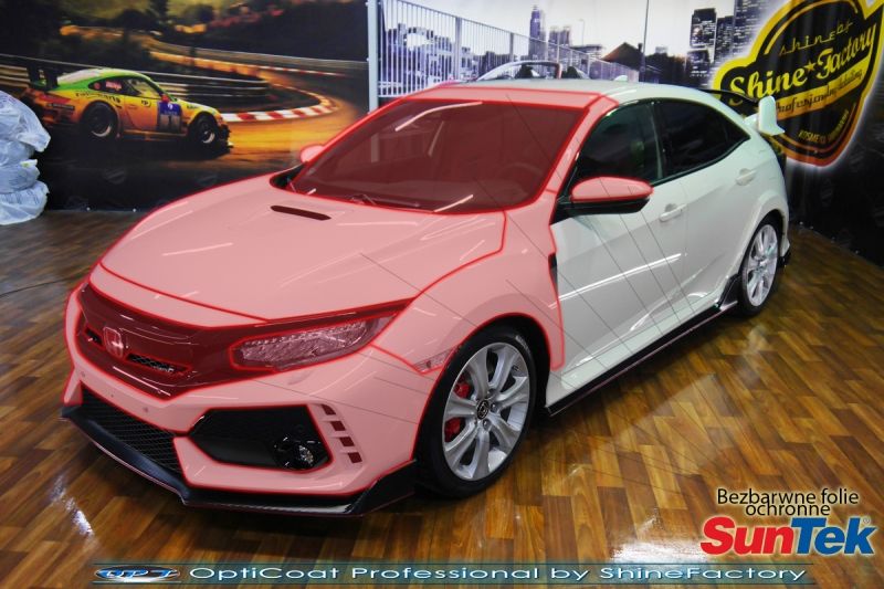 Połączenie bezbarwnych samo-regeneracyjnych folii oraz powłok ceramicznych staje się powoli standardem w idealnym zabezpieczeniu nowego auta. Tym razem mieliśmy przyjemność zająć się najnowszą Honda Civic w najmocniejszej wersji Type-R. Auto zostało maksymalnie zabezpieczone przed wszystkimi możliwymi uszkodzeniami. Wykorzystane do tego zostały najlepsze na rynku bezbarwne folie ochronne SunTek Ultra PPF oraz natryskowa ceramika OptiCoat PRO. Oczywiście prace rozpoczęliśmy od dokładnego oczyszczenia całego nadwozia z naleciałości. Przeprowadziliśmy delikatną korektę aby usunąć po fabryczne/transportowe niedoskonałości. Następnie przystąpiliśmy do aplikacji bezbarwnych folii ochronnych na najbardziej narażone na mocne uszkodzenia el. auta, oczywiście zdecydowaliśmy się jak zawsze wybrać produkt bezkonkurencyjny i nowoczesny na rynku, czyli folie regeneracyjne SunTek Ultra PPF. Po aplikacji folii przeszliśmy do zabezpieczania wszelkich el. auta powłokami, zaaplikowaliśmy w natryskowy sposób grubą warstwę powłoki 9H+ Optimum OptiCoat Professional potwierdzoną testami TUV, pokrywając ją dla maksymalnego efektu wizualnego powłoką GlossCoat, która na końcu została utwardzona w odpowiedniej temp. lampami IR. Oczywiście zajęliśmy się, także zabezpieczeniem pakietem powłok wszelkich innych elementów jak szyby (Gtechniq G1), felgi (DLUX), lampy czy elementy nielakierowane . Nie pominęliśmy zajęcia się wnętrzem aby zabezpieczyć je w każdym detalu różnymi kosmetykami skupiając się na impregnacji el. z delikatnej alkantary i skóry. Po kilkudziesięciu godzinach pracy TypeR nabrał perfekcyjnego wyglądu, połysku oraz co najważniejsze najmocniejszej praktycznie pancernej ochrony na lata. Zapraszamy do szerokiej fotorelacji! Oklejone zostały przednie elementy głównie w celu ochrony przed mocnymi mechanicznymi uszkodzeniami jak np. odpryski od kamieni, piaskowanie od żwiru drogowego, mocniejszymi rysami czy nawet drobnymi obcierkami parkingowymi. Dokładnie oklejone zostały: Zderzak przedni Czarny grill Pełna maska Pełne błotniki Lampy Lusterka Szyba przednia Zapraszamy do zdjęć z prac i efekt końcowego, jak widać folia posiada bardzo duży połysk i przejrzystość dzięki czemu jest praktycznie nie zauważalna.