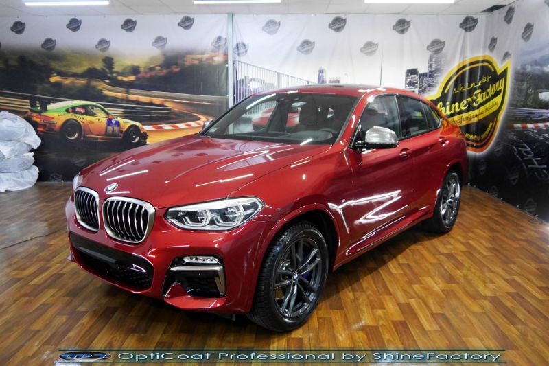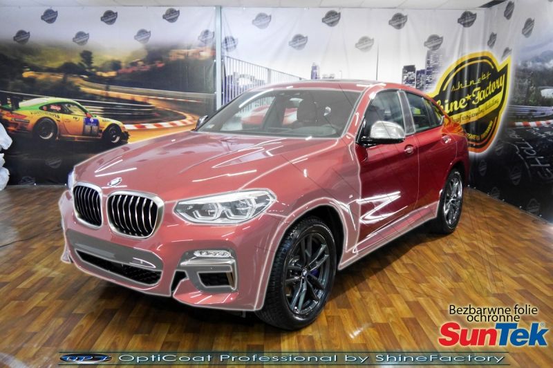 Połączenie bezbarwnych samo-regeneracyjnych folii oraz powłok ceramicznych staje się powoli standardem w idealnym zabezpieczeniu nowego auta. Tym razem mieliśmy przyjemność zająć się najnowszą odsłoną BMW X4. Auto zostało maksymalnie zabezpieczone przed wszystkimi możliwymi uszkodzeniami. Wykorzystane do tego zostały najlepsze na rynku bezbarwne folie ochronne SunTek Ultra PPF oraz natryskowa ceramika OptiCoat PRO. Oczywiście prace rozpoczęliśmy od dokładnego oczyszczenia całego nadwozia z naleciałości, zdjęliśmy z auta koła. Przeprowadziliśmy delikatną korektę aby usunąć po fabryczne/transportowe niedoskonałości. Następnie przystąpiliśmy do aplikacji bezbarwnych folii ochronnych na najbardziej narażone na mocne uszkodzenia el. auta, oczywiście zdecydowaliśmy się jak zawsze wybrać produkt bezkonkurencyjny i nowoczesny na rynku, czyli folie regeneracyjne SunTek Ultra PPF. Po aplikacji folii przeszliśmy do zabezpieczania wszelkich el. auta powłokami, zaaplikowaliśmy w natryskowy sposób grubą warstwę powłoki 9H+ Optimum OptiCoat Professional potwierdzoną testami TUV, pokrywając ją dla maksymalnego efektu wizualnego powłoką GlossCoat, która na końcu została utwardzona w odpowiedniej temp. lampami IR. Oczywiście zajęliśmy się, także zabezpieczeniem pakietem powłok wszelkich innych elementów jak szyby (Gtechniq G1), felgi (DLUX), lampy czy elementy nielakierowane . Nie pominęliśmy zajęcia się wnętrzem aby zabezpieczyć je w każdym detalu różnymi kosmetykami skupiając się na impregnacji delikatnych skór. Po kilkudziesięciu godzinach pracy BMW nabrało perfekcyjnego wyglądu, połysku oraz co najważniejsze najmocniejszej praktycznie pancernej ochrony na lata. Zapraszamy do szerokiej fotorelacji! Oklejone zostały przednie elementy głównie w celu ochrony przed mocnymi mechanicznymi uszkodzeniami jak np. odpryski od kamieni, piaskowanie od żwiru drogowego, mocniejszymi rysami czy nawet drobnymi obcierkami parkingowymi. Dokładnie oklejone zostały: Zderzak przedni Pełna maska Pełne błotniki Lampy Szyba przednia Lusterka Słupki A Nadszybie Słupki B pianoblack Progi Doły drzwi Ranty drzwi Wnęki klamek Próg bagażnika Zapraszamy do zdjęć z prac i efekt końcowego, jak widać folia posiada bardzo duży połysk i przejrzystość dzięki czemu jest praktycznie nie zauważalna.