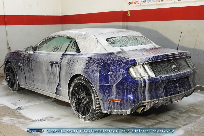 Witamy! Dziś pragniemy zaprosić do fotorelacji z zabezpieczenia najnowszego forda Mustanga GT w nadwoziu cabrio. Właściciel przyprowadził do nas auto po kilku kilometrach przebiegu, w celu aplikacji ceramicznej powłoki ochronnej Optimum Professional. Pierwszorzędnie dokładnie i dogłębnie oczyściliśmy nadwozie auta, choć nowe już po kilku kilometrach niezabezpieczony lakier zebrał sporą ilość wgryzionych naleciałości drogowych. Następnie odświeżyliśmy lakier po salonowych zabiegach kiedy auto stało pokazowo na salonie, dokładnie przygotowaliśmy i odtłuściliśmy powierzchnię. Po precyzyjnym zaaplikowaniu powłoki OC PRO i pakietu powłok na wszelkie inne elementy, jak szyby, lampy, el. nielakierowane, felgi itp itd, całe auto zostało wygrzane w wysokiej temperaturze. Na życzenie klienta zaimpregnowaliśmy także jasne skóry, specjalistycznymi kosmetykami Colourlock. Granatowy Mustang po kilku dniach prac nabrał połysku i głębi koloru, oraz co najważniejsze najlepszej ochrony co zapewni zminimalizowane brudzenie oraz ułatwi utrzymanie auta w perfekcyjnym stanie na wiele lat. Zapraszamy do szerokiej fotorelacji i zdjęć efektu końcowego!