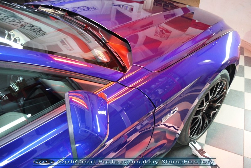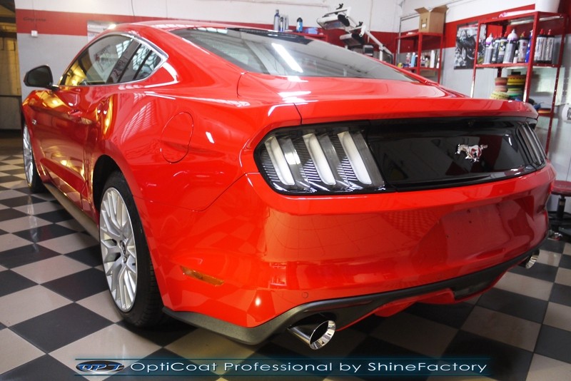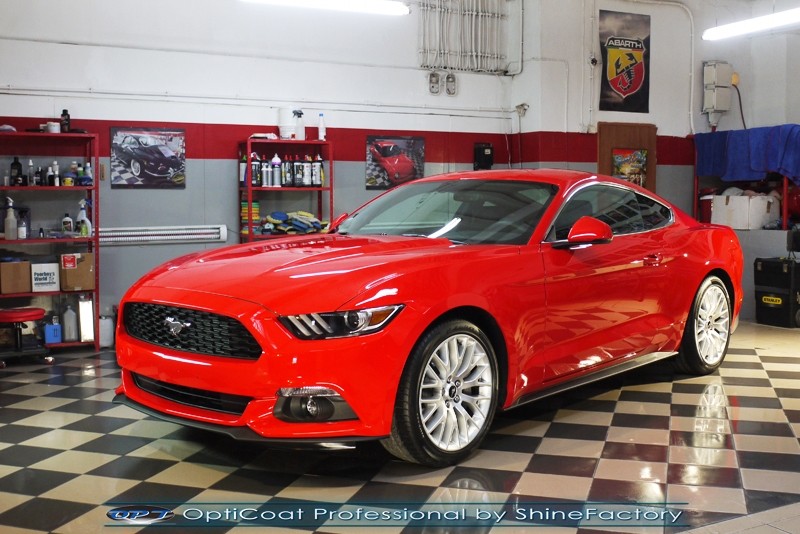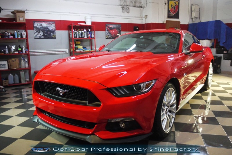 Witamy! Dziś zapraszamy do fotorelacji z zabezpieczenia nowego Forda Mustanga, który został nam powierzony przez naszego stałego klienta w celu jak najgrubszego i jak najmocniejszego możliwego zabezpieczenia powłoką ceramiczną. Zdecydowaliśmy się zabezpieczyć każdy element auta najlepszymi powłokami z rynku, sam lakier, aby uzyskać jak najgrubszą warstwę w natryskowy sposób, testowaną w laboratoryjnie przez TUV ceramiką OptiCoat Professional. Oczywiście najpierw auto musiało zostać w specjalistyczny sposób dokładnie oczyszczone, następnie koniecznością przed aplikacją tak zaawansowanego zabezpieczenia konieczne było skorygowanie niedoskonałości pozostawionych w kilku miejscach przez salon/fabrykę. Po dokładnym przygotowaniu i odtłuszczeniu oraz precyzyjnym natryskowym zaaplikowaniu powłoki OC PRO lakier pokryliśmy dodatkową warstwą GlossCoat, która zapewniła maksymalny połysk i śliskość lakieru na wiele lat. Oczywiście całe wnętrze zostało zabezpieczone różnymi kosmetykami w najdrobniejszym detalu wraz z zaimpregnowaniem delikatnych skór. Auto po kilku dniach prac nabrało połysku i maksymalnie krwistej czerwieni oraz co najważniejsze najlepszej ochrony co zapewni zminimalizowane brudzenie oraz banalne utrzymanie auta w perfekcyjnym stanie na wiele lat. Zapraszamy do szerokiej fotorelacji i zdjęć efektu końcowego!