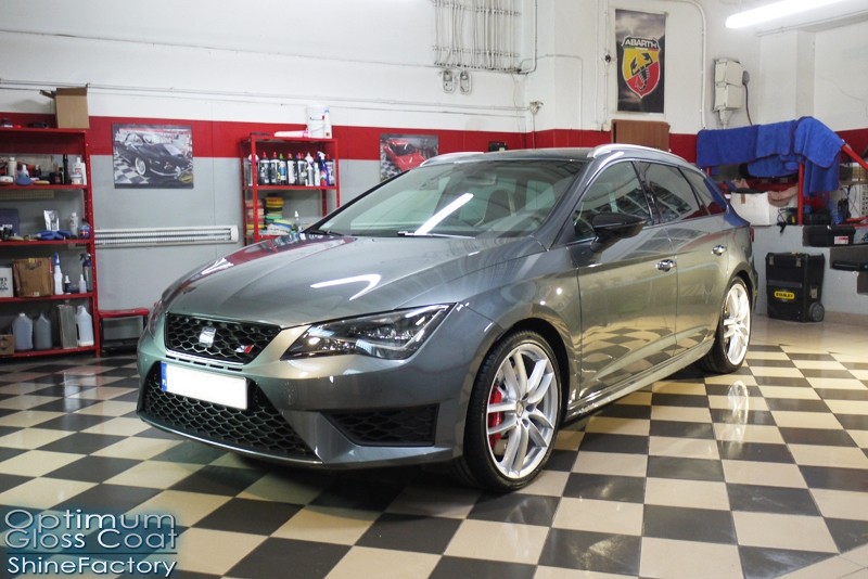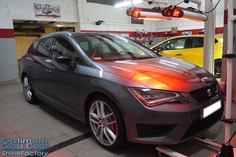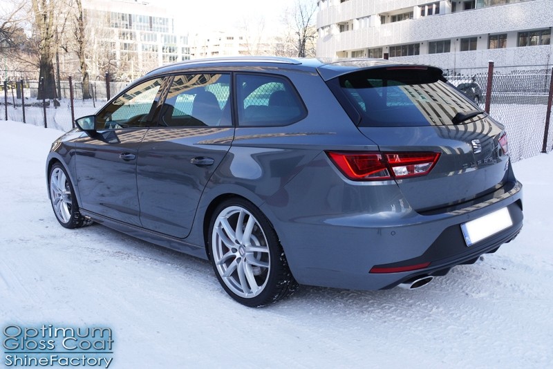 Seat Leon Cupra w nadwoziu kombi został nam powierzony kilka dni po odebraniu z salonu w celu zabezpieczenia lakieru i wszelkich innych elementów z zewnątrz pakietem powłok ochronnych. Pierwszorzędnie dokładnie oczyściliśmy lakier z zabrudzeń oraz zabezpieczeń fabrycznych pozostawionych przez salon. Po inspekcji okazało się, iż tym razem salon sprzedający auto bardzo dobrze zadbał o auto i lakier był w ładnym stanie, pozostało nam wykonać tylko lekką korektę aby idealnie przygotować powierzchnię pod powłokę. W między czasie prac nad lakierem zaimpregnowaliśmy skórzane elementy we wnętrzu auta w celu zminimalizowania brudzenia i pękania. Zaaplikowaliśmy także trwałą powłokę na 4tłoczkowe przednie zaciski hamulcowe. Finalnie wszystkie elementy auta jak szyby, felgi, klosze lamp itp zostały zabezpieczone pakietem powłok ceramicznych/kwarcowych, na sam lakier położyliśmy powłokę Optimum GlossCoat która została wygrzana w odpowiedniej temp. Pokryliśmy także dedykowaną powłoką ochronną letnie felgi. Auto po pracy nabrało idealnej prezentacji, trwałej ochrony a grafitowy lakier połysku.
