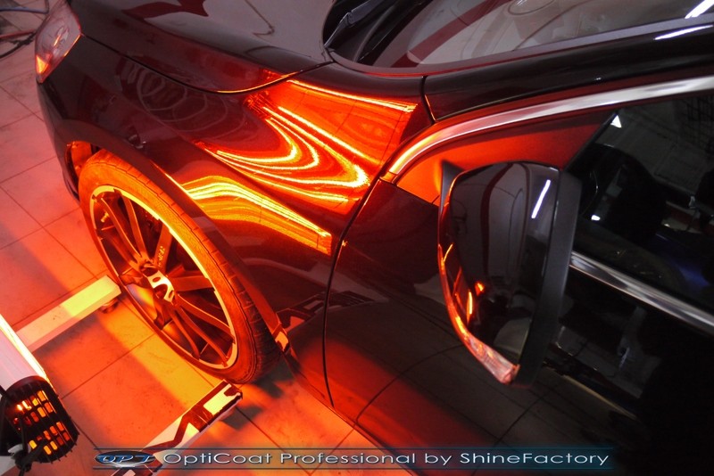 BMW serii 5 zostało nam powierzone przez nowego właściciela zaraz po zakupie w celu możliwie maksymalnie mocnego zabezpieczenia, czyli wykonania wyjątkowej natryskowej aplikacji powłoki ceramicznej. Auto przeszło bardzo szeroki pakiet prac dlatego też zaczęliśmy od detailngu felg oraz nadkoli a także dogłębnego oczyszczenia lakieru. Następnie przed przystąpieniem do aplikacji powłoki musieliśmy poprawić już zmęczony lakier poprzez pośrednią 2stopniową korektę, dzięki czemu poprawiliśmy wygląd oraz poprawnie przygotowaliśmy go do zabezpieczania ceramiką. Na całe auto zaaplikowaliśmy w skomplikowany natryskowy sposób powłokę ceramiczną 9H+ opartą na SiC OptiCoat Professional połączoną z powłoką GlossCoat zapewniając maksymalną grubość i efektywność działania na wiele lat. Nie zapomnieliśmy także o detailingu wszelkich elementów wnętrza, zaimpregnowaniu skór oraz całej komory silnika silnika. Po kilkudziesięciu godzinach pracy kilku osób auto nabrało niesamowitego wyglądu oraz ceramicznej ochrony. Zapraszamy do ciekawej fotorelacji!