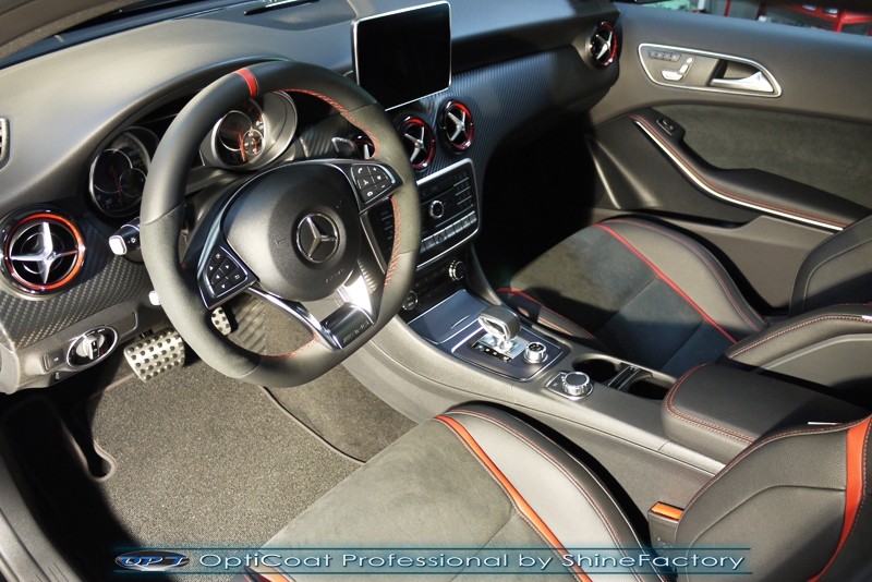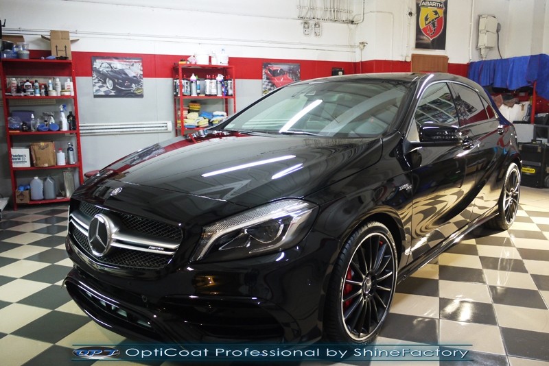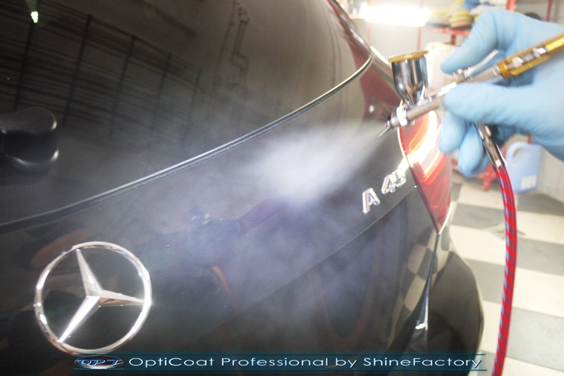 Dziś chcemy przedstawić relację z przykładowego idealnego zabezpieczenia nowego auta. Nowy czarny Mercedes A45 AMG, trafił do nas zaraz po wyjeździe z salonu, w celu jak najmocniejszego zabezpieczenia każdego elementu auta. Prace zaczęliśmy od detailingu nadkoli oraz wnętrza felg, zabezpieczyliśmy powłokami zaciski hamulcowe oraz felgi od wewnątrz. Następnie całe auto zostało dokładnie oczyszczone z zabrudzeń oraz fabrycznych zabezpieczeń. Lakier ogólnie w bardzo dobrym stanie posiadał tylko miejscowe uszkodzenia, które delikatnie poprawiliśmy i mogliśmy spokojnie dokładnie odtłuścić lakier i przejść do aplikacji powłok na każdy element auta jak lakier, szyby, plastiki, felgi. Na całe auto zaaplikowaliśmy w skomplikowany natryskowy sposób maksymalnie grubą warstwę kompozytu ceramicznego 9H+ opartego na SiC Optimum OptiCoat Professional połączoną z powłoką GlossCoat, która zapewniła maksymalny połysk i ochronę na bardzo długi czas. Po aplikacji, całe auto zostało wygrzane lampami IR w odpowiedniej temperaturze w celu utwardzenia powłok. Oczywiście zajęliśmy się także komorą silnika oraz wnętrzem auta, zaimpregnowaliśmy elementy skórzane, nawoskowaliśmy el. lakierowane oraz winylowe/plastikowe. Zapraszamy do bardzo ciekawej fotorelacji.