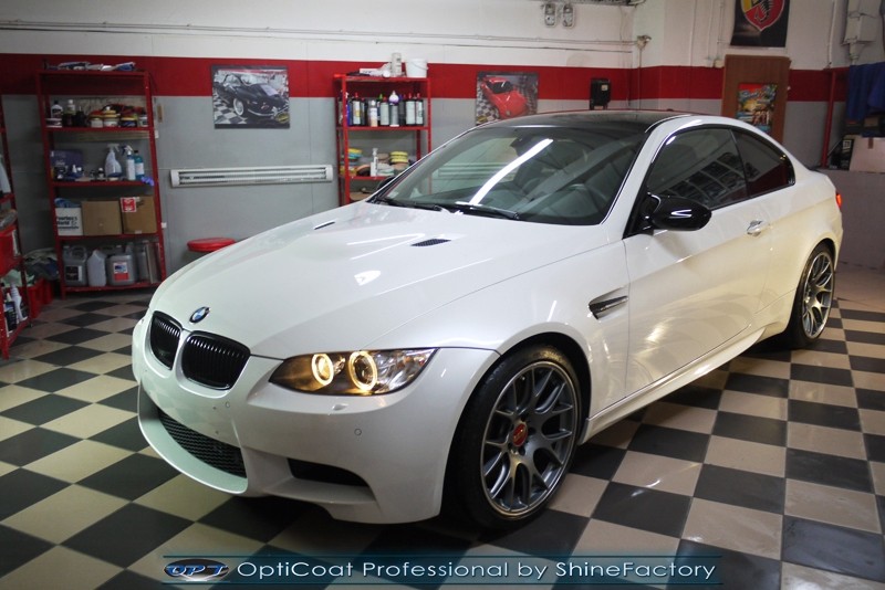 Tym razem chcemy zaprosić Państwa do fotorelacji z zabezpieczenia pięknego BMW M3 w perłowym białym lakierze. Właścicielowi zależało na możliwie najlepszemu zabezpieczeniu auta. Standardowo prace zaczęliśmy od dogłębnego oczyszczenia całego nadwozia, jest to konieczne do prawidłowego przebiegu dalszych prac. BMW posiadające niewielki przebieg musiało przejść delikatną korektę lakieru aby uwidocznić piękno perłowego lakieru oraz przygotować odpowiednio powierzchnię pod aplikację powłoki ceramicznej. Po korekcie, odtłuszczeniu i przygotowaniu powierzchni całe auto zostało zabezpieczone pakietem powłok ceramicznych/kwarcowych a sam lakier naszą topową powłoką ochronną Optimum OptiCoat Professional. Powłoka nadała finalny efekt oblania szkłem oraz idealnych właściwości ochronnych. Przeprowadziliśmy także pełen pakiet detailingu wnętrza które wraz ze skórami zostało oczyszczone i zabezpieczone odpowiednimi kosmetykami. Zapraszamy do fotorelacji!