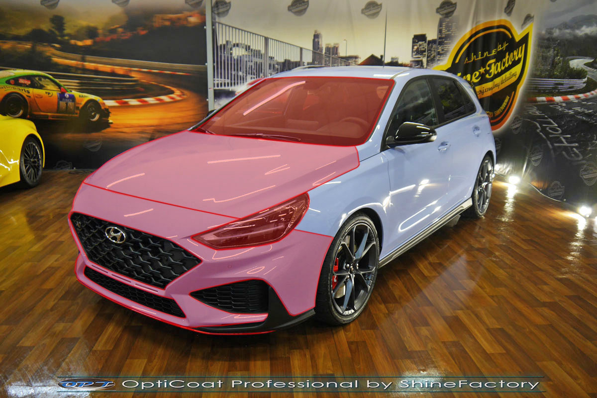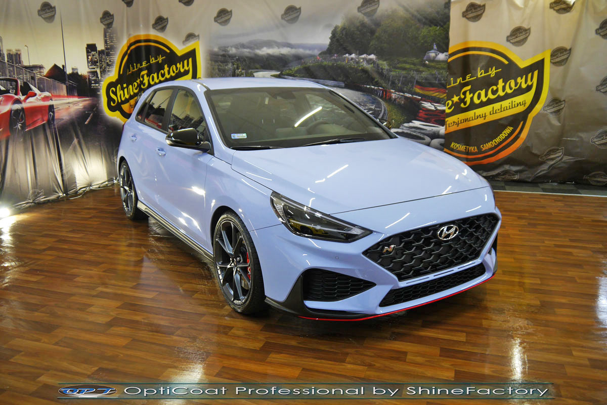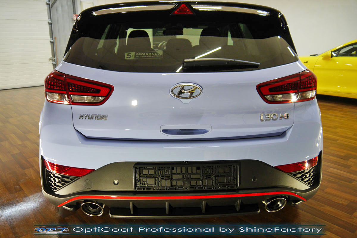 Połączenie bezbarwnych samo-regeneracyjnych folii oraz powłok ceramicznych staje się powoli standardem w idealnym zabezpieczeniu nowego auta. Tym razem mieliśmy przyjemność zająć się Hyundai'em i30N z praktycznie zerowym przebiegiem. Auto zostało przez nas maksymalnie zabezpieczone przed wszystkimi możliwymi uszkodzeniami. Wykorzystane do tego zostały najlepsze na rynku bezbarwne folie ochronne SunTek Ultra PPF oraz natryskowa ceramika OptiCoat PRO. Oczywiście prace rozpoczęliśmy od dokładnego oczyszczenia całego nadwozia z naleciałości oraz delikatnej korekty lakieru w celu usunięcia potransportowych/posalonowych niedoskonałości. Następnie przystąpiliśmy do aplikacji bezbarwnych folii ochronnych na najbardziej narażone na mocne uszkodzenia el. auta, oczywiście zdecydowaliśmy się jak zawsze wybrać produkt bezkonkurencyjny i nowoczesny na rynku, czyli folie regeneracyjne SunTek Ultra PPF. Po aplikacji folii przeszliśmy do zabezpieczania wszelkich el. auta powłokami, zaaplikowaliśmy w natryskowy sposób grubą warstwę powłoki 9H+ Optimum OptiCoat Professional potwierdzoną testami TUV, pokrywając ją dla maksymalnego efektu wizualnego powłoką GlossCoat, która na końcu została utwardzona w odpowiedniej temp. lampami IR. Oczywiście zajęliśmy się, także zabezpieczeniem pakietem powłok wszelkich innych elementów jak szyby (Gtechniq G1), felgi (DLUX), lampy czy elementy nielakierowane, a także całe wnętrze wraz z zaimpregnowaniem delikatnych skór. Po kilkudziesięciu godzinach pracy i30 nabrało perfekcyjnego wyglądu, połysku oraz co najważniejsze najmocniejszej praktycznie pancernej ochrony na lata. Zapraszamy do szerokiej fotorelacji! Oklejone zostały przednie elementy auta głównie w celu ochrony przed mocnymi mechanicznymi uszkodzeniami jak np. odpryski od kamieni, piaskowanie od żwiru drogowego, mocniejszymi rysami, obiciami czy nawet drobnymi obcierkami parkingowymi. Dokładnie oklejone zostały: