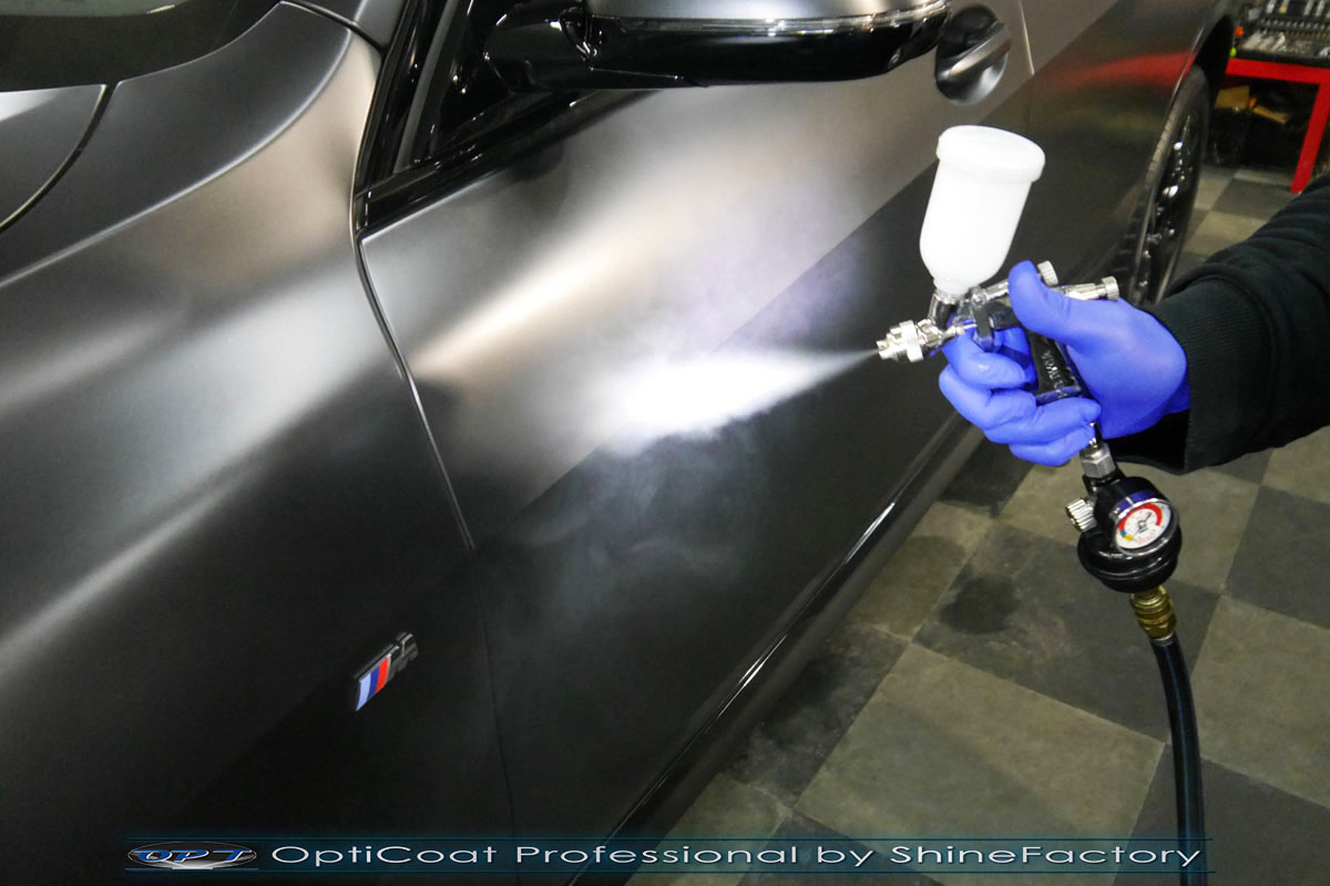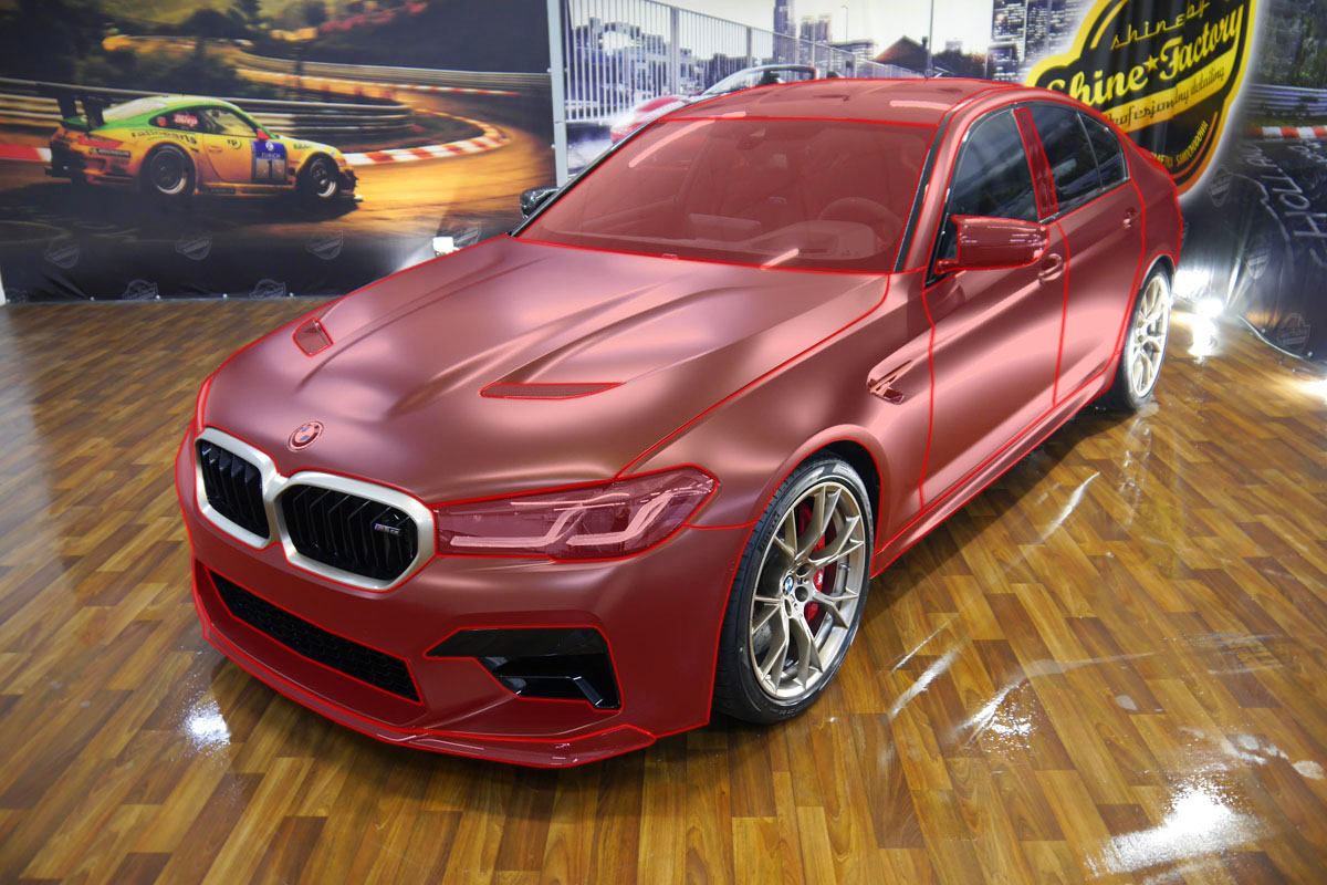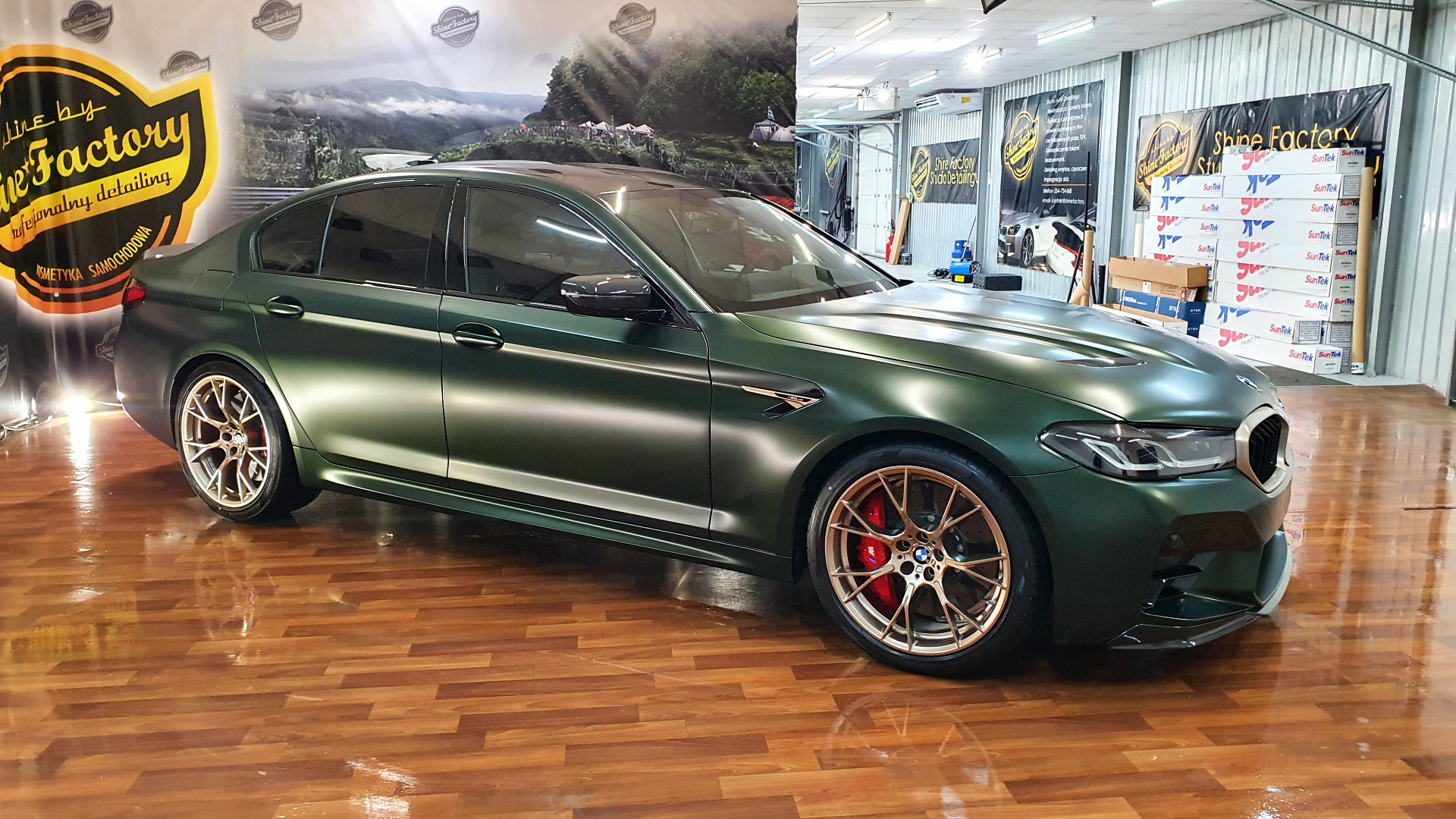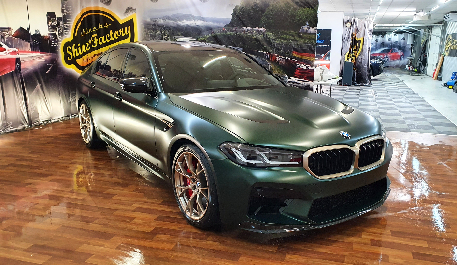 Połączenie bezbarwnych samo-regeneracyjnych folii oraz powłok ceramicznych staje się powoli standardem w idealnym zabezpieczeniu nowego auta. Tym razem mieliśmy przyjemność zająć się najmocniejszym BMW M5 w wersji CS. Auto zostało przez nas maksymalnie zabezpieczone przed wszystkimi możliwymi uszkodzeniami. Wykorzystane do tego zostały najlepsze na rynku bezbarwne folie ochronne, tym razem zastosowaliśmy wersję satynową i uzyskaliśmy efekt zmrożenia. Oczywiście prace rozpoczęliśmy od dokładnego przygotowania auta do aplikacji folii, następnie przystąpiliśmy do ich montażu na najbardziej narażone na mocne uszkodzenia el. auta, oczywiście zdecydowaliśmy się jak zawsze wybrać produkt bezkonkurencyjny i sprawdzony od lat. Po aplikacji folii przeszliśmy do zabezpieczania wszelkich el. auta powłokami, zaaplikowaliśmy w natryskowy sposób grubą warstwę powłoki 9H+ Optimum OptiCoat Professional potwierdzoną testami TUV, pokrywając ją dla maksymalnego efektu wizualnego powłoką GlossCoat, która na końcu została utwardzona w odpowiedniej temp. lampami IR. Oczywiście zajęliśmy się, także zabezpieczeniem pakietem powłok wszelkich innych elementów jak szyby (Gtechniq G1), felgi (DLUX), lampy czy elementy nielakierowane, a także całe wnętrze wraz z zaimpregnowaniem delikatnych skór. Po kilkudziesięciu godzinach pracy BMW nabrało perfekcyjnego wyglądu, połysku oraz co najważniejsze najmocniejszej praktycznie pancernej ochrony na lata. Zapraszamy do szerokiej fotorelacji! Oklejone zostały elementy auta głównie w celu ochrony przed mocnymi mechanicznymi uszkodzeniami jak np. odpryski od kamieni, piaskowanie od żwiru drogowego, mocniejszymi rysami, obiciami czy nawet drobnymi obcierkami parkingowymi. Dokładnie oklejone zostały: