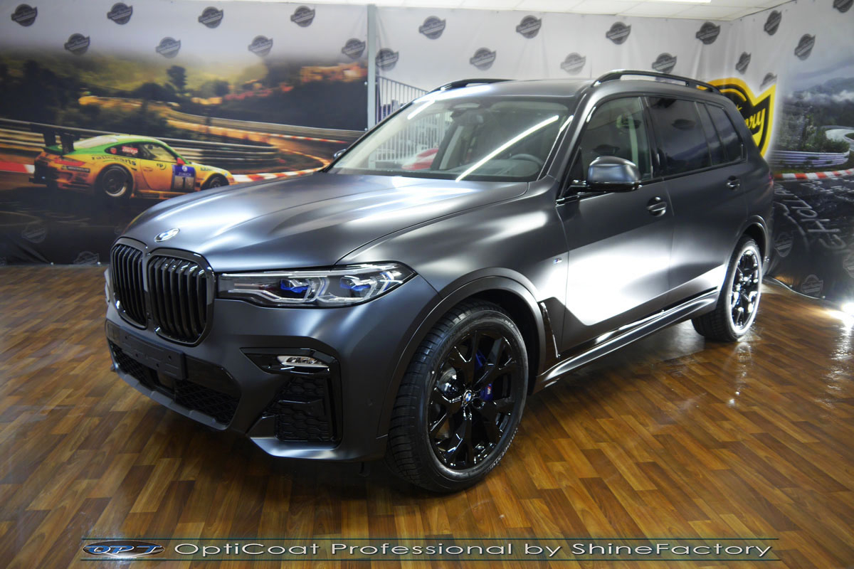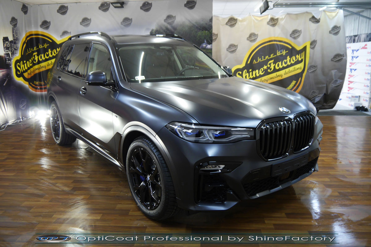 Witamy. Tym razem chcemy przedstawić fotorelację z prac nad salonowo nowym BMW X7, które trafiło do nas w celu zabezpieczenia delikatnego matowego lakieru pakietem powłok ceramicznych, szczególnie na zbliżające się coraz gorsze warunki atmosferyczne oraz sól na drogach. Prace nad nadwoziem rozpoczęliśmy od dokładnego oczyszczenia i odtłuszczenia. Po tych czynnościach przeszliśmy do aplikacji powłok na wszelkie elementy jak lakier, szyby (bezapelacyjnie najlepszą powłoką Gtechniq G1), felgi (pancerny CQ DLUX), detale itp itd. Najważniejsze, na sam lakier zaaplikowaliśmy maksymalnie grubą natryskową warstwę kompozytu ceramicznego (100% powłoki na aucie) opartego na SiC- OptiCoat Professional połączoną z powłoką GlossCoat, która zapewni ochronę, zminimalizowane brudzenie oraz ułatwione do maksimum mycie. Całe wnętrze zostało zaimpregnowane kosmetykami najwyższej ligi, z naciskiem na el. plastikowe, delikatne skóry i el. z alkantary. Dzięki detailingowi oraz finalnemu pokryciu ceramiką auto przez długi czas będzie cieszyło oko idealną prezentacją lakieru. Zapraszamy do szerokiej fotorelacji i zdjęć efektu końcowego!