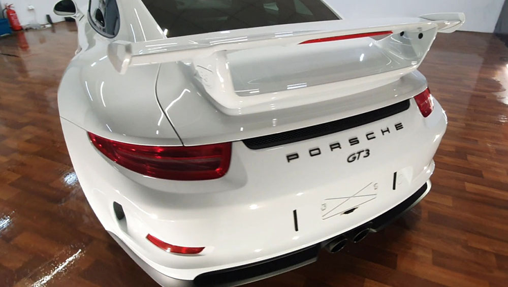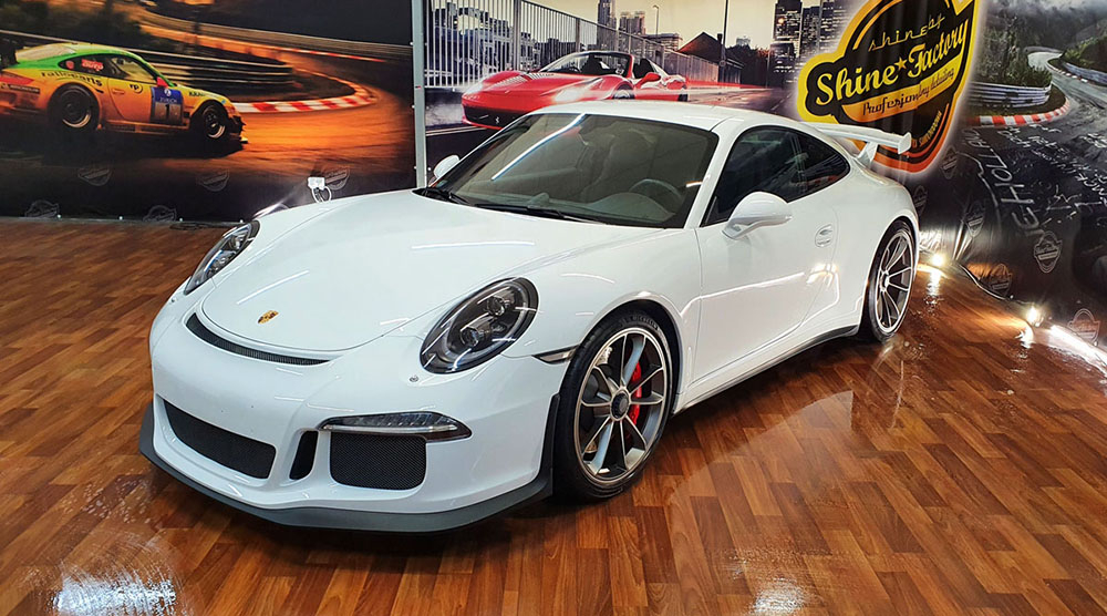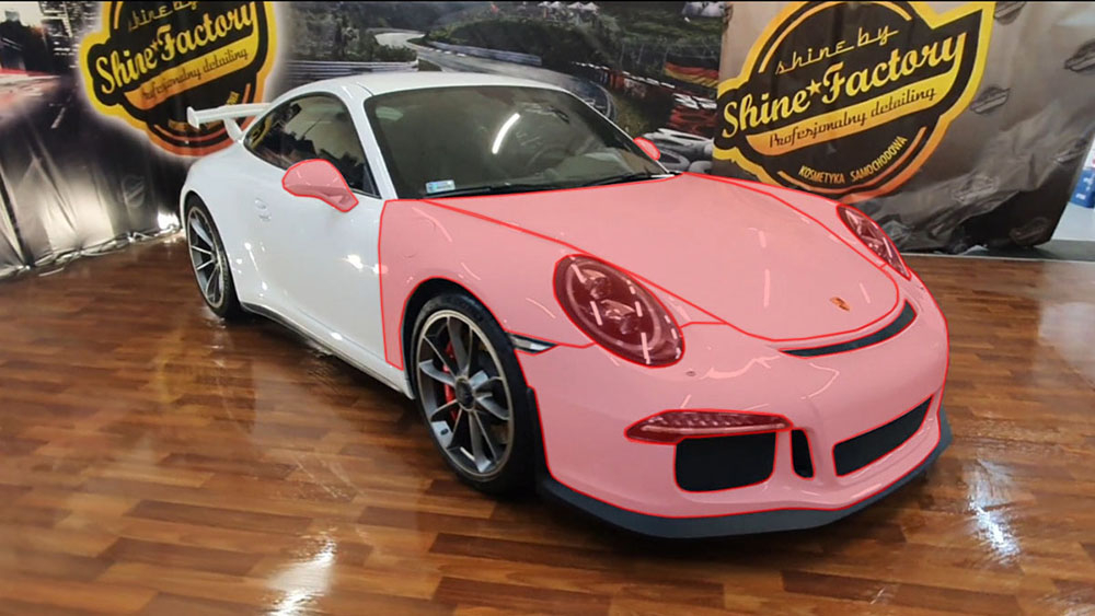 Połączenie bezbarwnych samo-regeneracyjnych folii oraz powłok ceramicznych staje się powoli standardem w idealnym zabezpieczeniu nowego auta. Tym razem mieliśmy przyjemność zająć się Porsche GT3 z symbolicznym przebiegiem. Auto zostało przez nas maksymalnie zabezpieczone przed wszystkimi możliwymi uszkodzeniami. Wykorzystane do tego zostały najlepsze na rynku bezbarwne folie ochronne SunTek Ultra PPF oraz natryskowa ceramika OptiCoat PRO. Oczywiście prace rozpoczęliśmy od dokładnego oczyszczenia całego nadwozia z naleciałości oraz delikatnej korekty lakieru w celu usunięcia niedoskonałości. Następnie przystąpiliśmy do aplikacji bezbarwnych folii ochronnych na najbardziej narażone na mocne uszkodzenia el. auta, oczywiście zdecydowaliśmy się jak zawsze wybrać produkt bezkonkurencyjny i nowoczesny na rynku, czyli folie regeneracyjne SunTek Ultra PPF. Po aplikacji folii przeszliśmy do zabezpieczania wszelkich el. auta powłokami, zaaplikowaliśmy w natryskowy sposób grubą warstwę powłoki 9H+ Optimum OptiCoat Professional potwierdzoną testami TUV, pokrywając ją dla maksymalnego efektu wizualnego powłoką GlossCoat, która na końcu została utwardzona w odpowiedniej temp. lampami IR. Oczywiście zajęliśmy się, także zabezpieczeniem pakietem powłok wszelkich innych elementów jak szyby (Gtechniq G1), felgi (DLUX), lampy czy elementy nielakierowane, a także całe wnętrze wraz z zaimpregnowaniem delikatnych skór. Po kilkudziesięciu godzinach pracy Porsche nabrało perfekcyjnego wyglądu, połysku oraz co najważniejsze najmocniejszej praktycznie pancernej ochrony na lata. Zapraszamy do szerokiej fotorelacji! Oklejone zostały przednie elementy auta głównie w celu ochrony przed mocnymi mechanicznymi uszkodzeniami jak np. odpryski od kamieni, piaskowanie od żwiru drogowego, mocniejszymi rysami, obiciami czy nawet drobnymi obcierkami parkingowymi. Dokładnie oklejone zostały: