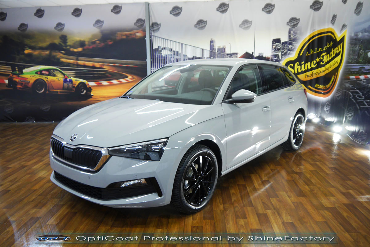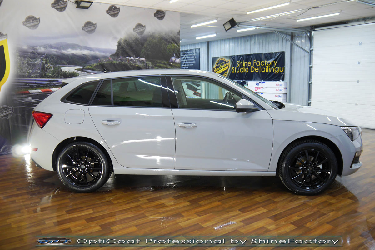 Witamy. Tym razem chcemy przedstawić fotorelację z prac nad salonowo nową Skoda, która trafiła do nas w celu zabezpieczenia lakieru pakietem powłok ceramicznych. Prace nad nadwoziem rozpoczęliśmy od dokładnego oczyszczenia i odtłuszczenia, następnie lakier przeszedł delikatną korektę w celu usunięcia po salonowych niedoskonałości. Po tych czynnościach przeszliśmy do aplikacji powłok na wszelkie elementy jak lakier, szyby (bezapelacyjnie najlepszą powłoką Gtechniq G1), felgi (pancerny CQ DLUX), detale itp itd. Najważniejsze, na sam lakier zaaplikowaliśmy maksymalnie grubą natryskową warstwę kompozytu ceramicznego (100% powłoki na aucie) opartego na SiC- OptiCoat Professional połączoną z powłoką GlossCoat, która zapewni ochronę, zminimalizowane brudzenie oraz ułatwione do maksimum mycie. Dzięki detailingowi oraz finalnemu pokryciu ceramiką auto przez długi czas będzie cieszyło oko idealną prezentacją lakieru. Zapraszamy do szerokiej fotorelacji i zdjęć efektu końcowego!