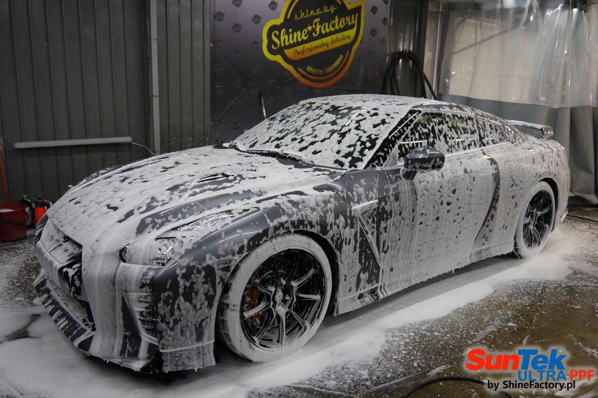 Zabezpieczenie frontów aut bezbarwnymi foliami ochronnymi staje się powoli standardem, coraz częściej także zabezpieczane w ten sposób są auta w całości co daje do tego czasu nieosiągalne perfekcyjne zabezpieczenie i efekt wizualny. Tym razem mieliśmy przyjemność zająć się Nissanem GTR, który przyjechał do nas z zerowym przebiegiem na lawecie wprost z salonu. Decyzja wz. z zabezpieczeniem padła na bezkompromisowe połączanie znakomitych bezbarwnych folii ochronnych SunTek Ultra PPF z 10 letnią gwarancją oraz pakietu powłok ceramicznych. Standardowo prace zaczęliśmy od bardzo dokładnego oczyszczenia nadwozia z wszelkich naleciałości. Kolejno zajęliśmy się inspekcją lakieru oraz doprowadzeniem go do możliwej perfekcji. Po przygotowaniu przeszliśmy do zabezpieczenia każdego cm auta, najpierw aplikując bezbarwne folie ochronne. Folie zazwyczaj aplikuje się na najbardziej narażone el. auta jak przód, tym razem zdecydowaliśmy się praktycznie całe auto pokryć najlepszymi na świecie regeneracyjnymi foliami SunTek Ultra aby uzyskać 100% ochronę lakieru, który będzie całkowicie izolowany od środowiska zewnętrznego i nic nie będzie wstanie go uszkodzić. Po aplikacji folii przeszliśmy do zabezpieczania wszelkich el. auta powłokami, zaaplikowaliśmy pakiet powłok na całe auto, folie, szyby (Gtechniq G1), felgi (DLUX), elementy nielakierowane, a także całe wnętrze wraz z zaimpregnowaniem delikatnych skór. Po kilkudziesięciu godzinach pracy GTR nabrał perfekcyjnego wyglądu, połysku oraz co najważniejsze najmocniejszej praktycznie pancernej ochrony na lata. Zapraszamy do szerokiej fotorelacji!
