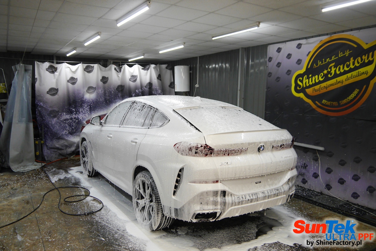 Zabezpieczenie frontów aut bezbarwnymi foliami ochronnymi stało się już praktycznie standardem, natomiast coraz częściej także zabezpieczane w ten sposób są auta w całości co daje do tego czasu nieosiągalne perfekcyjne zabezpieczenie i efekt wizualny. Tym razem mieliśmy przyjemność zająć się BMW X6, które przyjechało do nas wprost z salonu. Decyzja wz. z zabezpieczeniem padła na bezkompromisowe połączanie znakomitych bezbarwnych folii ochronnych SunTek Ultra PPF z 10 letnią gwarancją oraz pakietu powłok ceramicznych. Standardowo prace zaczęliśmy od bardzo dokładnego oczyszczenia nadwozia z wszelkich naleciałości. Kolejno zajęliśmy się inspekcją lakieru oraz doprowadzeniem go do możliwej perfekcji. Po przygotowaniu przeszliśmy do zabezpieczenia każdego cm auta, najpierw aplikując bezbarwne folie ochronne. Folie zazwyczaj aplikuje się na najbardziej narażone el. auta jak przód, tym razem zdecydowaliśmy się praktycznie całe auto pokryć najlepszymi na świecie regeneracyjnymi foliami SunTek Ultra aby uzyskać 100% ochronę lakieru, który będzie całkowicie izolowany od środowiska zewnętrznego i nic nie będzie wstanie go uszkodzić. Po aplikacji folii przeszliśmy do zabezpieczania wszelkich el. auta powłokami, zaaplikowaliśmy pakiet powłok na całe auto, folie, szyby (Gtechniq G1), felgi (DLUX), elementy nielakierowane, a także całe wnętrze wraz z zaimpregnowaniem delikatnych skór. Po kilkudziesięciu godzinach pracy BMW nabrało perfekcyjnego wyglądu, połysku oraz co najważniejsze najmocniejszej praktycznie pancernej ochrony na lata. Zapraszamy do szerokiej fotorelacji!