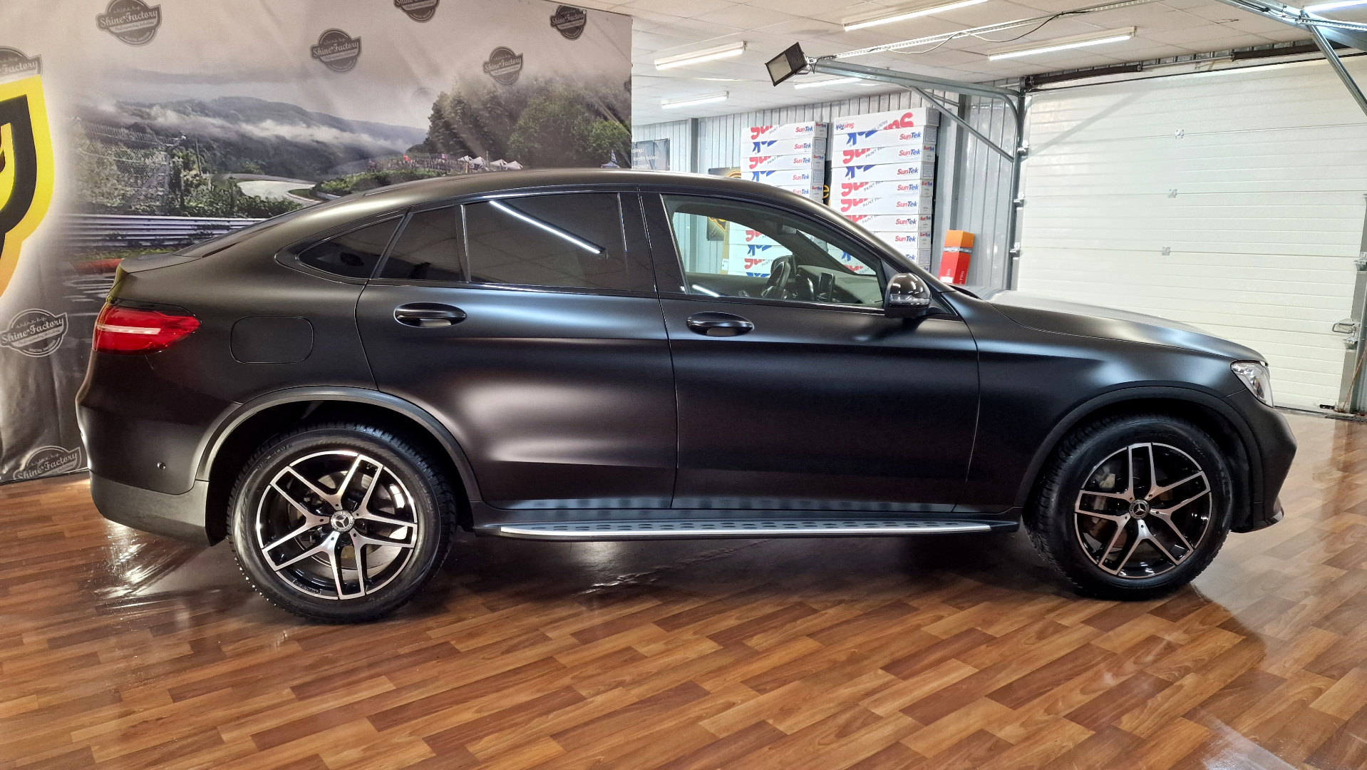Zapraszamy także wszystkich, którzy chcą odmienić wizualnie swoje auto. Tutaj przykładowa zmiana koloru Mercedesa GLC z koloru czerwonego na satynowy czarny. Dodatkowo kilka elementów zostało oklejone na czarny połysk.