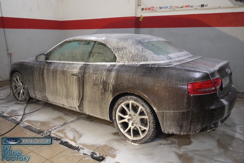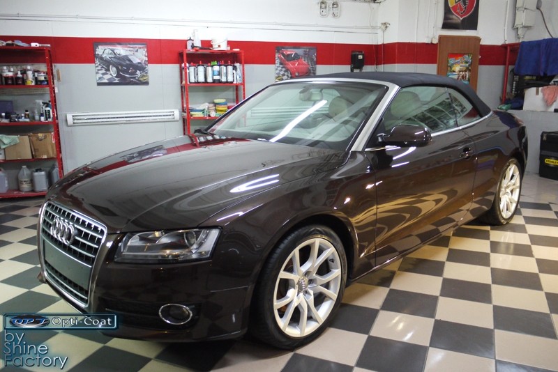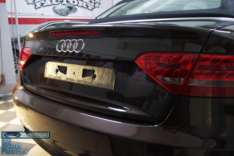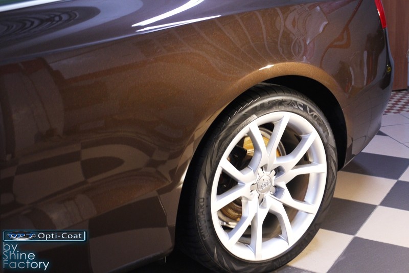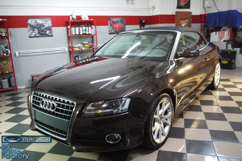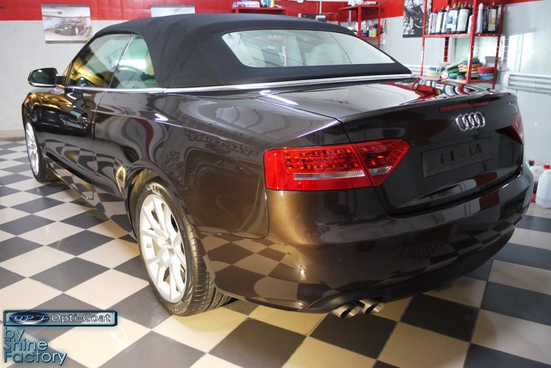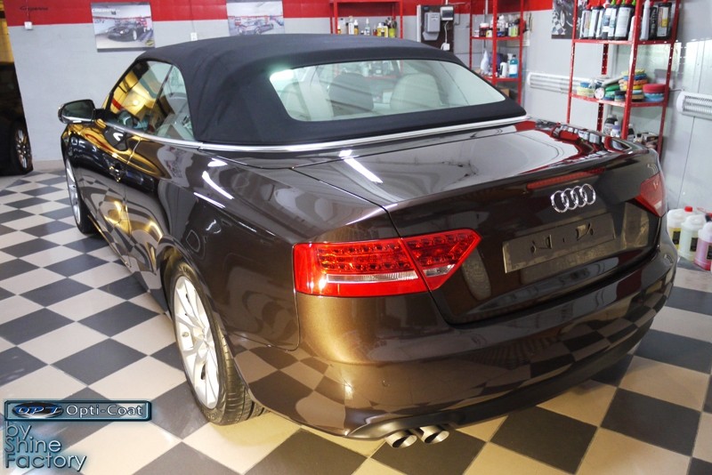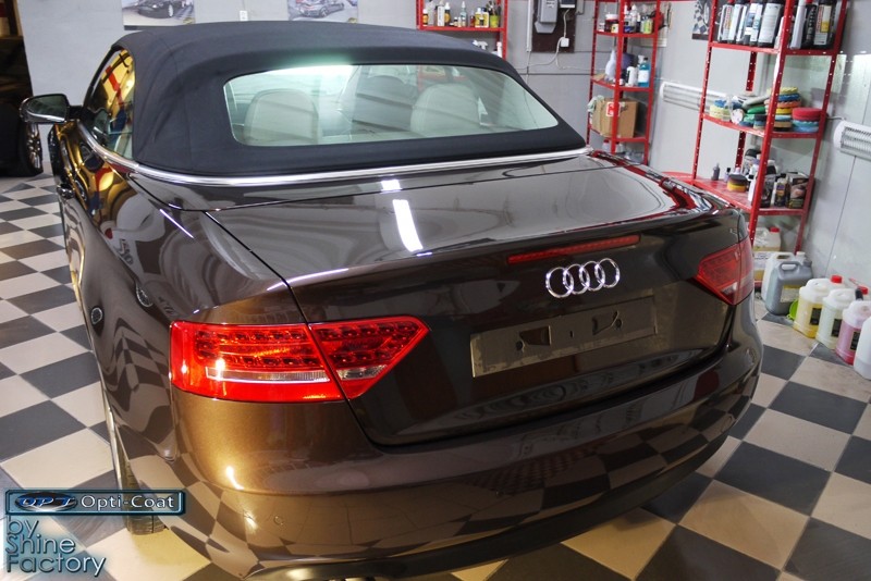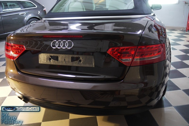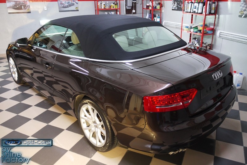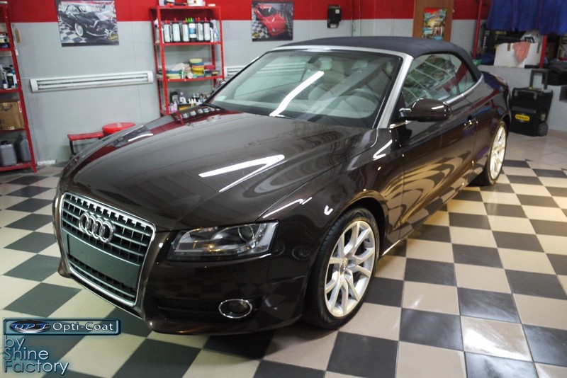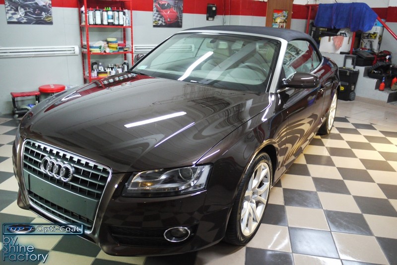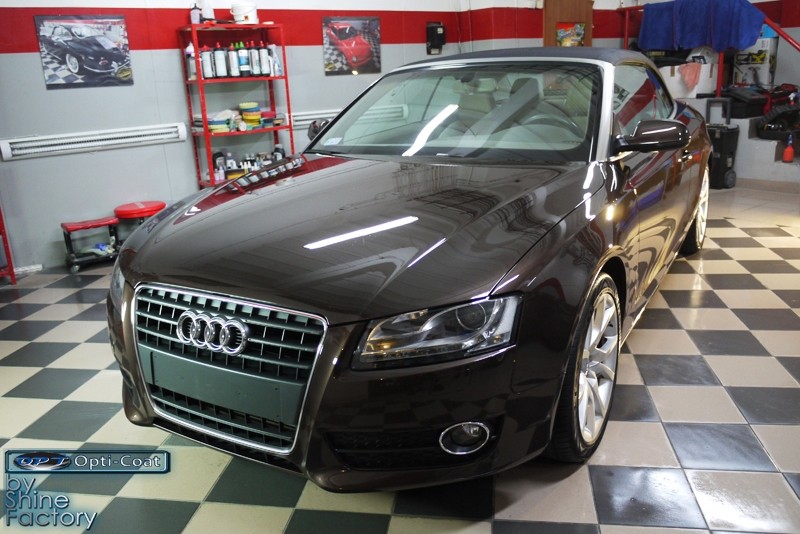 Witamy. Dziś chcemy zaprezentować Wam fotorelację z prac nad Aud A5 w nadwoziu cabrio. Po dokładnym i dogłębnym oczyszczeniu całego nadwozia i kół, przeprowadziliśmy pełną renowację lakieru i usunęliśmy z niego wszelkie niedoskonałości, zmatowienia i mikrorysy, dzięki czemu mocno odmieniliśmy wygląd pięknego brązowego lakieru. Po kilku dniach korekty lakier został finalnie zabezpieczony bardzo dobrą powłoką ceramiczną OptiCoat 2.0, koła trwałą powłoką kwarcową, a po zadbaniu i zabezpieczeniu wszelkich innych elementów jak szyby, klosze lamp, elementy chromowe itp, auto nabrało idealnej trwałej prezentacji. Oczywiście nie zapomnieliśmy o zaimpregnowaniu dachu produktami opartymi na nanotechnologii. To wszystko zobaczycie w fotorelacji, zapraszamy!