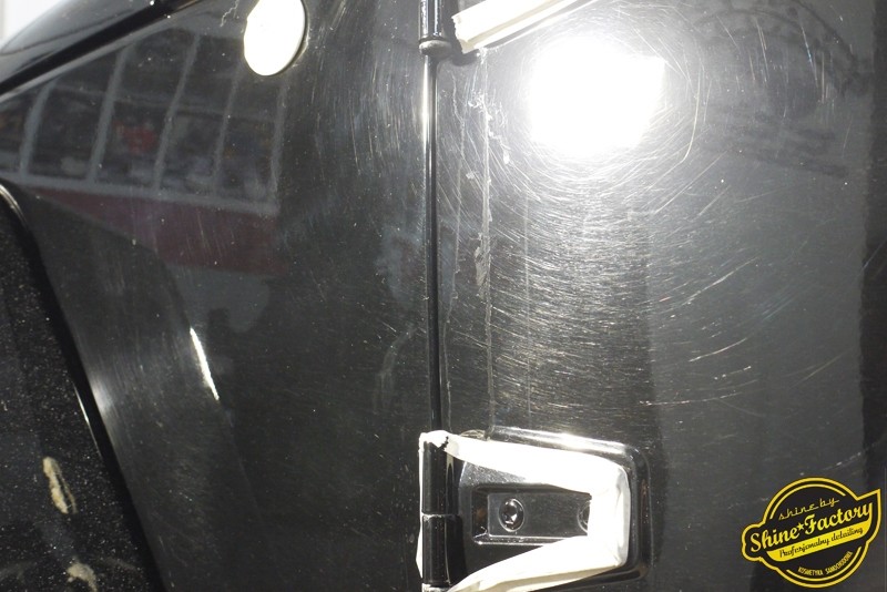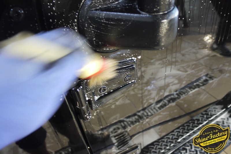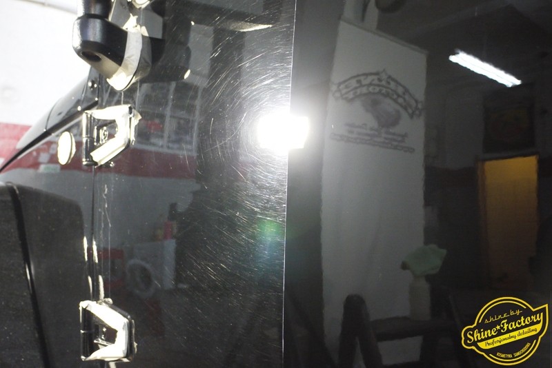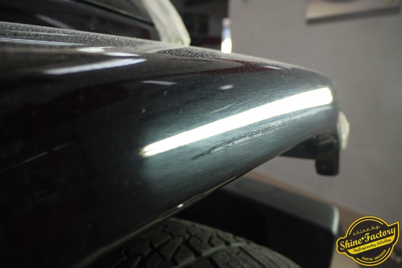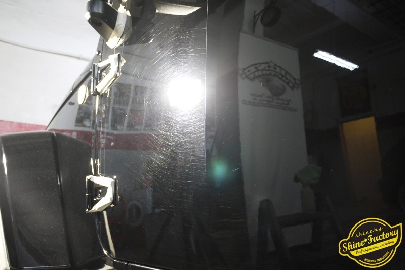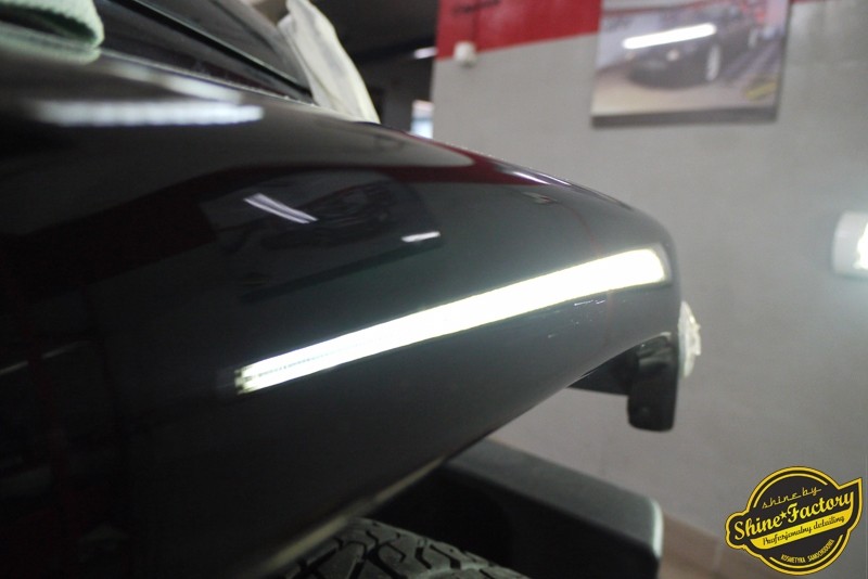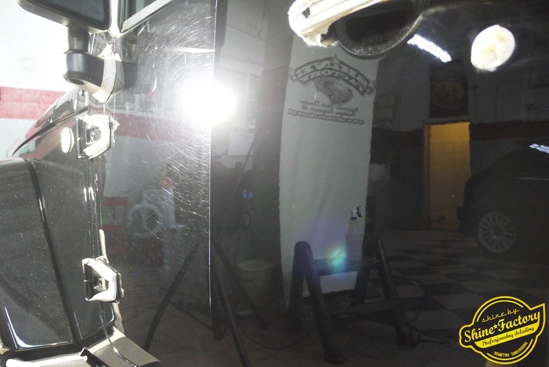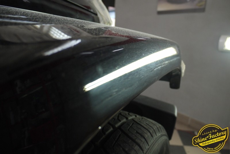 Zapraszamy do relacji z detailingu bardzo ciekawego auta jakim jest Jeep Wrangler. Egzemplarz którym mieliśmy przyjemność się zająć posiadał czarny niemetaliczny lakier, który w trakcie korekty ze zniszczonego szarego zmienił się w piękną głęboką czerń. Oczywiście zaczęliśmy od dokładnego oczyszczenia całego nadwozia oraz wszystkich detali i elementów auta. Było to konieczne przed prawidłową korektą, następnie podczas renowacji staraliśmy się dotrzeć do wszelkich zakamarków i usunąć zmatowienie/mikrorysy oraz uzyskać głęboka czerń bez najmniejszej skazy. Po wymagającej korekcie na lakier zaaplikowaliśmy naszą topową powłokę ceramiczną Professional posiadającą certyfikat TUV oraz wygrzaliśmy dodatkowo lampi IR w odpowiedniej temperaturze co zapewni wieloletnią ochronę, piękny wygląd oraz ułatwione do maksimum mycie auta. Prócz samego lakieru zajęliśmy się mnóstwem innych detali, odświeżyliśmy winylowe szyby, odżywiliśmy materiałowy dach, usunęliśmy z przednich szyb głębokie pojedyncze rysy oraz oczywiście zabezpieczyliśmy wszelkie inne el. nielakierowane, opony, el. chromowane, matowe felgi itp itd. Po kilku dniach prac auto nabrało perfekcyjnej prezentacji, zapraszamy do szerokiej fotorelacji!