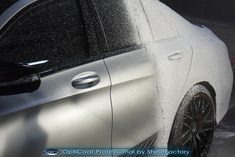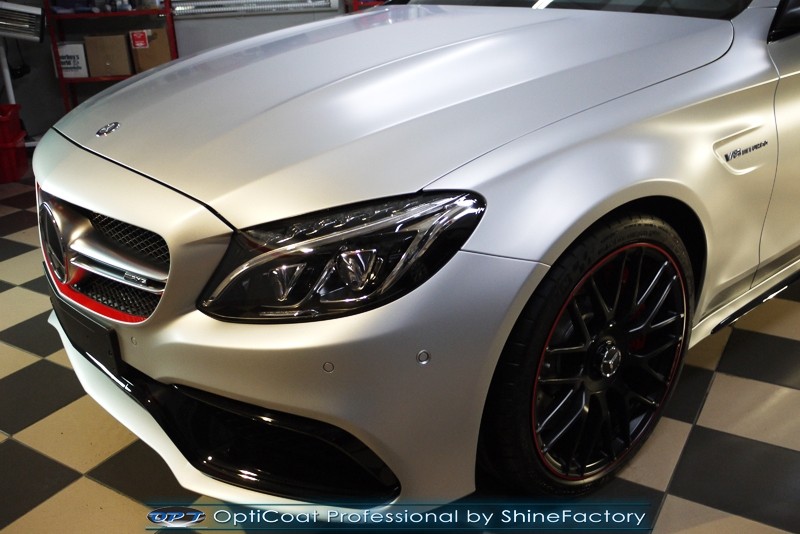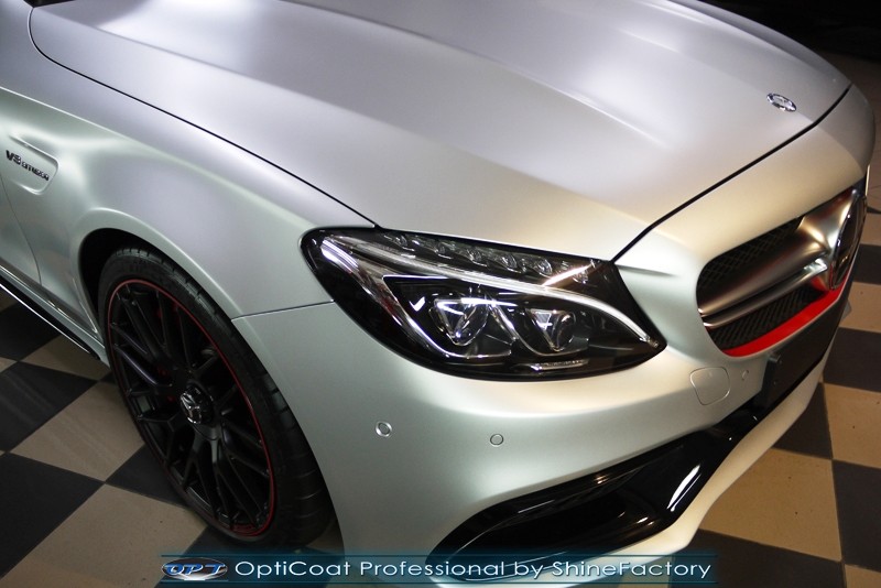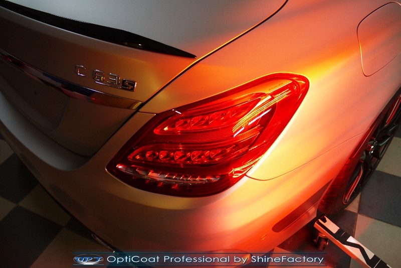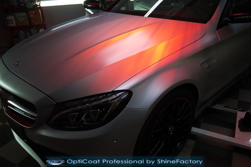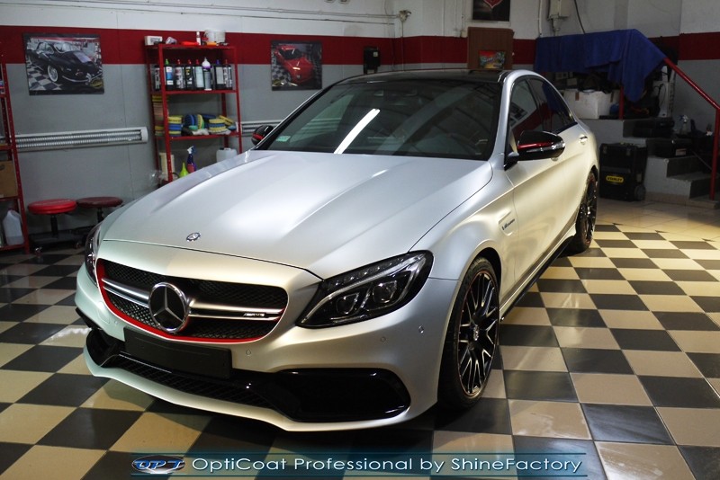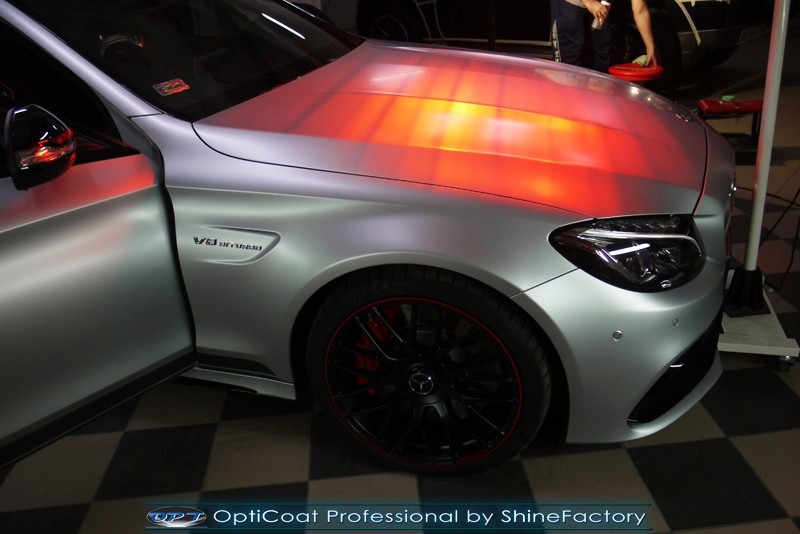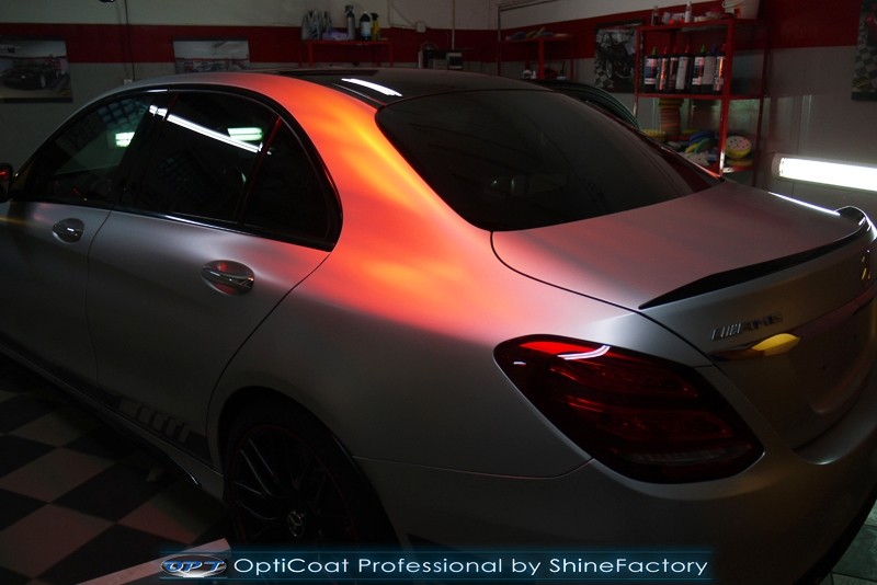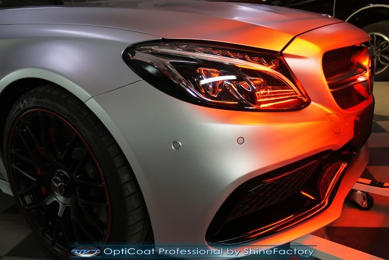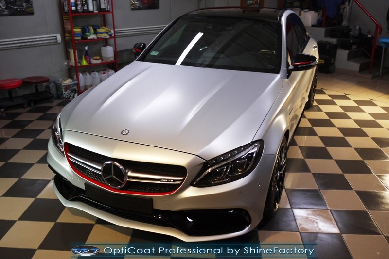Witamy! Dziś zapraszamy do szerokiej fotorelacji z zabezpieczenia najnowszego modelu Mercedesa C63 AMG S Edition 1 w specyficznym matowym lakierze IridiumSilber. Wymagane było maksymalnie dobre zabezpieczenie każdego detalu auta w pakiecie NewShine. Zdecydowaliśmy się zabezpieczyć każdy element auta (szyby, chromy, felgi, klosze lamp, detale itp) najlepszymi powłokami ceramicznymi/kwarcowymi z rynku, sam lakier testowaną w laboratoryjny sposób przez TUV powłoką ceramiczną OptiCoat Professional. Oczywiście najpierw auto musiało zostać w specjalistyczny sposób dokładnie oczyszczone i poprawnie przygotowane pod aplikację powłoki. Następnie w po precyzyjnym zaaplikowaniu powłoki OC PRO lakier pokryliśmy dodatkową warstwą GlossCoat która zapewniła maksymalny efekt działania, śliskość lakieru na wiele lat. Finalnie pakiet powłok został wygrzany w odpowiedniej temperaturze lampami IR. Oczywiście całe wnętrze zostało zabezpieczone różnymi kosmetykami w najdrobniejszym detalu wraz z zaimpregnowaniem delikatnych skór. Nie zapomnieliśmy, także o zabezpieczeniu nadkoli, wnętrza felg czy komory silnika. Mercedes po kilku dniach prac nabrał maksymalnej możliwej ochrony co zapewni zminimalizowane brudzenie oraz banalne utrzymanie auta w perfekcyjnym stanie na wiele lat. Zapraszamy do szerokiej fotorelacji i zdjęć efektu końcowego!
