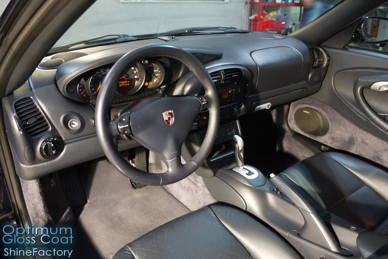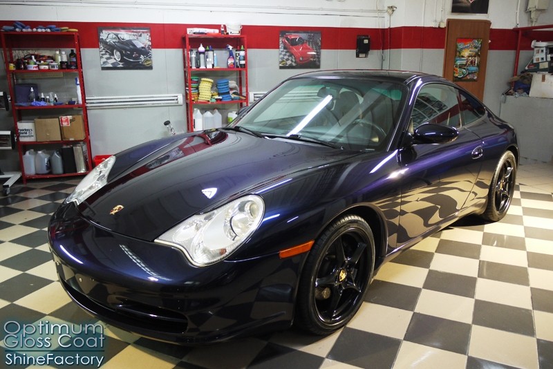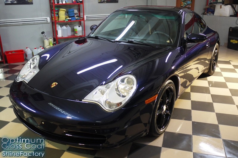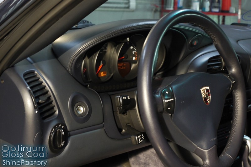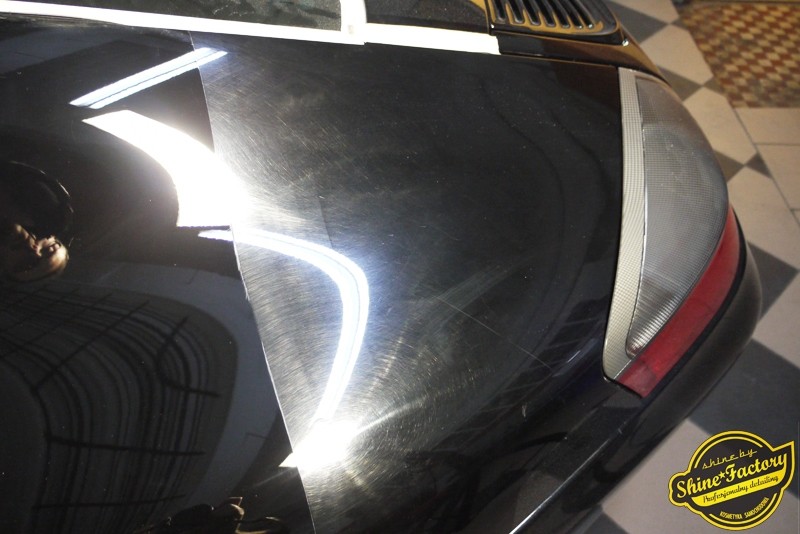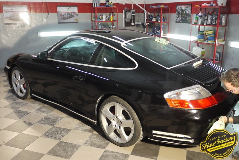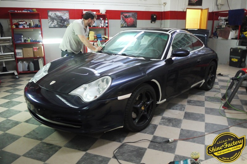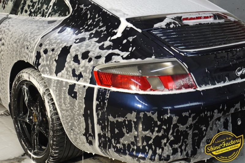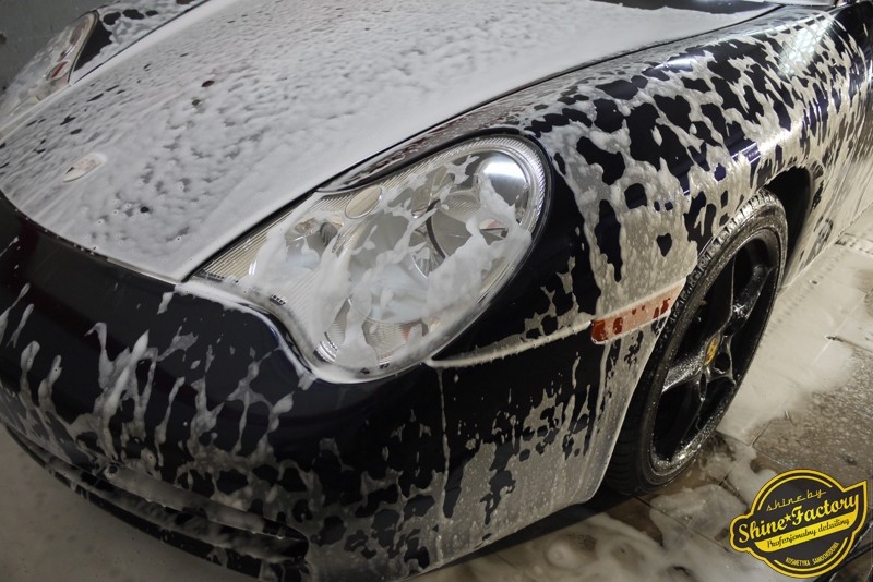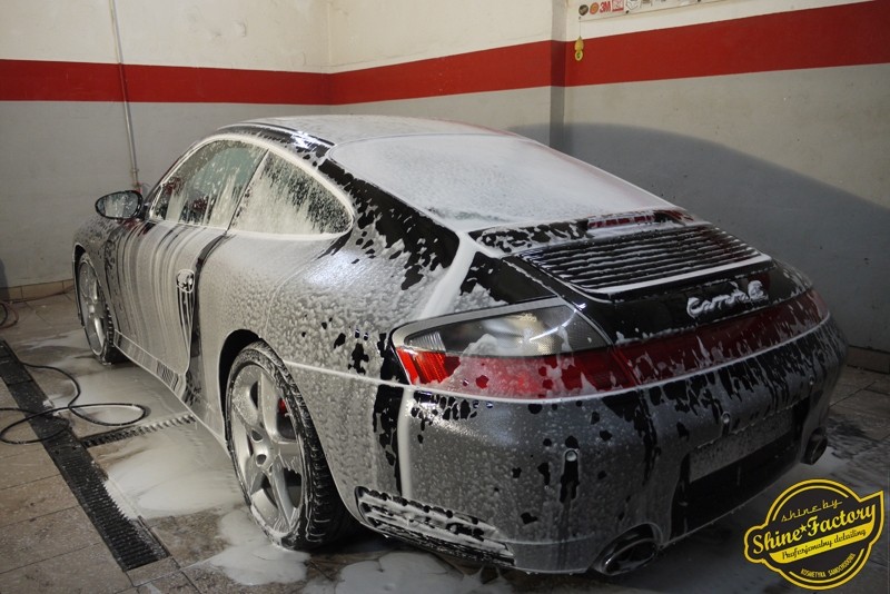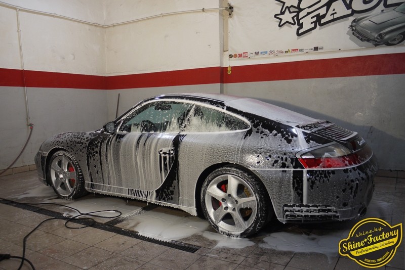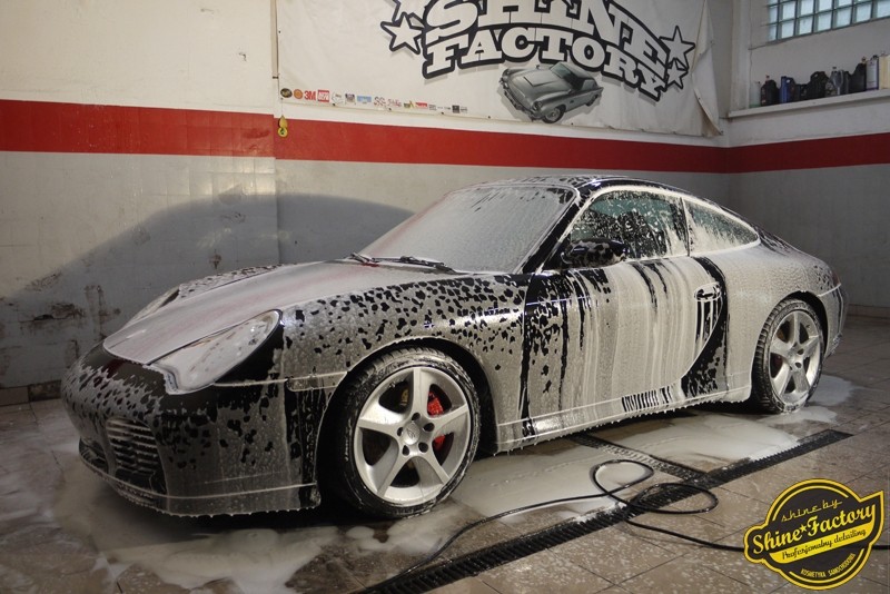 Tym razem chcemy zaprosić Was do pełnej fotorelacji z bardzo czaso i pracochłonnego projektu nad Porsche 996. Auto dotarło do nas w straszliwym stanie, czarny lakier stał się szaro-matowy, posiadał mnóstwo płytszych i głębszych zarysowań oraz ogólne bardzo mocne zmatowienie. Dość rzadki widok, wymagający b. dużego doświadczenia w pracach nad renowacją. Naszym zadaniem było przeprowadzenie maksymalnego pakietu prac, oczywiście doprowadzenie lakieru do idealnego stanu oraz zabezpieczenie najlepszym pakietem powłok ceramicznych. Standardowo rozpoczęliśmy od zdjęcia kół, detailingu nadkoli oraz felg oraz dogłębnego oczyszczenia całego nadwozia. Następnie przeszliśmy do kilkudniowej wielostopniowej korekty zmasakrowanego lakieru oraz wszystkich innych możliwych detali auta jak plastiki, klosze lamp, uszczelki itp. Po usunięciu wszelkich niedoskonałości na Porsche zaaplikowaliśmy pakiet powłok, sam lakier został zabezpieczony naszą topową powłoką Optimum Professional certyfikowaną przez TUV, oczywiście finalnie całe auto zostało utwardzone specjalnymi promiennikami. W międzyczasie prac z lakierem zajmowaliśmy się, także bardzo dokładnie mocno zabrudzonym wnętrzem, wypraliśmy ekstrakcyjnie podłogi, oczyściliśmy i zabezpieczyliśmy skóry i wszelkie inne elementy wnętrza. Nie zapomnieliśmy, także zająć się komorą silnika. Zapraszamy do obejrzenia pełnej fotorelacji z metamorfozy tego auta!