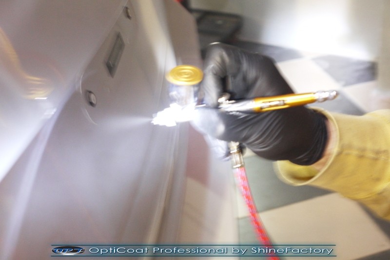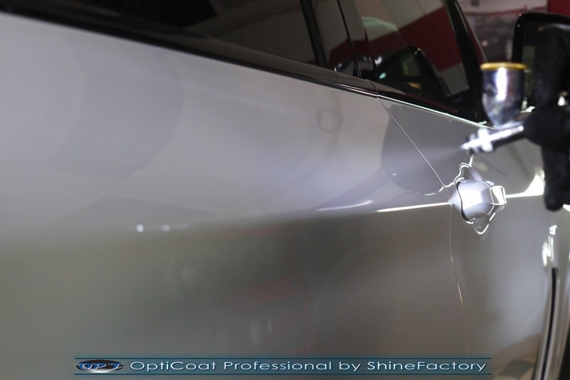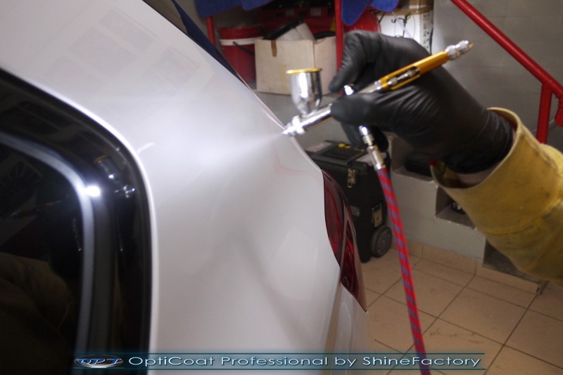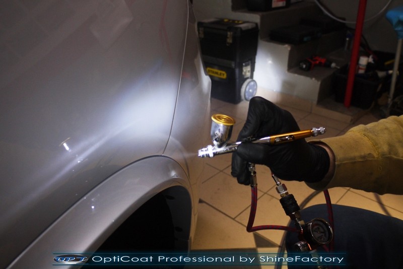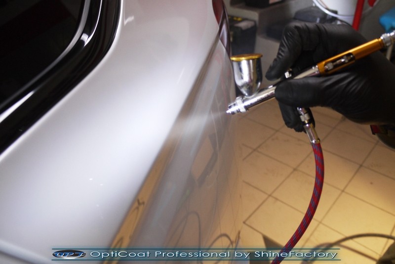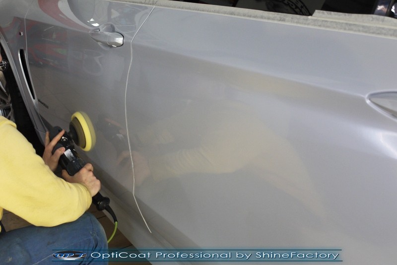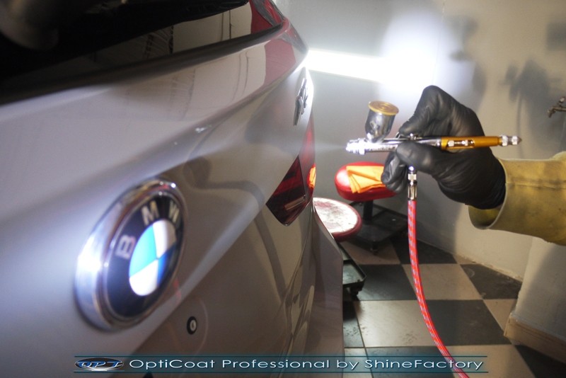 Najnowsze BMW X5, w niespotykanym pięknym indywidualnym lakierze zmieniającym barwę od jasno srebrnego w ciemno szary, zostało nam powierzone przez naszego stałego klienta w celu maksymalnie dobrego zabezpieczenia pakietem powłok. Prace zaczęliśmy od dokładnego i dogłębnego oczyszczenia z zabrudzeń oraz fabrycznych zabezpieczeń. Sam lakier ogólnie w bardzo dobrym stanie posiadał tylko miejscowe uszkodzenia, które delikatnie poprawiliśmy i mogliśmy spokojnie dokładnie odtłuścić lakier i przejść do aplikacji powłok na każdy element auta jak lakier, szyby, plastiki, felgi itp. Na całe auto głownie zaaplikowaliśmy w skomplikowany natryskowy sposób grubą warstwę kompozytu ceramicznego 9H+ opartego na SiC Optimum OptiCoat Professional połączoną z powłoką GlossCoat, która zapewniła maksymalny połysk i ochronę na wiele długich lat skutecznego działania. Po aplikacji, całe auto zostało wygrzane lampami IR w odpowiedniej temperaturze w celu utwardzenia powłok. Następnym naszym zadaniem było zaimpregnowanie całego wnętrza, głównie skupiając się na skórach które zostały zaimpregnowane kosmetykami najwyższej ligi przed nadmiernym brudzeniem oraz pękaniem. Zapraszamy do ciekawej fotorelacji.