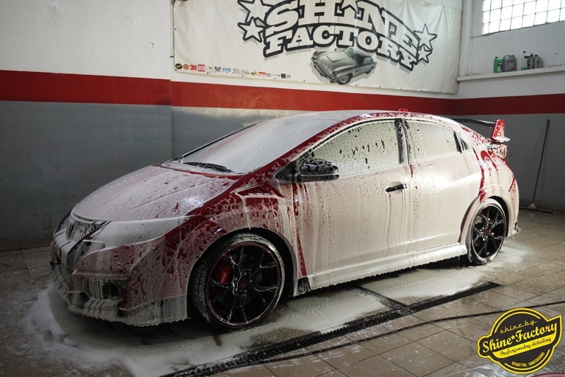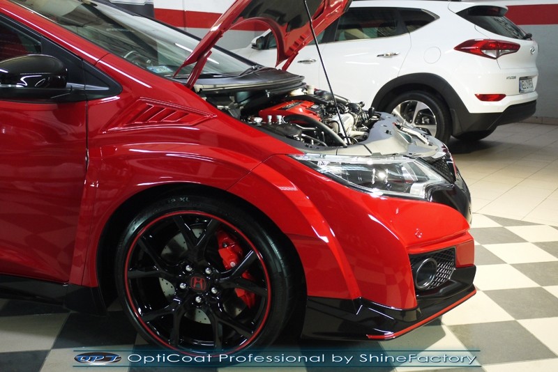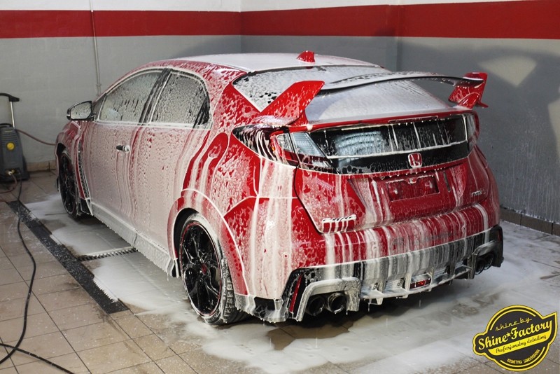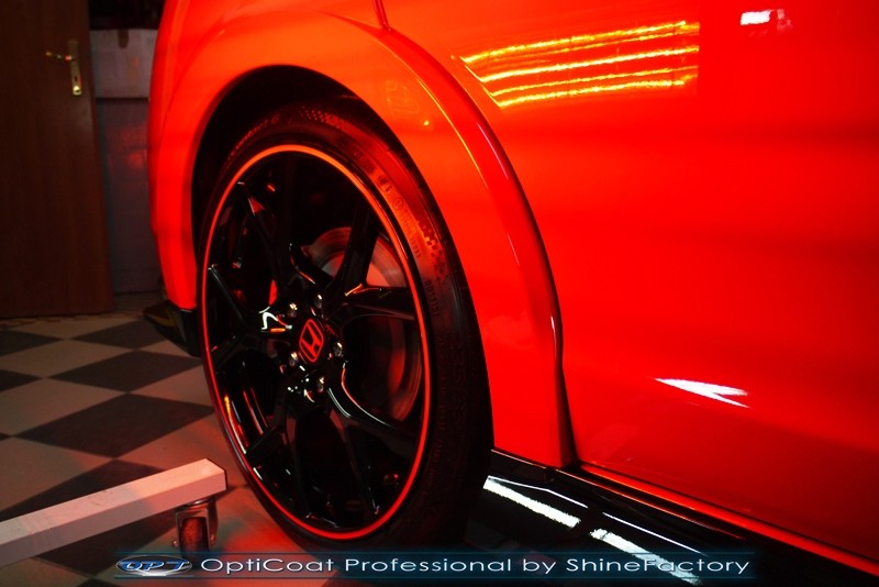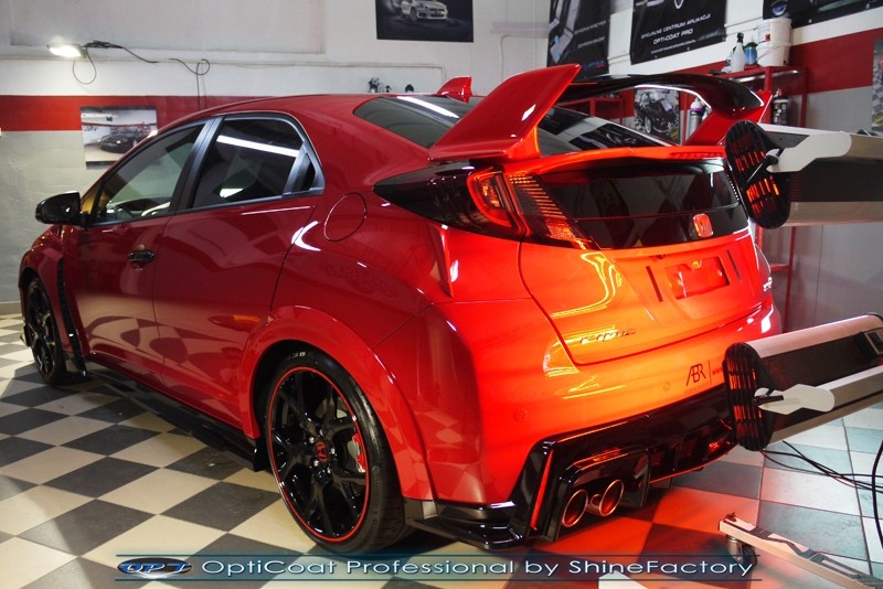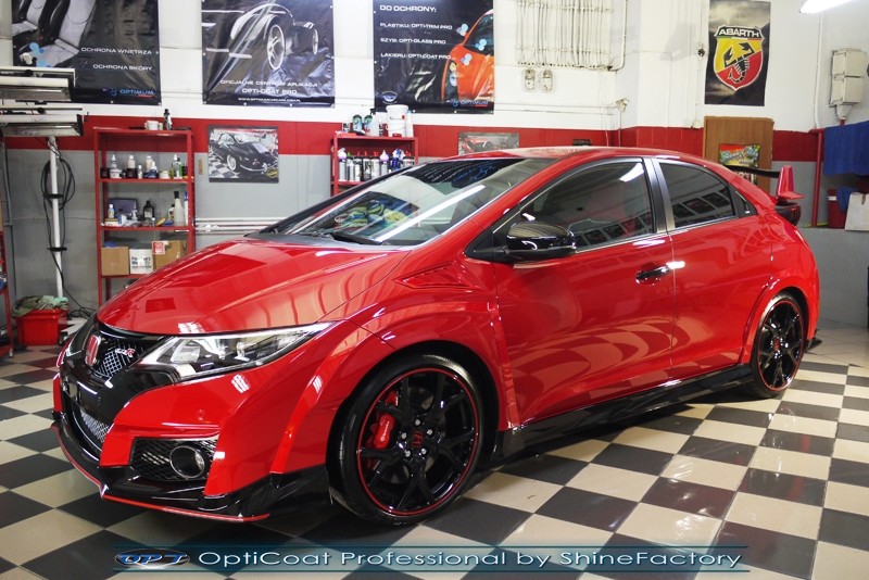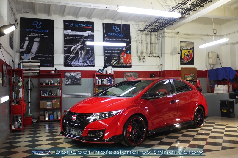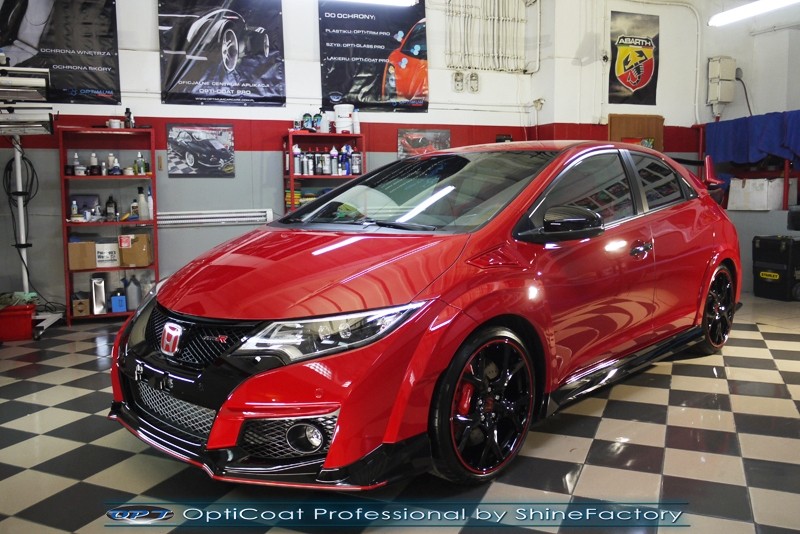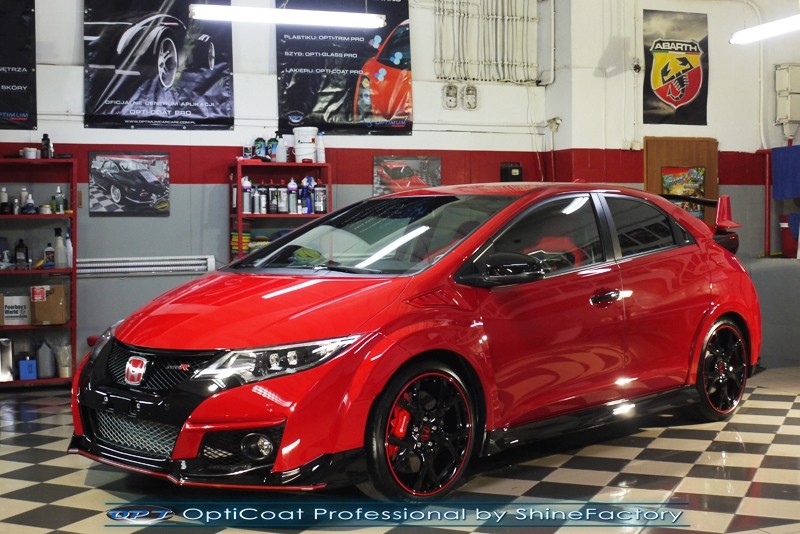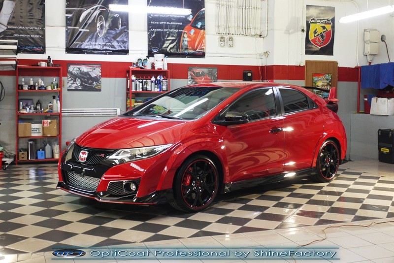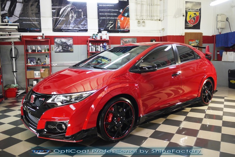 Witamy Was! Zapraszamy do relacji z zabezpieczenia febrycznie nowej, wściekle czerwonej Hondy Civic Typ-R! Auto trafiło do nas w celu szerokiego pakietu zabezpieczenia pakietem powłok ceramicznych. Oczywiście prace rozpoczęliśmy od ściągnięcia z auta kół i zajęcia się felgami oraz nadkolami, następnie przeszliśmy od dokładnego i dogłębnego oczyszczenia oraz glinkowania lakieru. Niestety szybko rzuciła nam się w oczy masa niedoskonałości lakieru, a przede wszystkim matowe placki na całym nadwoziu po zabiegach fabrycznych, musieliśmy go koniecznie poprawić przed aplikacją powłoki ceramicznej. Finalnie zastosowaliśmy wyjątkową powłokę 9H+ Optimum OptiCoat Professional certyfikowaną prze TUV, która na końcu została utwardzona w odpowiedniej temp. lampami IR. Oczywiście zajęliśmy się, także zabezpieczeniem pakietem powłok wszelkich innych elementów jak szyby (tytanową powłoką hydrofobową), felgi, lampy, elementy nielakierowane powłoką DLUX (która odżywiła i nadała efektu hydrofobowego plastikom) czy nawet końcówki wydechu, oczywiście po przygotowaniu i możliwej renowacji. Zajęliśmy się, także komorą 310 konnego silnika oraz całym wnętrzem aby na długo było świeże i matowe. Po kilkudziesięciu godzinach pracy auto nabrało perfekcyjnego wyglądu, krwistej połyskliwej czerwieni oraz ceramicznej ochrony na bardzo długi czas. Zapraszamy do szerokiej fotorelacji!