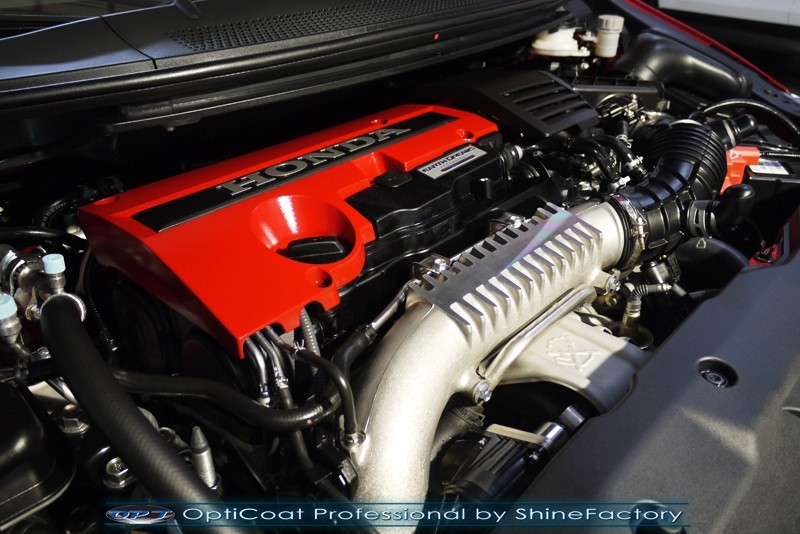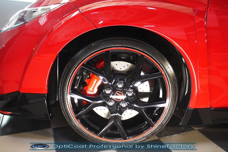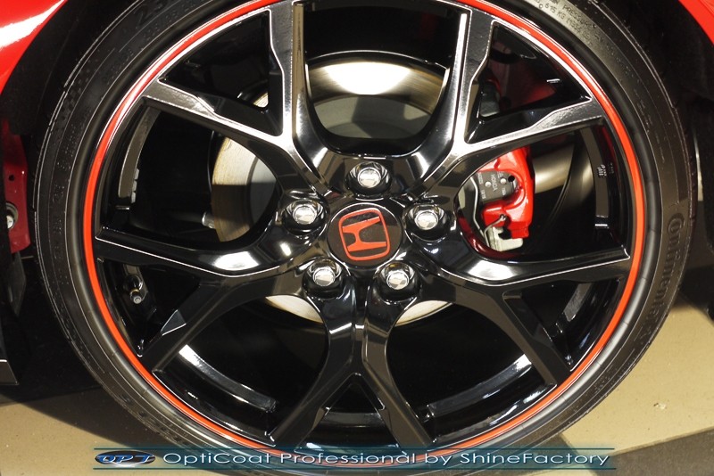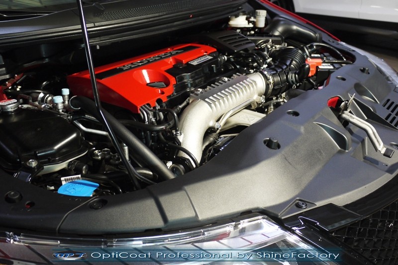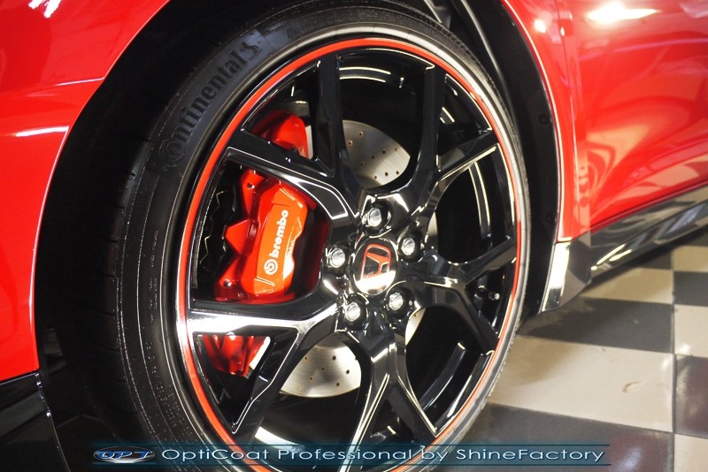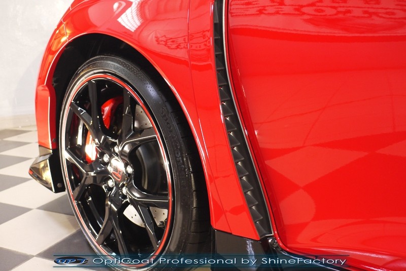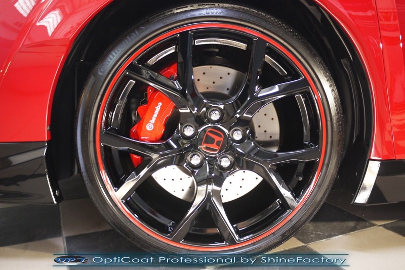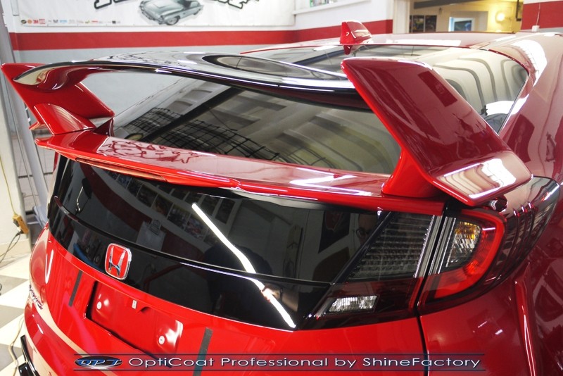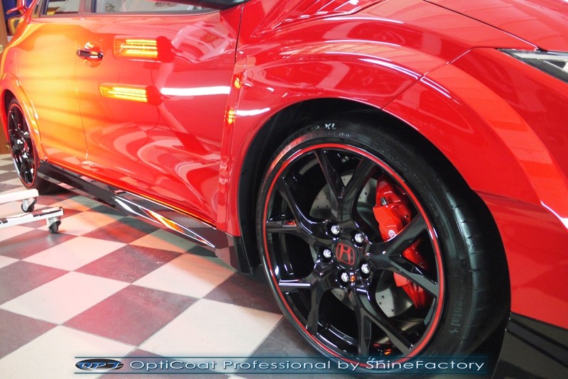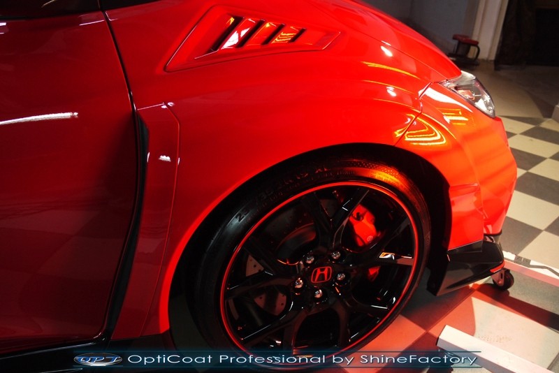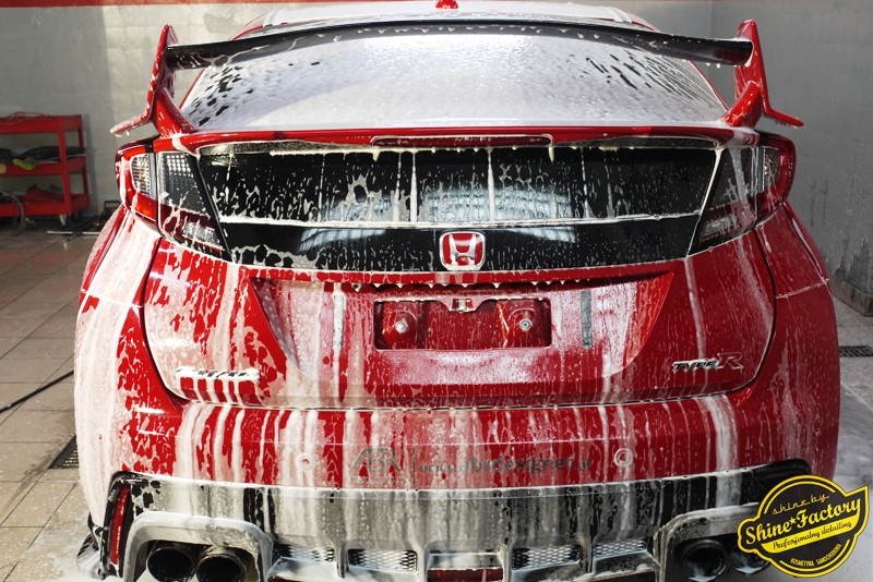 Witamy Was! Zapraszamy do relacji z zabezpieczenia febrycznie nowej, wściekle czerwonej Hondy Civic Typ-R! Auto trafiło do nas w celu szerokiego pakietu zabezpieczenia pakietem powłok ceramicznych. Oczywiście prace rozpoczęliśmy od ściągnięcia z auta kół i zajęcia się felgami oraz nadkolami, następnie przeszliśmy od dokładnego i dogłębnego oczyszczenia oraz glinkowania lakieru. Niestety szybko rzuciła nam się w oczy masa niedoskonałości lakieru, a przede wszystkim matowe placki na całym nadwoziu po zabiegach fabrycznych, musieliśmy go koniecznie poprawić przed aplikacją powłoki ceramicznej. Finalnie zastosowaliśmy wyjątkową powłokę 9H+ Optimum OptiCoat Professional certyfikowaną prze TUV, która na końcu została utwardzona w odpowiedniej temp. lampami IR. Oczywiście zajęliśmy się, także zabezpieczeniem pakietem powłok wszelkich innych elementów jak szyby (tytanową powłoką hydrofobową), felgi, lampy, elementy nielakierowane powłoką DLUX (która odżywiła i nadała efektu hydrofobowego plastikom) czy nawet końcówki wydechu, oczywiście po przygotowaniu i możliwej renowacji. Zajęliśmy się, także komorą 310 konnego silnika oraz całym wnętrzem aby na długo było świeże i matowe. Po kilkudziesięciu godzinach pracy auto nabrało perfekcyjnego wyglądu, krwistej połyskliwej czerwieni oraz ceramicznej ochrony na bardzo długi czas. Zapraszamy do szerokiej fotorelacji!