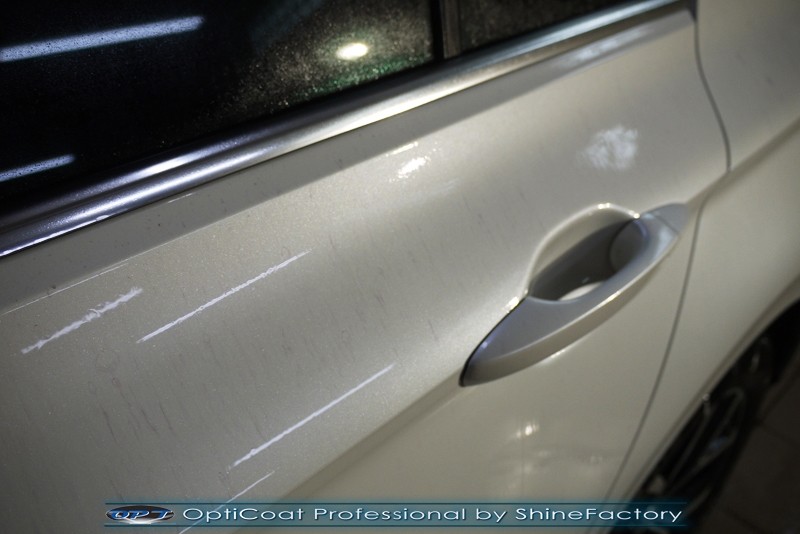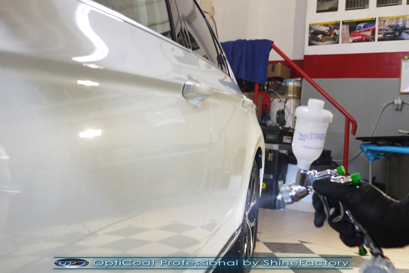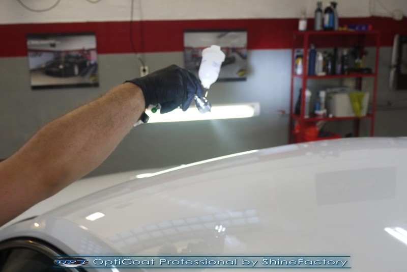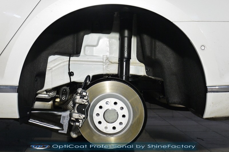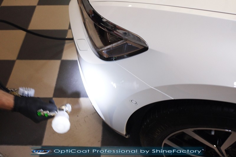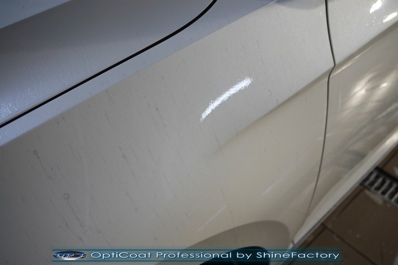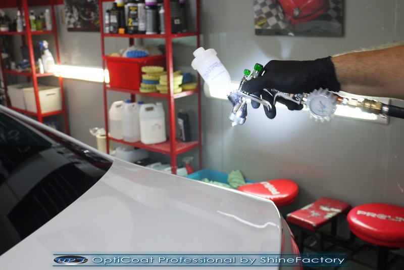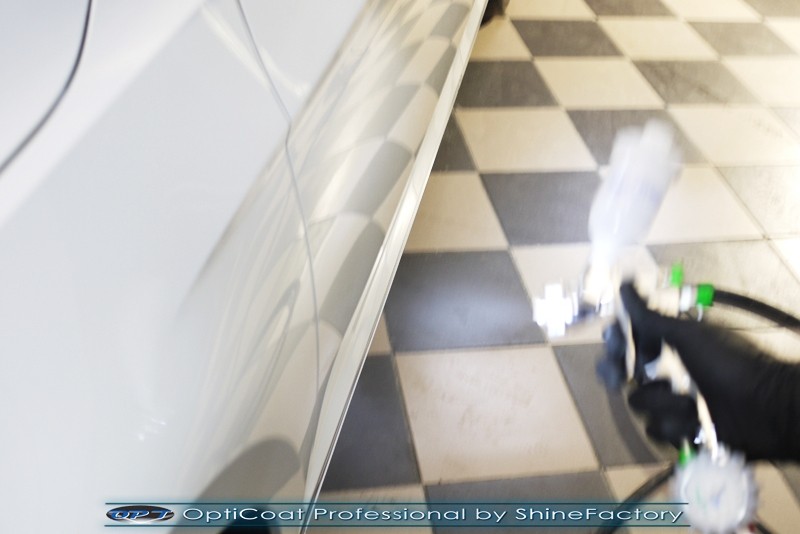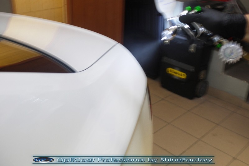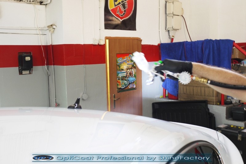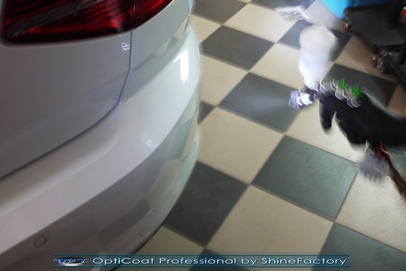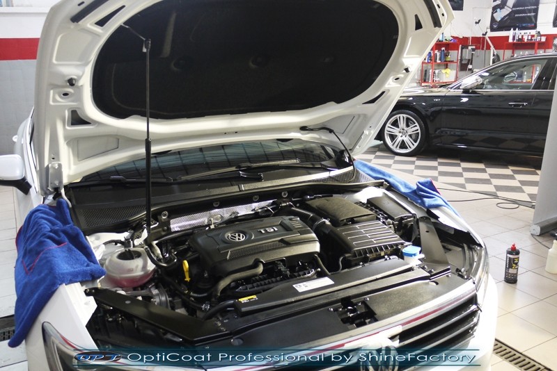 Dziś chcemy przedstawić relację z przykładowego idealnego zabezpieczenia nowego auta. Nowy Volkswagen w perłowo białym lakierze zostało nam powierzone zaraz po wyjeździe z salonu w celu jak najmocniejszego zabezpieczenia każdego elementu auta. Prace zaczęliśmy od detailingu nadkoli oraz wnętrza felg, zabezpieczyliśmy powłokami zaciski hamulcowe oraz felgi od wewnątrz. Następnie całe auto zostało dokładnie oczyszczone z zabrudzeń oraz fabrycznych zabezpieczeń. Lakier ogólnie posiadający miejscowe uszkodzenia, został poddany lekkiej korekcie oraz dokładnie odtłuszczony. Następnie przeszliśmy do aplikacji powłok na każdy element auta jak lakier, szyby, plastiki, felgi itp itd. Najważniejsze, na sam lakier zaaplikowaliśmy w skomplikowany natryskowy sposób maksymalnie grubą warstwę kompozytu ceramicznego (100% powłoki na aucie) 9H+ opartego na SiC Optimum OptiCoat Professional połączoną z powłoką GlossCoat, która zapewniła maksymalny połysk i ochronę na bardzo długi czas. Po aplikacji, całe auto zostało wygrzane lampami IR w odpowiedniej temperaturze w celu utwardzenia powłok. Oczywiście zajęliśmy się także komorą silnika oraz wnętrzem auta, które zabezpieczyliśmy kosmetykami z najwyższej półki a skóry porządnie zaimpregnowaliśmy. Zapraszamy do ciekawej fotorelacji.