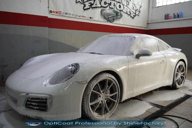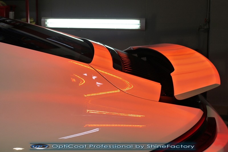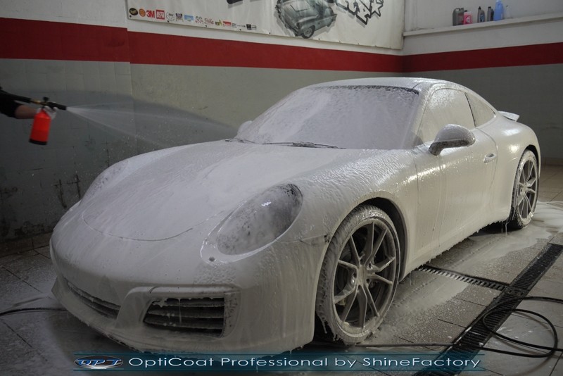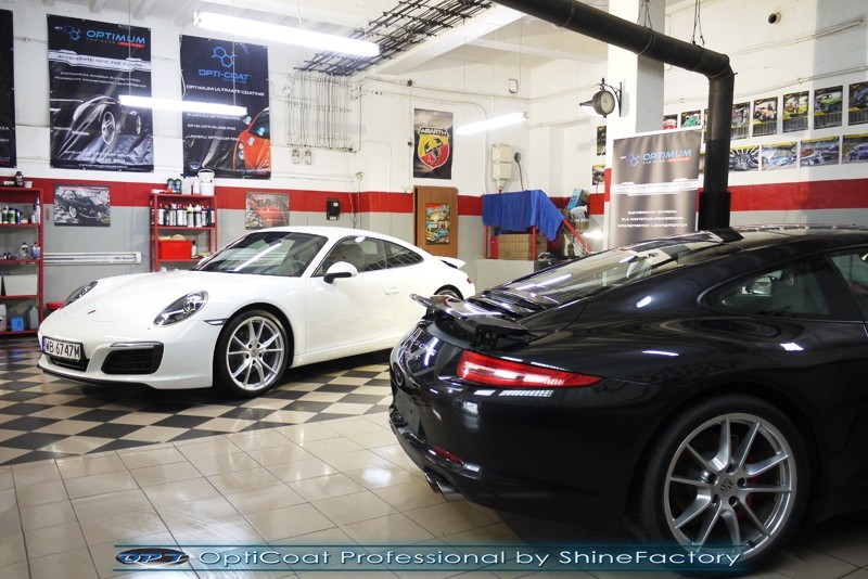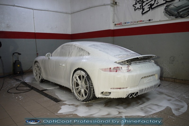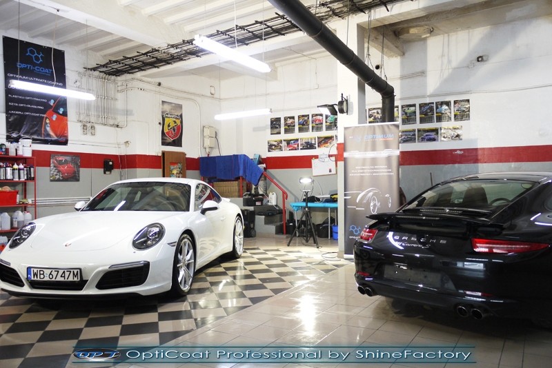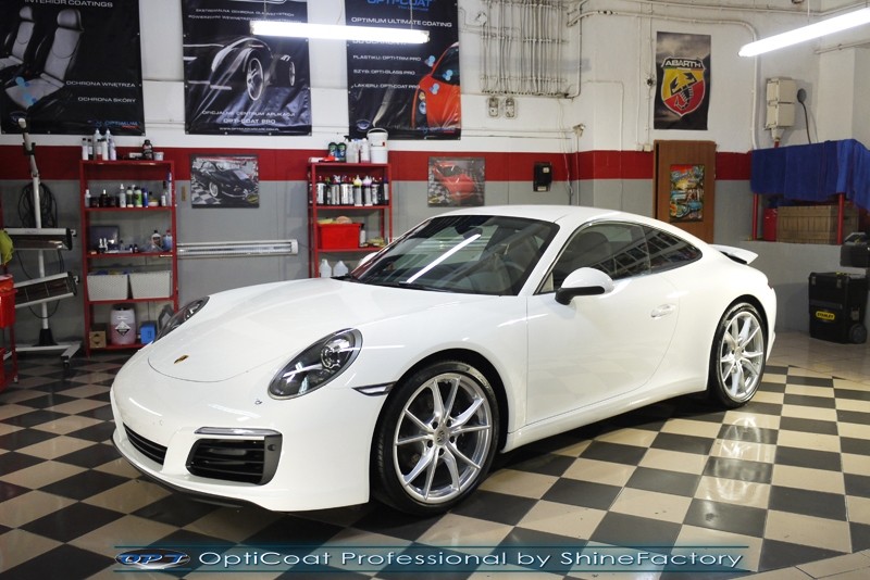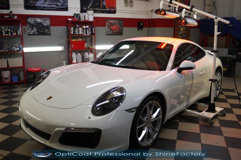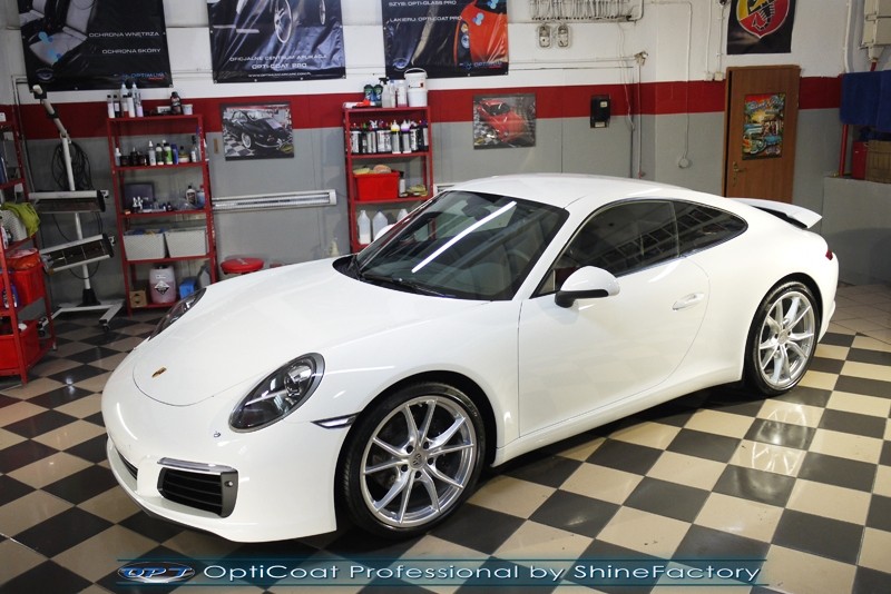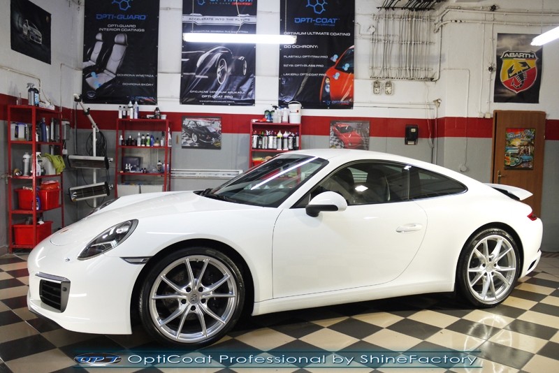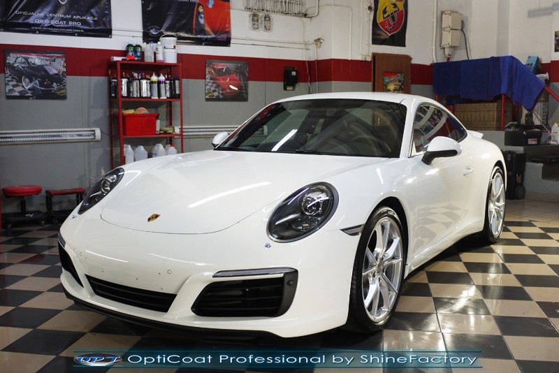 Witamy! Tym razem mieliśmy przyjemność zająć się najnowszym modelem Porsche 911 w białym niemetalicznym lakierze, które właściciel powierzył nam w celu wzmocnienia delikatnego lakieru w szczególności zabezpieczenia na powoli zbliżający się ciężki zimowy okres. Głównym zadaniem było zabezpieczenie całego nadwozia pakietem najlepszych powłok ceramicznych świata, dlatego prace rozpoczęliśmy od specjalistycznego dogłębnego oczyszczenia z zabrudzeń oraz fabrycznych zabezpieczeń. Lakier przed aplikacją zaawansowanego zabezpieczania został doprowadzony do ideału oraz dokładnie odtłuszczony. Następnie przeszliśmy do aplikacji powłok na każdy element auta jak lakier, szyby, plastiki, felgi itp itd. Na całe auto zaaplikowaliśmy poprzez metodę natryskową 100% kompozytu ceramicznego 9H+ opartego na SiC Optimum OptiCoat Professional połączoną z powłoką GlossCoat, która zapewniła maksymalny połysk i ochronę na bardzo długi czas. Po aplikacji, całe auto zostało wygrzane lampami IR w odpowiedniej temperaturze w celu utwardzenia powłok. Zapraszamy do fotorelacji z prac.