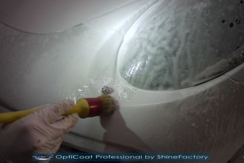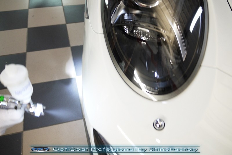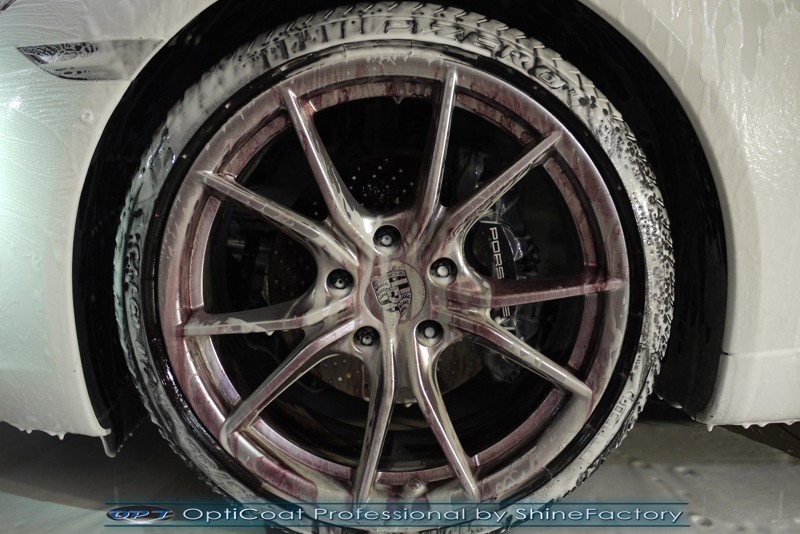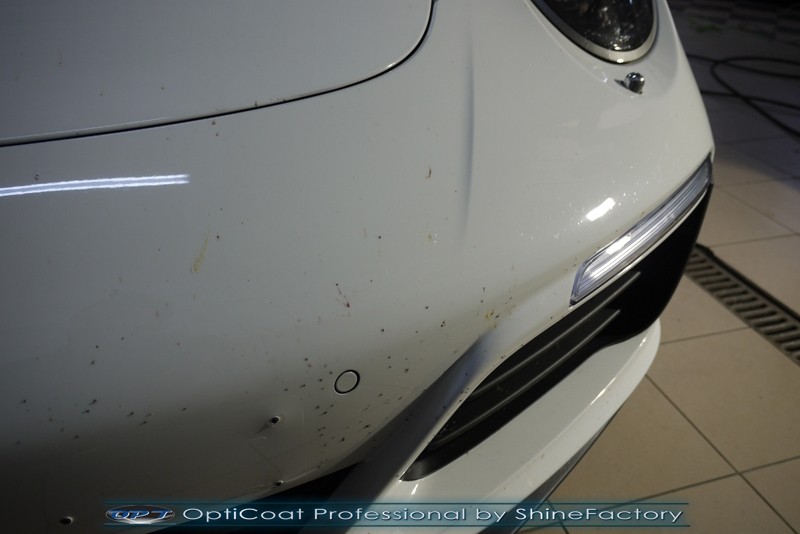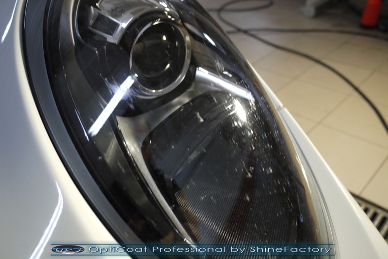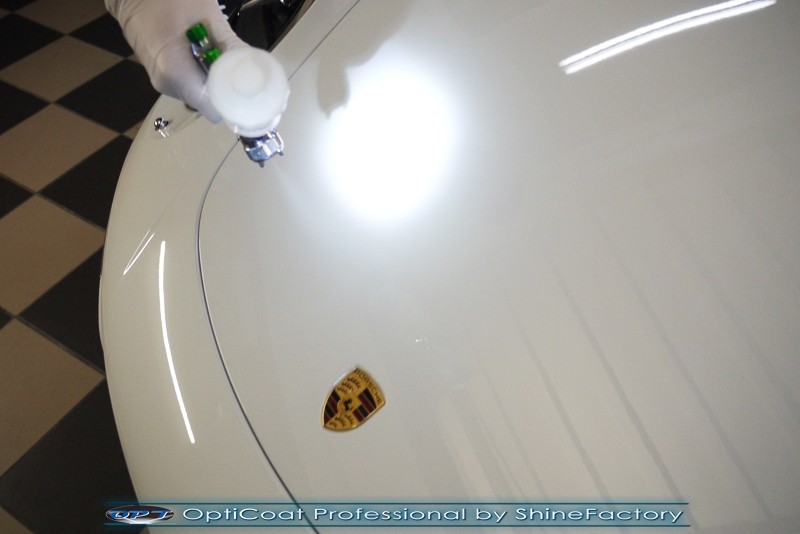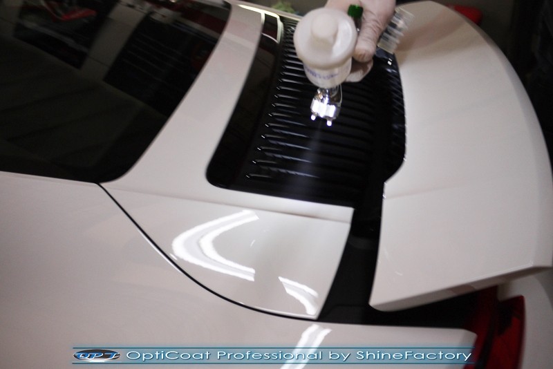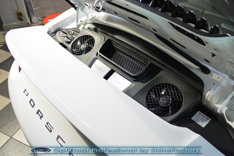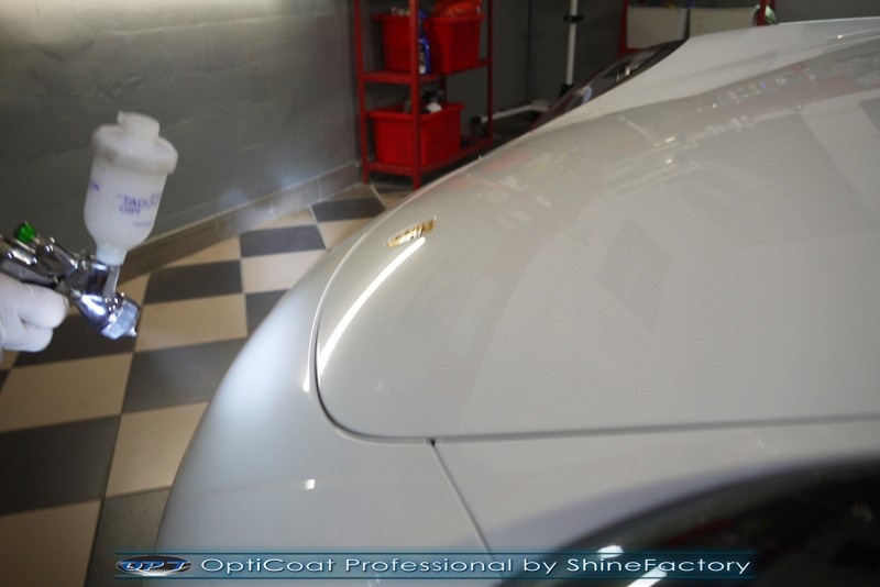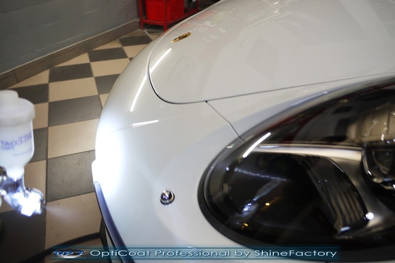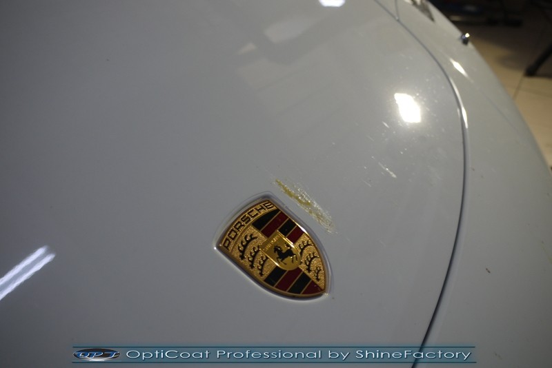 Witamy! Tym razem mieliśmy przyjemność zająć się najnowszym modelem Porsche 911 w białym niemetalicznym lakierze, które właściciel powierzył nam w celu wzmocnienia delikatnego lakieru w szczególności zabezpieczenia na powoli zbliżający się ciężki zimowy okres. Głównym zadaniem było zabezpieczenie całego nadwozia pakietem najlepszych powłok ceramicznych świata, dlatego prace rozpoczęliśmy od specjalistycznego dogłębnego oczyszczenia z zabrudzeń oraz fabrycznych zabezpieczeń. Lakier przed aplikacją zaawansowanego zabezpieczania został doprowadzony do ideału oraz dokładnie odtłuszczony. Następnie przeszliśmy do aplikacji powłok na każdy element auta jak lakier, szyby, plastiki, felgi itp itd. Na całe auto zaaplikowaliśmy poprzez metodę natryskową 100% kompozytu ceramicznego 9H+ opartego na SiC Optimum OptiCoat Professional połączoną z powłoką GlossCoat, która zapewniła maksymalny połysk i ochronę na bardzo długi czas. Po aplikacji, całe auto zostało wygrzane lampami IR w odpowiedniej temperaturze w celu utwardzenia powłok. Zapraszamy do fotorelacji z prac.
