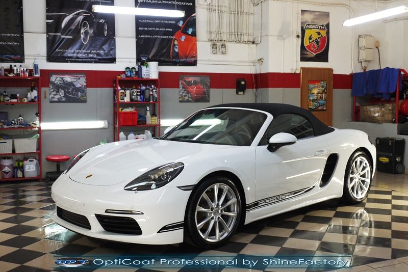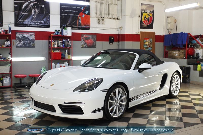Witamy! Dziś zapraszamy do fotorelacji z prac nad Porsche 718 Boxster. Auto zostało nam powierzone niedługo po wyjeździe z salonu w celu jak najgrubszego i jak najmocniejszego możliwego zabezpieczenia powłoką ceramiczną. Oczywiście prace rozpoczęliśmy od zdjęcia z auta kół i zabezpieczenia nadkoli oraz felg. Następnie przeszliśmy do dokładnego oczyszczenia całego nadwozia z naleciałości oraz zabezpieczeń fabrycznych i dogłębnego wyglinkowania lakieru. Następnie poprawiliśmy niedoskonałości pofabryczne oraz zaaplikowaliśmy w natryskowy sposób grubą warstwę powłoki 9H+ Optimum OptiCoat Professional potwierdzoną testami TUV, pokrywając ją dla maksymalnego efektu wizualnego powłoką GlossCoat, która na końcu została utwardzona w odpowiedniej temp. lampami IR. Oczywiście zajęliśmy się, także zabezpieczeniem pakietem powłok wszelkich innych elementów jak szyby (Gtechniq G1), felgi (DLUX), lampy czy elementy nielakierowane a także zaimpregnowaliśmy materiałowy dach. Zajęliśmy się, także całym wnętrzem aby zabezpieczyć je w każdym detalu różnymi kosmetykami. Auto otrzymało także od nas boczne naklejki. Po kilkudziesięciu godzinach pracy auto nabrało perfekcyjnego wyglądu, połysku oraz co najważniejsze najmocniejszej ceramicznej ochrony na bardzo długi czas. Zapraszamy do szerokiej fotorelacji!
