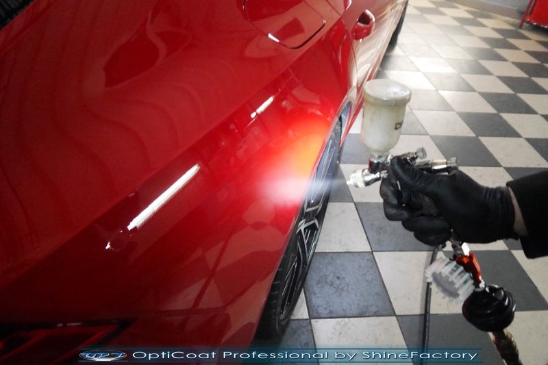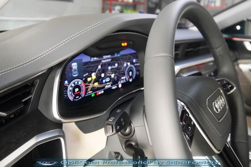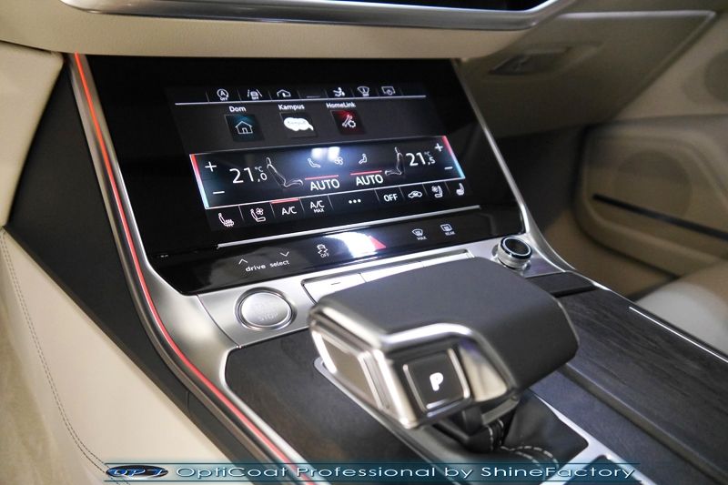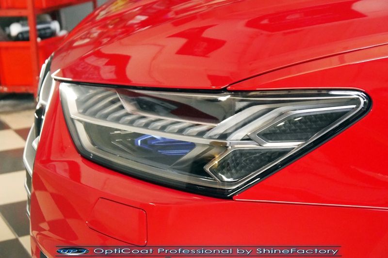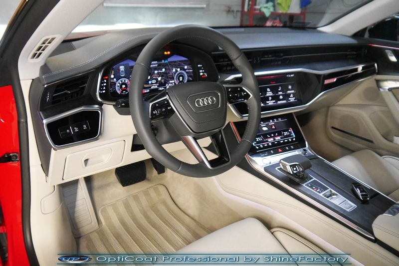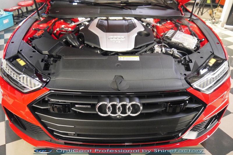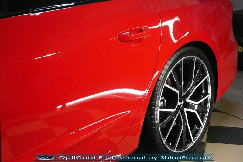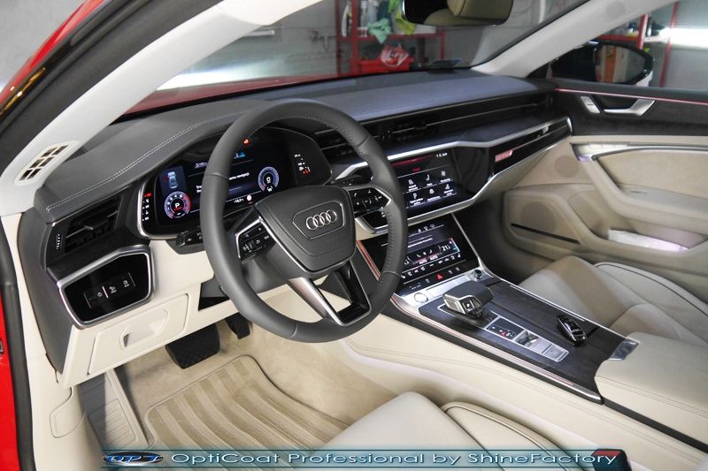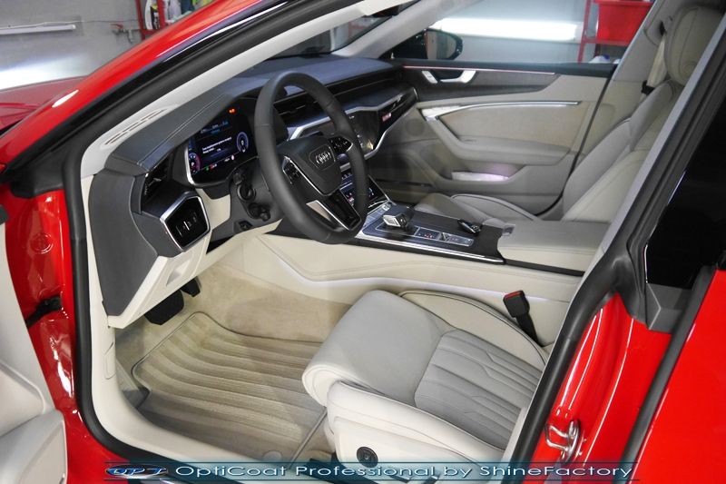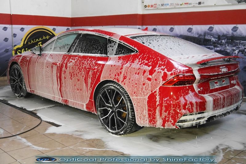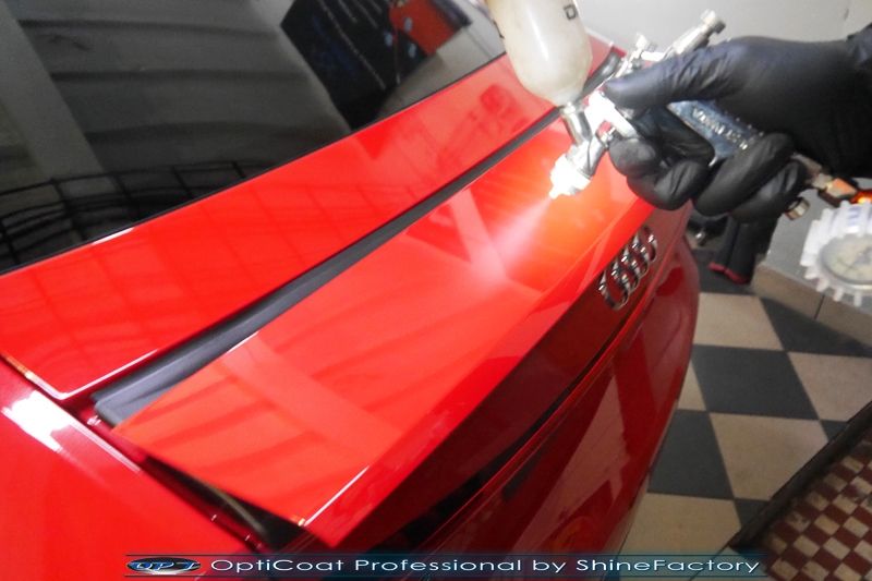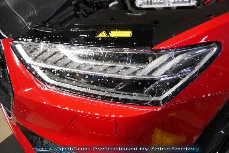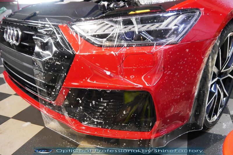 Oczywiście prace rozpoczęliśmy od zdjęcia z auta kół i zabezpieczenia nadkoli, felg oraz zacisków hamulcowych powłokami ceramicznymi. Kolejno przeszliśmy do dokładnego oczyszczenia całego nadwozia z naleciałości oraz delikatnej korekty aby usunąć po fabryczne/transportowe niedoskonałości. Następnie przystąpiliśmy do aplikacji bezbarwnych folii ochronnych na najbardziej narażone na mocne uszkodzenia el. auta, oczywiście zdecydowaliśmy się jak zawsze wybrać produkt bezkonkurencyjny i nowoczesny na rynku, czyli folie Premium Shield Self Healing. Po aplikacji folii przeszliśmy do zabezpieczania wszelkich el. auta powłokami, zaaplikowaliśmy w natryskowy sposób grubą warstwę powłoki 9H+ Optimum OptiCoat Professional potwierdzoną testami TUV, pokrywając ją dla maksymalnego efektu wizualnego powłoką GlossCoat, która na końcu została utwardzona w odpowiedniej temp. lampami IR. Oczywiście zajęliśmy się, także zabezpieczeniem pakietem powłok wszelkich innych elementów jak szyby (Gtechniq G1), felgi (DLUX), lampy czy elementy nielakierowane . Nie pominęliśmy zajęcia się wnętrzem aby zabezpieczyć je w każdym detalu różnymi kosmetykami skupiając się na impregnacji delikatnych skór. Po kilkudziesięciu godzinach pracy Audi nabrało perfekcyjnego wyglądu, połysku oraz co najważniejsze najmocniejszej praktycznie pancernej ochrony na lata. Zapraszamy do szerokiej fotorelacji!
