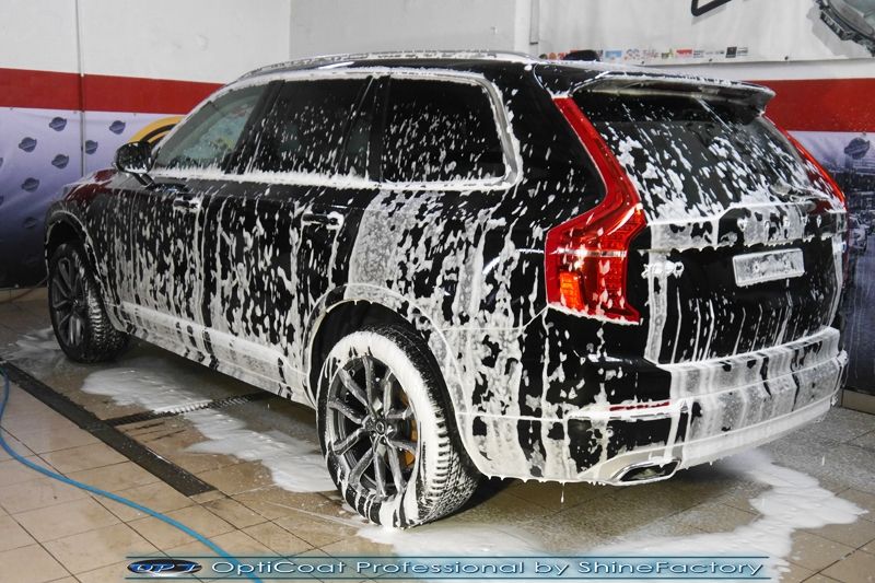 Witamy! Dziś zapraszamy Państwa do fotorelacji z prac nad Volvo XC90 w czarnym lakierze. Auto zostało nam oddane wprost po wyjeździe z salonu w celu jak najgrubszego i jak najmocniejszego możliwego zabezpieczenia pakietem powłok ceramicznych. Volvo przeszło nasz szeroki pakiet NewShine więc prócz zabezpieczenia kompletem ceramiki nadwozia, zdjęliśmy z auta koła w celu dokładnego detailingu nadkoli, wnętrza felg oraz zacisków hamulcowych. Całe wnętrze zostało zaimpregnowane kosmetykami najwyższej ligi z naciskiem na zabezpieczenie skór, el. plastikowych oraz materiałowych. Prace nad nadwoziem rozpoczęliśmy od dokładnego oczyszczenia i odtłuszczenia, następnie lakier przeszedł delikatną korektę w celu uzyskania perfekcyjnego efektu finalnego (nawet nowe auta już po wyjeździe z salonu posiadają uszkodzenia lakieru jak mikrorysy oraz zmatowienia). Po tych czynnościach przeszliśmy do aplikacji powłok na wszelkie elementy jak lakier, szyby (bezapelacyjnie najlepszą powłoką Gtechniq G1), lampy, felgi (pancerny CQ DLUX), detale itp itd. Najważniejsze, na sam lakier zaaplikowaliśmy maksymalnie grubą natryskową warstwę kompozytu ceramicznego (100% powłoki na aucie) opartego na SiC- OptiCoat Professional połączoną z powłoką GlossCoat, która zapewni ochronę, zminimalizowane brudzenie oraz ułatwione do maksimum mycie. Nie pominęliśmy zajęcia się komorą silnika aby na długi czas prezentowała się świeżo i schludnie. Dodatkowo próg bagażnika został zabezpieczony bezbarwną folią samoregenerującą. Finalnie całe auto zostało wygrzane lampami IR w odpowiedniej temperaturze w celu utwardzenia. Zapraszamy do szerokiej fotorelacji!