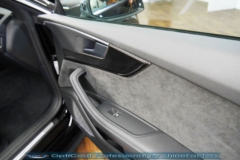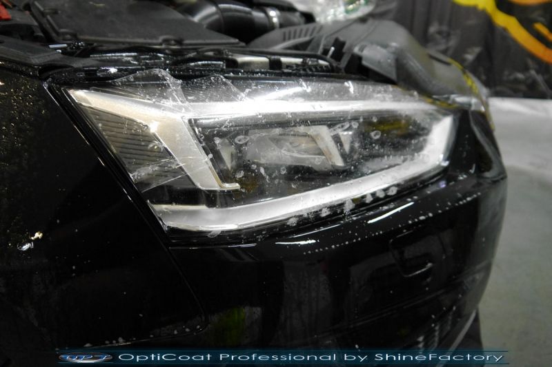 Oczywiście prace rozpoczęliśmy od dokładnego oczyszczenia całego nadwozia z naleciałości oraz delikatnej korekty aby usunąć po fabryczne/transportowe niedoskonałości oraz zmatowienie/mikrorysy które już powstały przez krótki czas użytkowania auta. Następnie przystąpiliśmy do aplikacji bezbarwnych folii ochronnych na najbardziej narażone na mocne uszkodzenia el. auta, oczywiście zdecydowaliśmy się jak zawsze wybrać produkt bezkonkurencyjny i nowoczesny na rynku, czyli folie Premium Shield Self Healing. Po aplikacji folii przeszliśmy do zabezpieczania wszelkich el. auta powłokami, zaaplikowaliśmy w natryskowy sposób grubą warstwę powłoki 9H+ Optimum OptiCoat Professional potwierdzoną testami TUV, pokrywając ją dla maksymalnego efektu wizualnego powłoką GlossCoat, która na końcu została utwardzona w odpowiedniej temp. lampami IR. Oczywiście zajęliśmy się, także zabezpieczeniem pakietem powłok wszelkich innych elementów jak szyby (Gtechniq G1), felgi (DLUX), lampy czy elementy nielakierowane . Nie pominęliśmy zajęcia się wnętrzem aby zabezpieczyć je w każdym detalu różnymi kosmetykami skupiając się na impregnacji delikatnych skór. Po kilkudziesięciu godzinach pracy Audi nabrało perfekcyjnego wyglądu, połysku oraz co najważniejsze najmocniejszej praktycznie pancernej ochrony na lata. Zapraszamy do szerokiej fotorelacji!