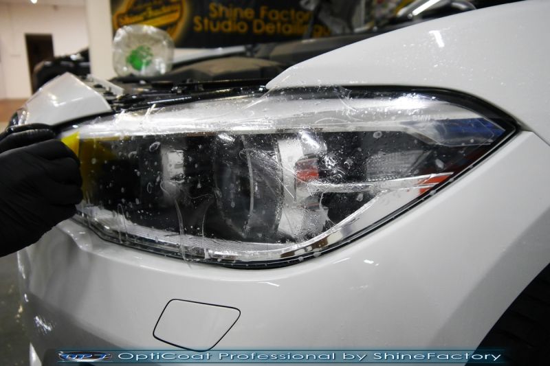 Oczywiście prace rozpoczęliśmy od dokładnego oczyszczenia całego nadwozia z naleciałości oraz odświeżenia lakieru aby usunąć niedoskonałości powstałe na lakierze (zmatowienie, mikrorysy, wżery itp). W miarę możliwości także uzupełniliśmy odpryski od kamieni na froncie auta. Następnie przystąpiliśmy do aplikacji bezbarwnych folii ochronnych na najbardziej narażone na mocne uszkodzenia el. auta, oczywiście zdecydowaliśmy się jak zawsze wybrać produkt bezkonkurencyjny i nowoczesny na rynku, czyli folie samoregenerujące SunTek Ultra PPF. Po aplikacji folii przeszliśmy do zabezpieczania wszelkich el. auta powłokami, zaaplikowaliśmy w natryskowy sposób grubą warstwę powłoki 9H+ Optimum OptiCoat Professional potwierdzoną testami TUV, pokrywając ją dla maksymalnego efektu wizualnego powłoką GlossCoat, która na końcu została utwardzona w odpowiedniej temp. lampami IR. Oczywiście zajęliśmy się, także zabezpieczeniem pakietem powłok wszelkich innych elementów jak szyby (Gtechniq G1), felgi (DLUX), lampy czy elementy nielakierowane. Po kilkudziesięciu godzinach pracy BMW odmieniło się nie do poznania i co najważniejsze nabrało najmocniejszej praktycznie pancernej ochrony na lata. Zapraszamy do szerokiej fotorelacji!