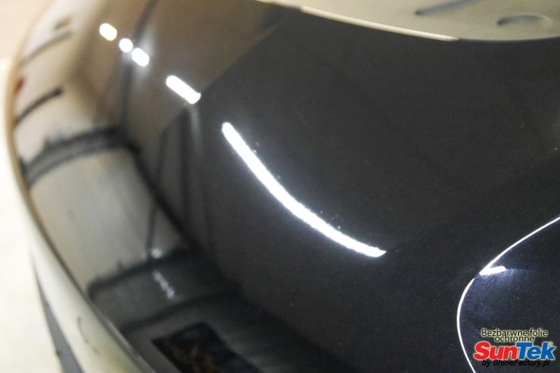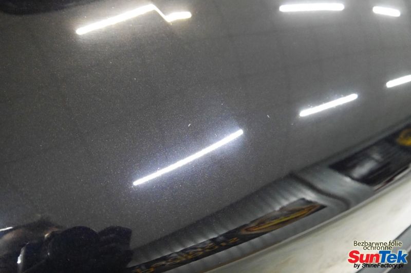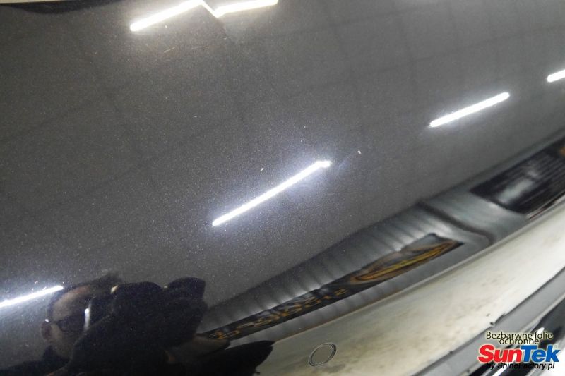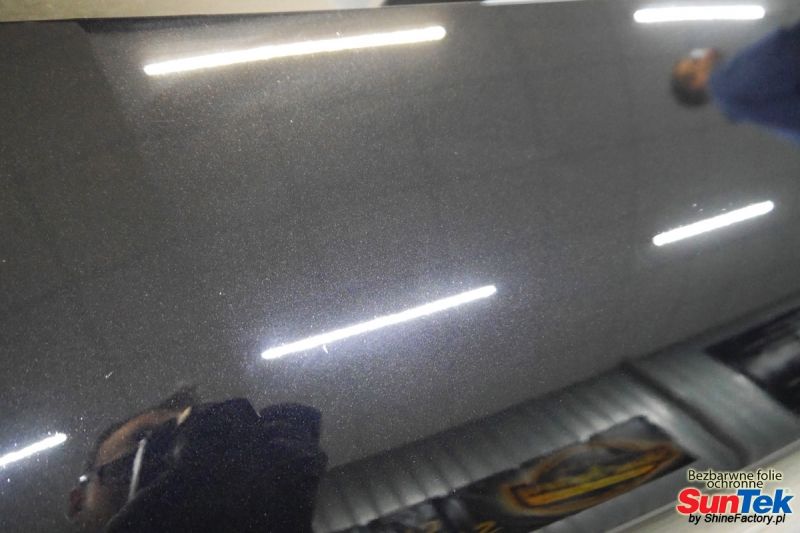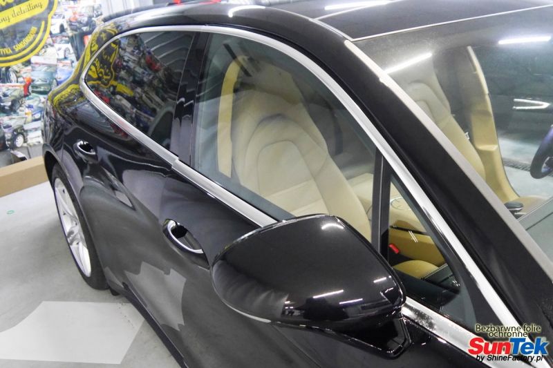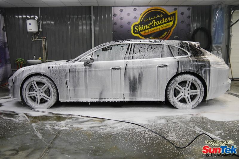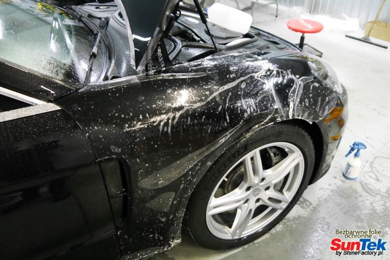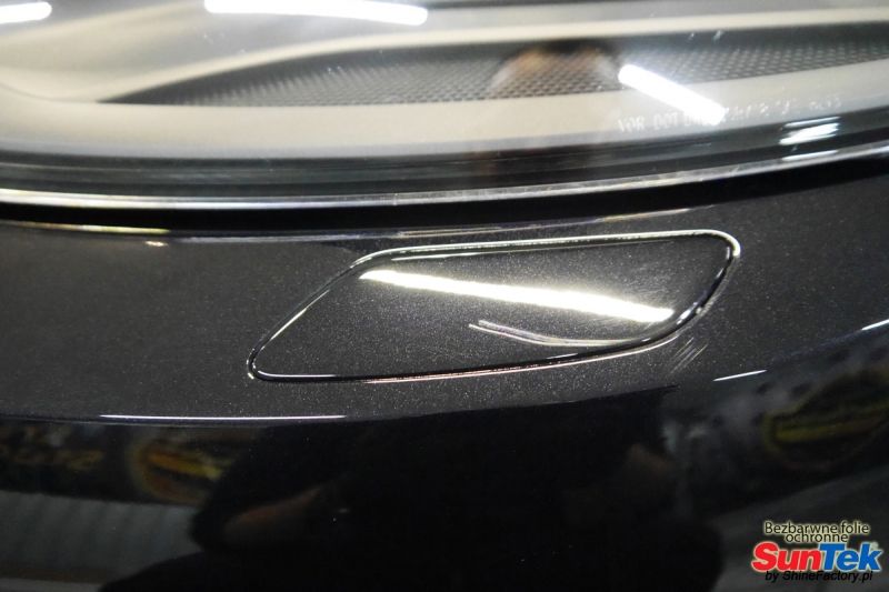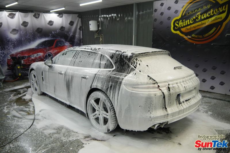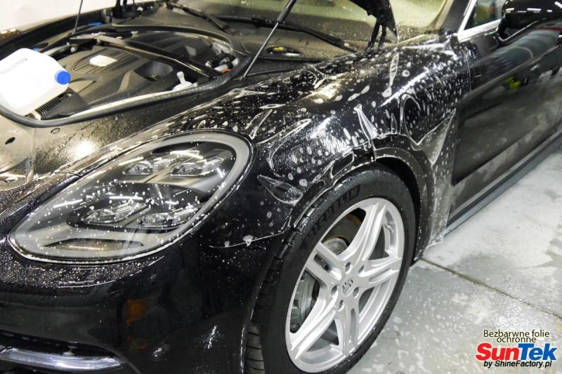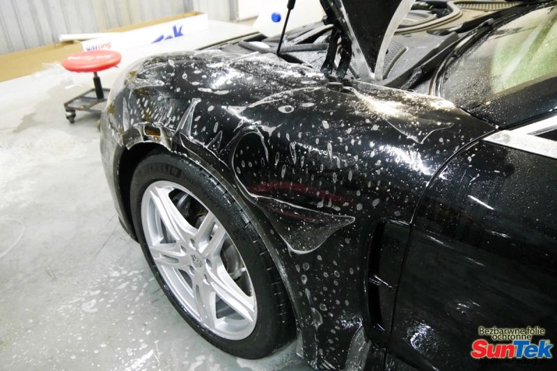 Tym razem mieliśmy przyjemność zająć się Porsche Panamera, która została nam powierzona w celu aplikacji bezbarwnych folii ochronnych na najbardziej newralgiczne elementy auta, czyli pełen front. Auto zostało nam oddane z niewielkim przebiegiem, kiedy już na froncie zaczęły pojawiać się odpryski od kamieni. Właściciel zadecydował aby uzupełnić zabezpieczone auto powłoką ceramiczną o bezbarwne folie ochronne na przednie elementy. Prace zaczęliśmy od bardzo dokładnego oczyszczenia auta co jest bardzo ważne przed następnymi etapami prac, następnie wypolerowaliśmy na ideał el. które miały zostać pokryte foliami. Oczywiście zastosowaliśmy najlepsze folie ochronne z rynku czyli SunTek Ultra PPF z 10 letnią gwarancją oraz regeneracją rys, a pokryliśmy nimi dokładnie-