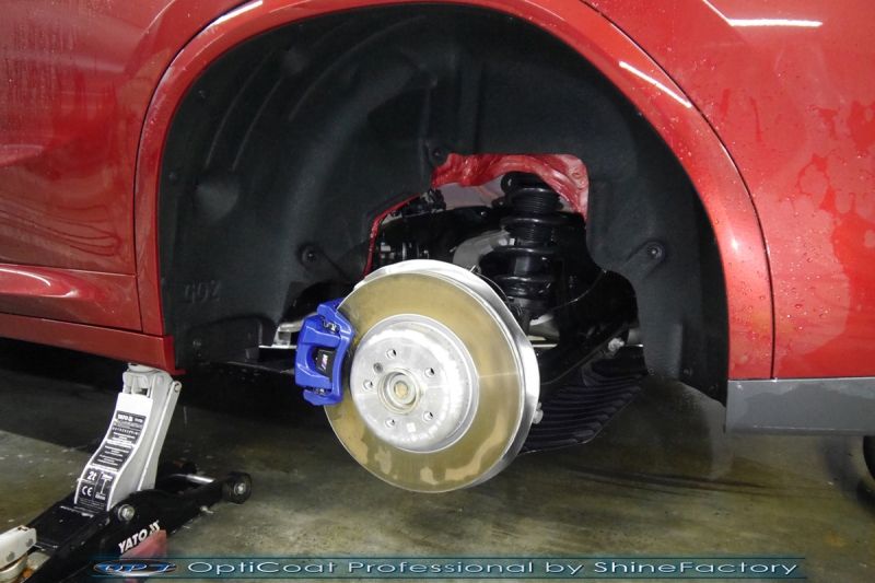 Oczywiście prace rozpoczęliśmy od dokładnego oczyszczenia całego nadwozia z naleciałości, zdjęliśmy z auta koła. Przeprowadziliśmy delikatną korektę aby usunąć po fabryczne/transportowe niedoskonałości. Następnie przystąpiliśmy do aplikacji bezbarwnych folii ochronnych na najbardziej narażone na mocne uszkodzenia el. auta, oczywiście zdecydowaliśmy się jak zawsze wybrać produkt bezkonkurencyjny i nowoczesny na rynku, czyli folie regeneracyjne SunTek Ultra PPF. Po aplikacji folii przeszliśmy do zabezpieczania wszelkich el. auta powłokami, zaaplikowaliśmy w natryskowy sposób grubą warstwę powłoki 9H+ Optimum OptiCoat Professional potwierdzoną testami TUV, pokrywając ją dla maksymalnego efektu wizualnego powłoką GlossCoat, która na końcu została utwardzona w odpowiedniej temp. lampami IR. Oczywiście zajęliśmy się, także zabezpieczeniem pakietem powłok wszelkich innych elementów jak szyby (Gtechniq G1), felgi (DLUX), lampy czy elementy nielakierowane . Nie pominęliśmy zajęcia się wnętrzem aby zabezpieczyć je w każdym detalu różnymi kosmetykami skupiając się na impregnacji delikatnych skór. Po kilkudziesięciu godzinach pracy BMW nabrało perfekcyjnego wyglądu, połysku oraz co najważniejsze najmocniejszej praktycznie pancernej ochrony na lata. Zapraszamy do szerokiej fotorelacji!