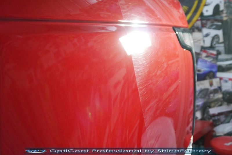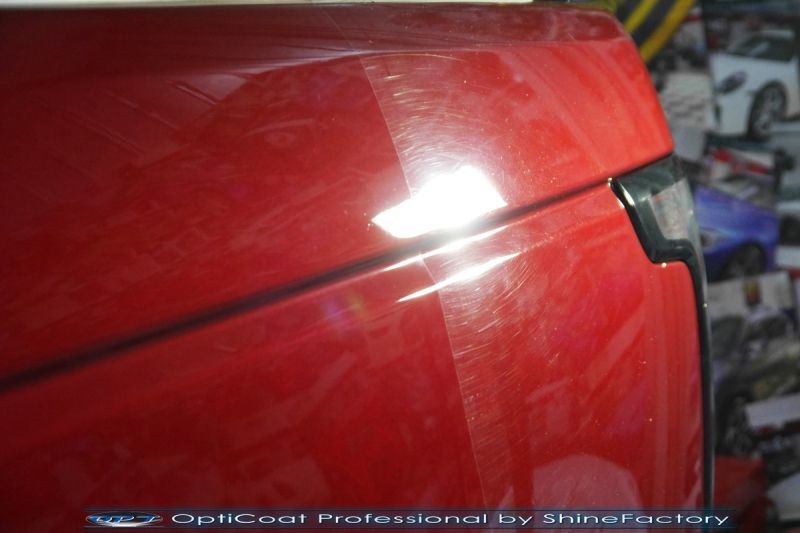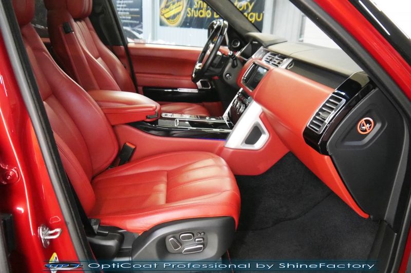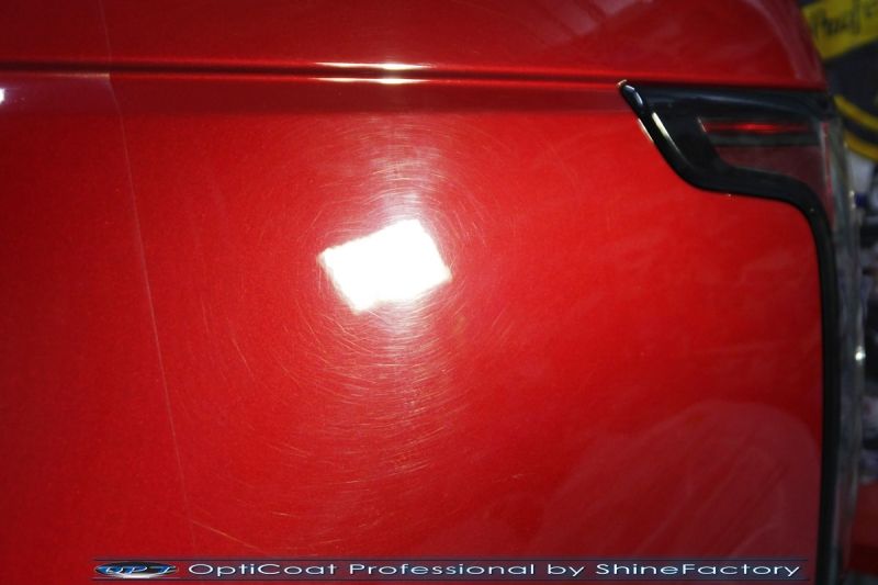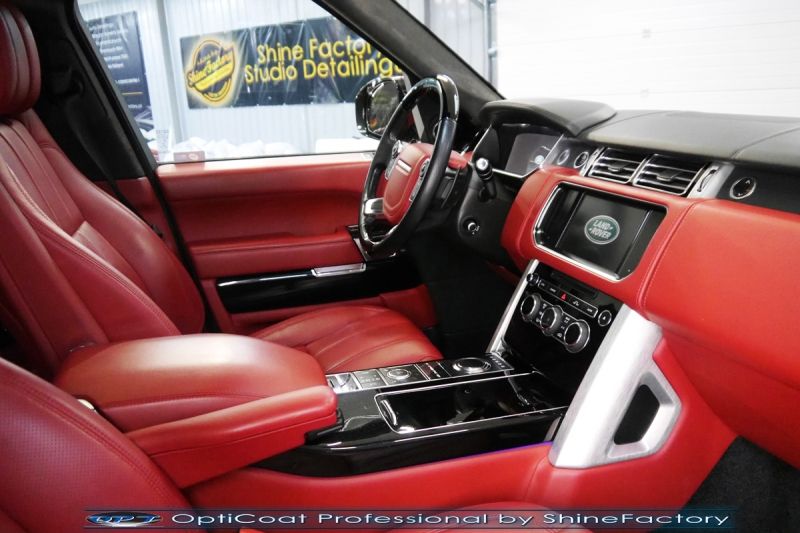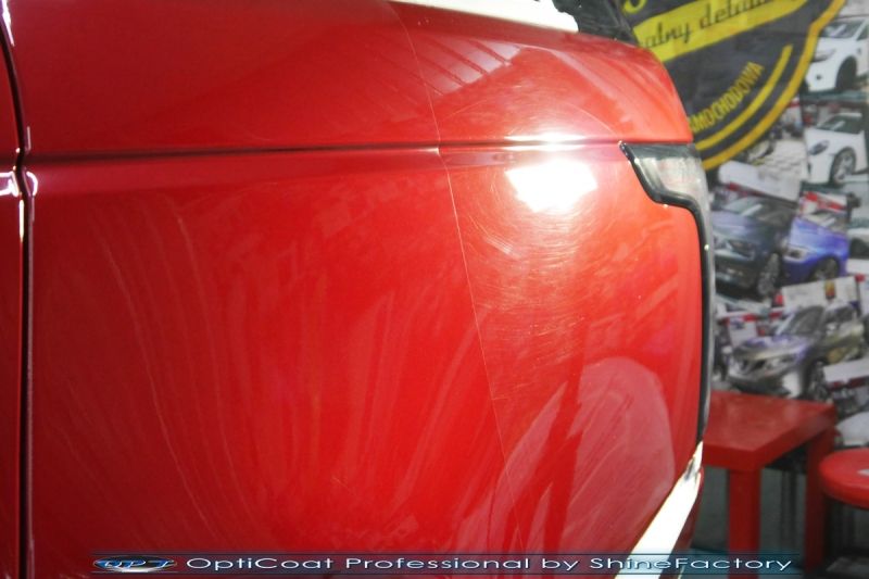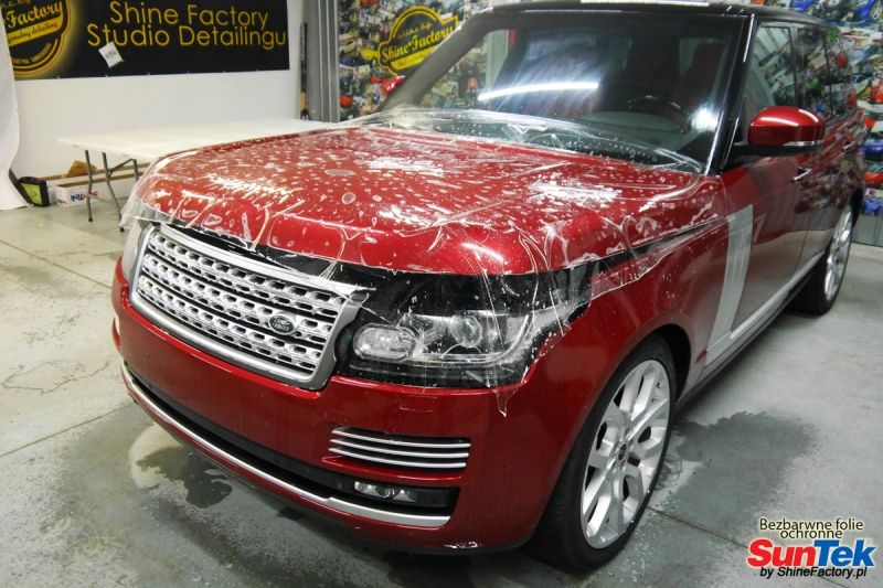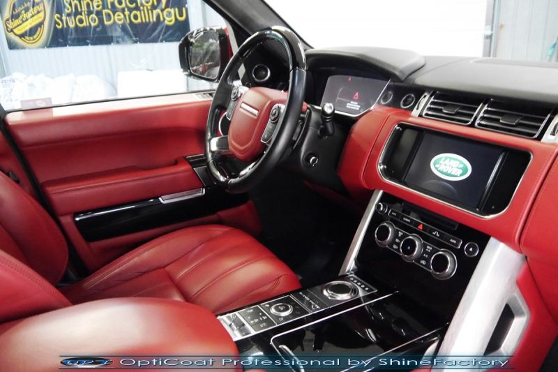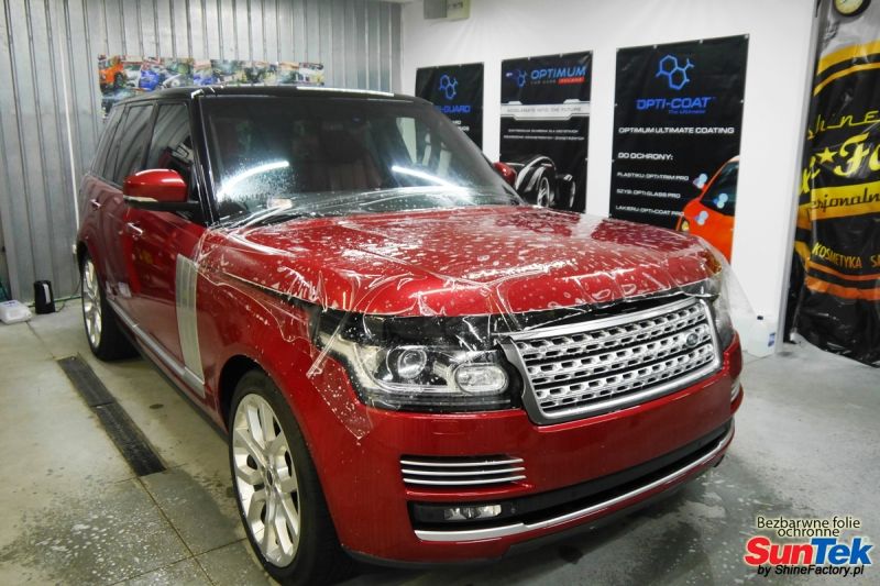 Oczywiście prace rozpoczęliśmy od dokładnego oczyszczenia całego nadwozia z naleciałości. Następnie przeprowadziliśmy korektę lakieru aby usunąć wszelkie niedoskonałości jak zarysowania, obcierki, zmatoweinie lakieru i wszystkich detali auta. Następnie przystąpiliśmy do aplikacji bezbarwnych folii ochronnych na najbardziej narażone na mocne uszkodzenia el. auta, oczywiście zdecydowaliśmy się jak zawsze wybrać produkt bezkonkurencyjny i nowoczesny na rynku, czyli folie regeneracyjne SunTek Ultra PPF (folie zostały położone na polakierowane elementy, niestety przód posiadał tak dużo odprysków, iż musiał zostać ponownie polakierowany przed zabezpieczeniem foliami). Po aplikacji folii przeszliśmy do zabezpieczania wszelkich el. auta powłokami, zaaplikowaliśmy w natryskowy sposób grubą warstwę powłoki 9H+ Optimum OptiCoat Professional potwierdzoną testami TUV, pokrywając ją dla maksymalnego efektu wizualnego powłoką GlossCoat, która na końcu została utwardzona w odpowiedniej temp. lampami IR. Oczywiście zajęliśmy się, także zabezpieczeniem pakietem powłok wszelkich innych elementów jak szyby (Gtechniq G1), felgi (DLUX), lampy czy elementy nielakierowane. Nie pominęliśmy zajęcia się wnętrzem które zostało dokładnie oczyszczone i zaimpregnowane w każdym detalu różnymi kosmetykami skupiając się na impregnacji delikatnych skór. Po kilkudziesięciu godzinach pracy Range Rover nabrał perfekcyjnego wyglądu, połysku oraz co najważniejsze najmocniejszej praktycznie pancernej ochrony na lata. Zapraszamy do szerokiej fotorelacji!